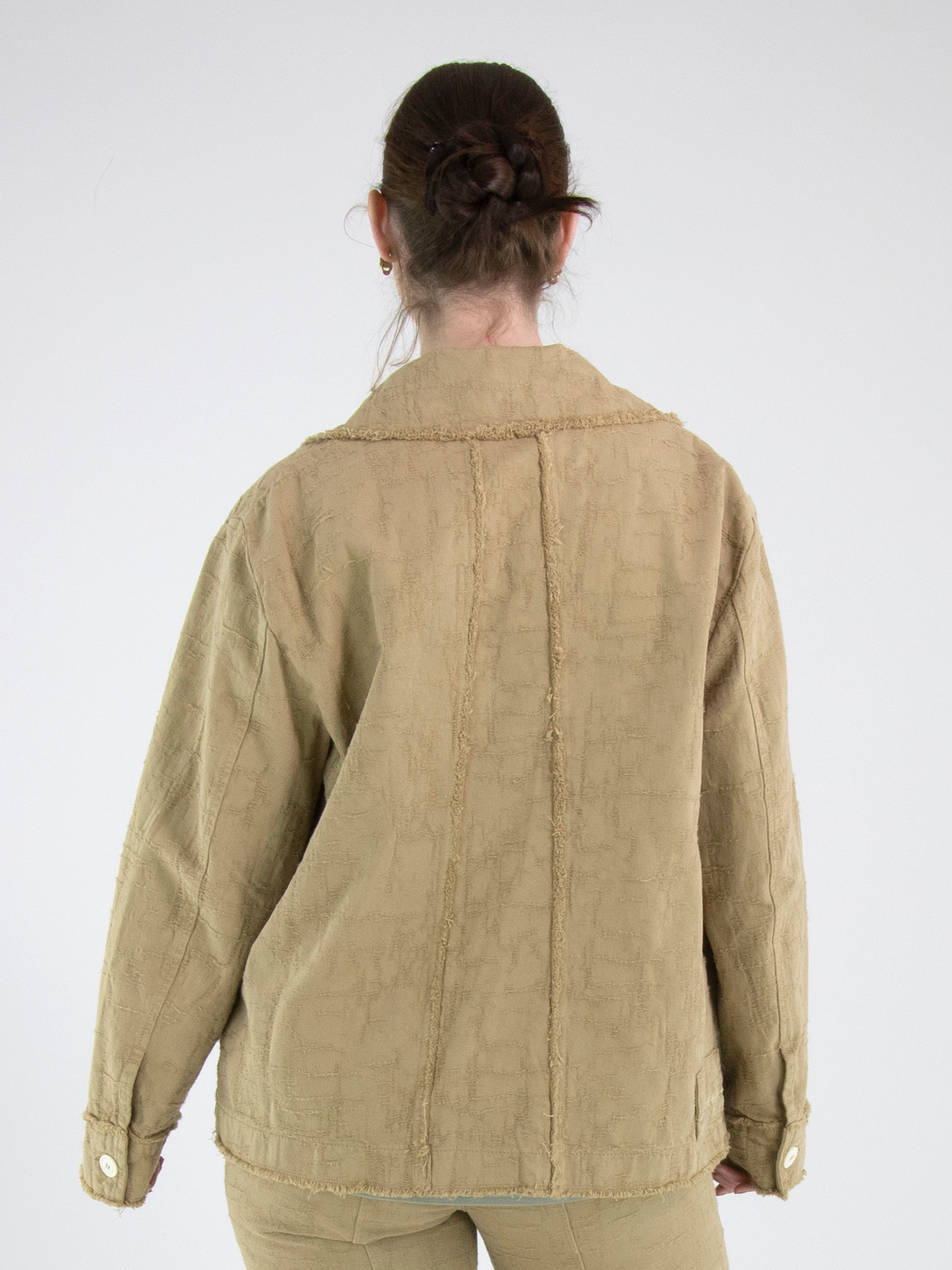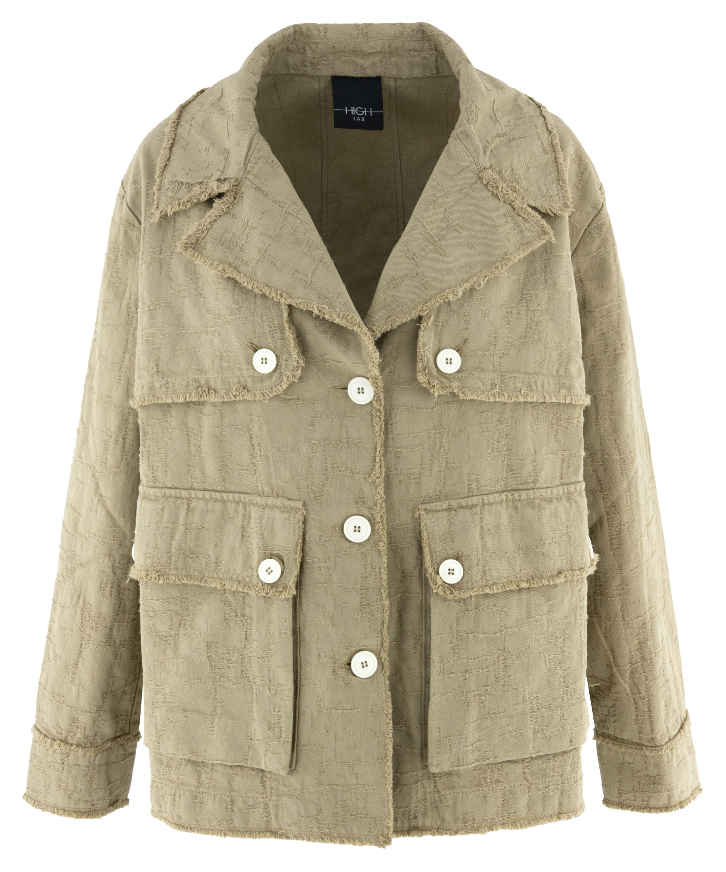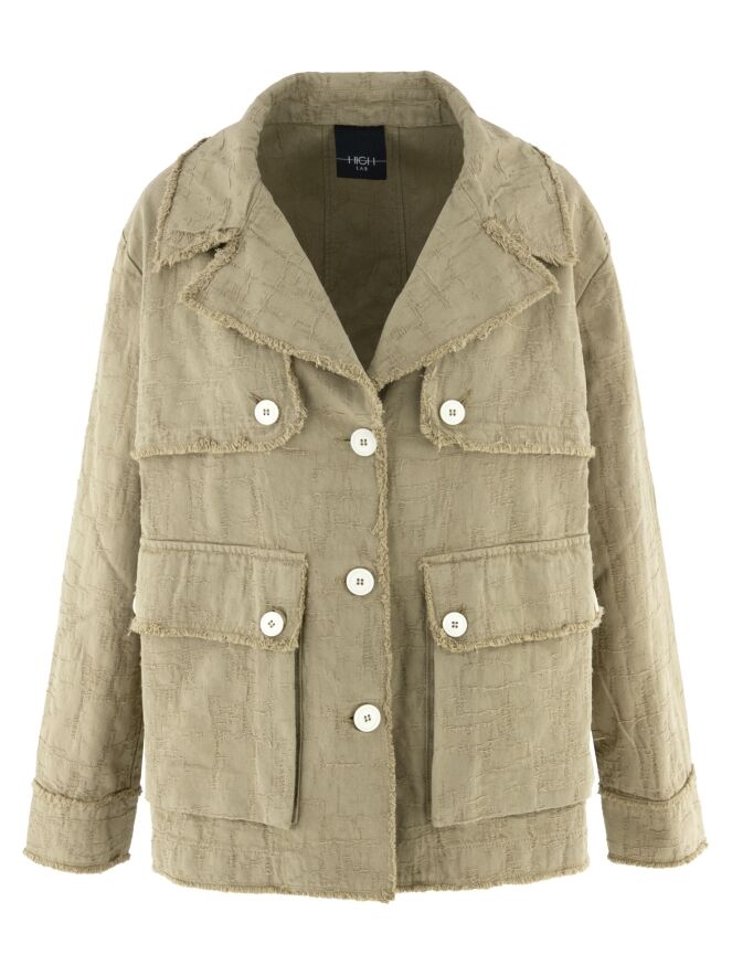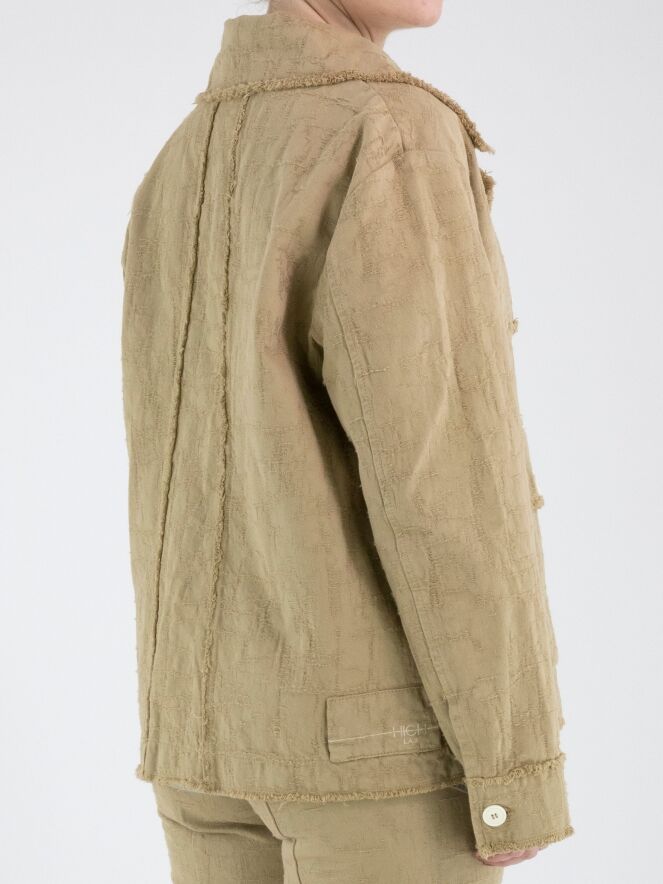 Ein weit geschnittener Blazer von High in Camel. Der Stoff weist eine sichtbare Struktur mit Gabardine-Optik auf. Alle Stoffkanten sind fein ausgefranst. Der Blazer hat einen Verschluss mit drei cremeweißen Knöpfen, die sich auch an den Brusttaschen und als Detail an der Gabardine wiederfinden. Dieser Blazer kann bei 30 Grad gewaschen werden.
