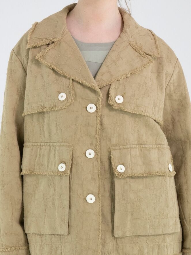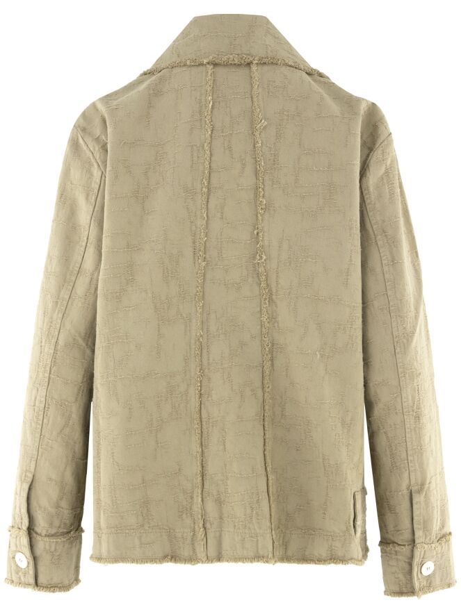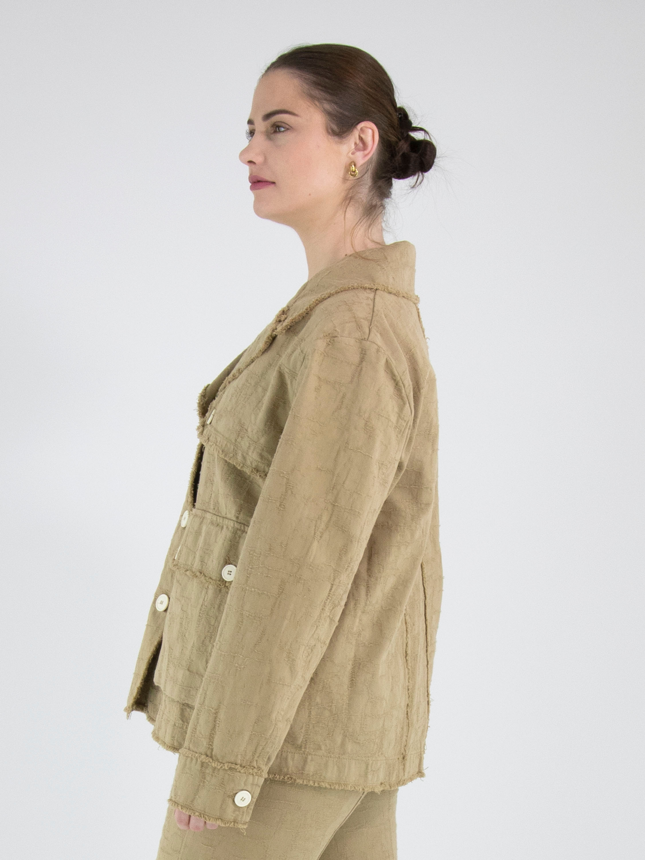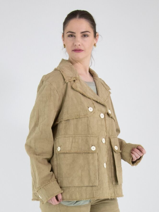 Ein weit geschnittener Blazer von High in Camel. Der Stoff weist eine sichtbare Struktur mit Gabardine-Optik auf. Alle Stoffkanten sind fein ausgefranst. Der Blazer hat einen Verschluss mit drei cremeweißen Knöpfen, die sich auch an den Brusttaschen und als Detail an der Gabardine wiederfinden. Dieser Blazer kann bei 30 Grad gewaschen werden.
