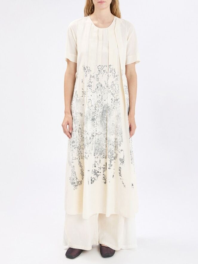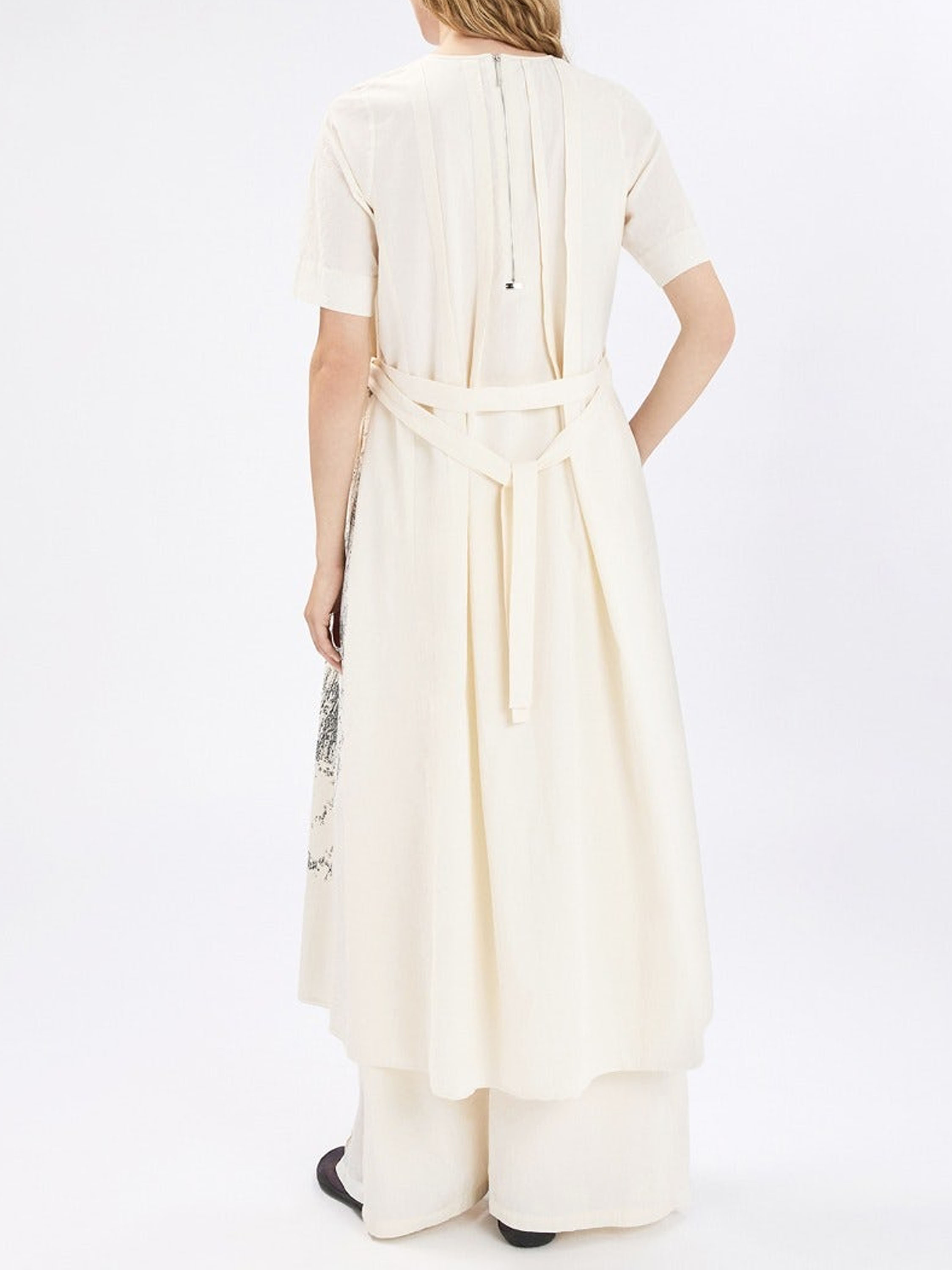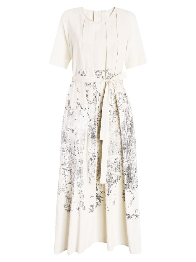 Kleid von High mit grafischem Print in Schwarz auf cremeweißem Grund. Vom Rundhalsausschnitt verlaufen mehrere Plisseefalten, von denen eine an der rechten Schulter umgeschlagen ist und so ein verspieltes, asymmetrisches Detail setzt. Ein Gürtel aus dem gleichen Stoff betont die Taille elegant. Mit kurzen Ärmeln und Eingrifftaschen versehen, sollte dieses exklusive Designerkleid per Hand gewaschen werden.