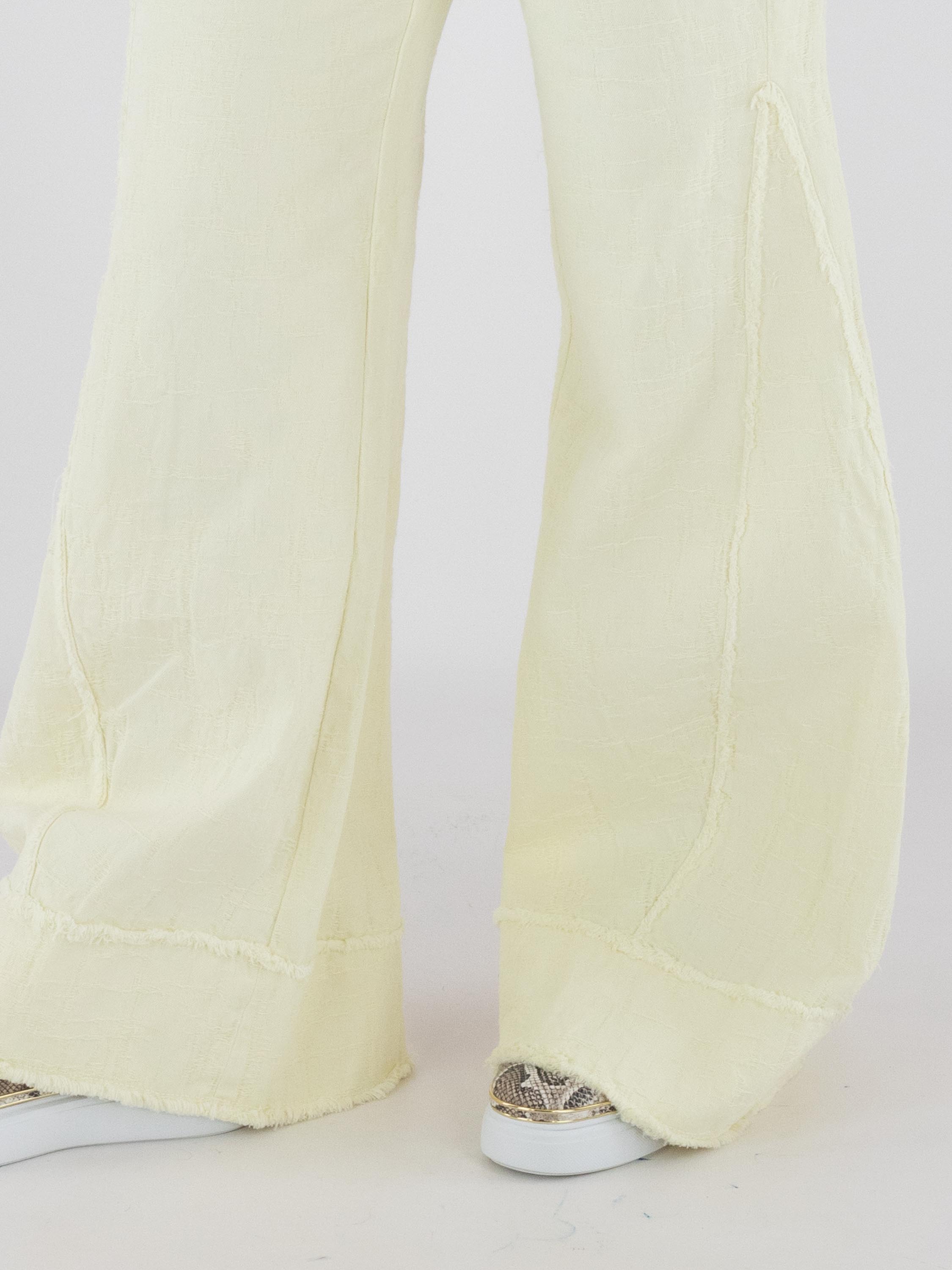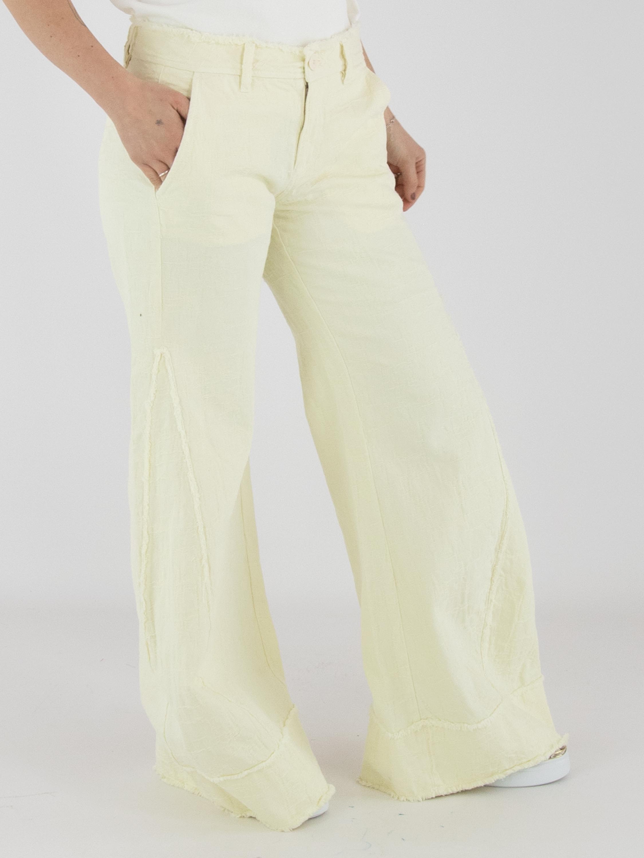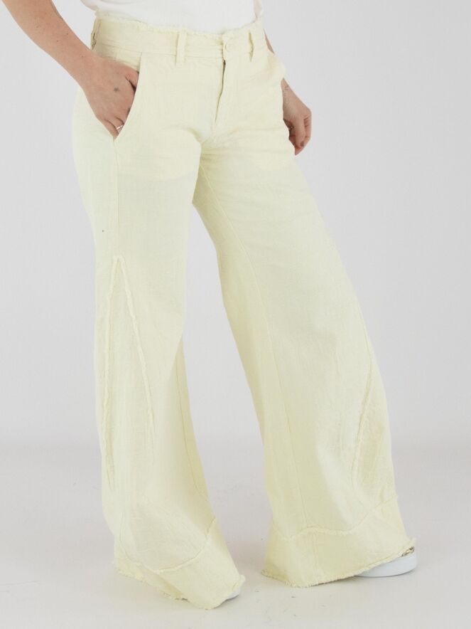 Eine Hose von High Lab in Pastellgelb. Der Stoff weist eine sichtbare Struktur auf, wobei die Kanten fein ausgefranst sind. Oberhalb des Knies sind an beiden Seiten Keile eingesetzt, die für weit geschnittene Hosenbeine sorgen; auch hier sind die Kanten dezent ausgefranst. Die Hose verfügt über Seitentaschen und kann bei 30 Grad gewaschen werden.