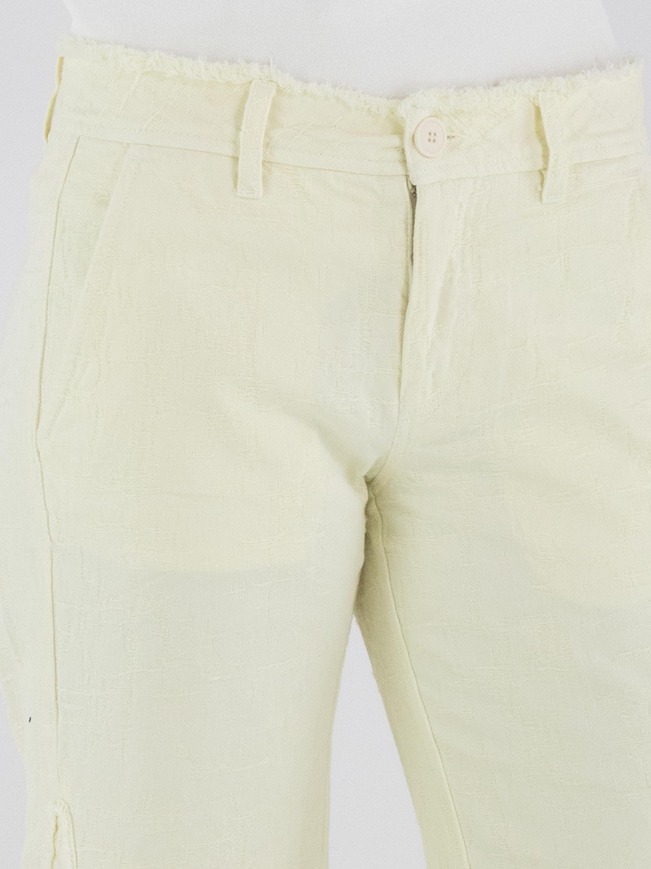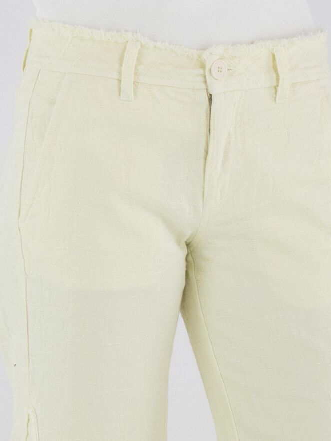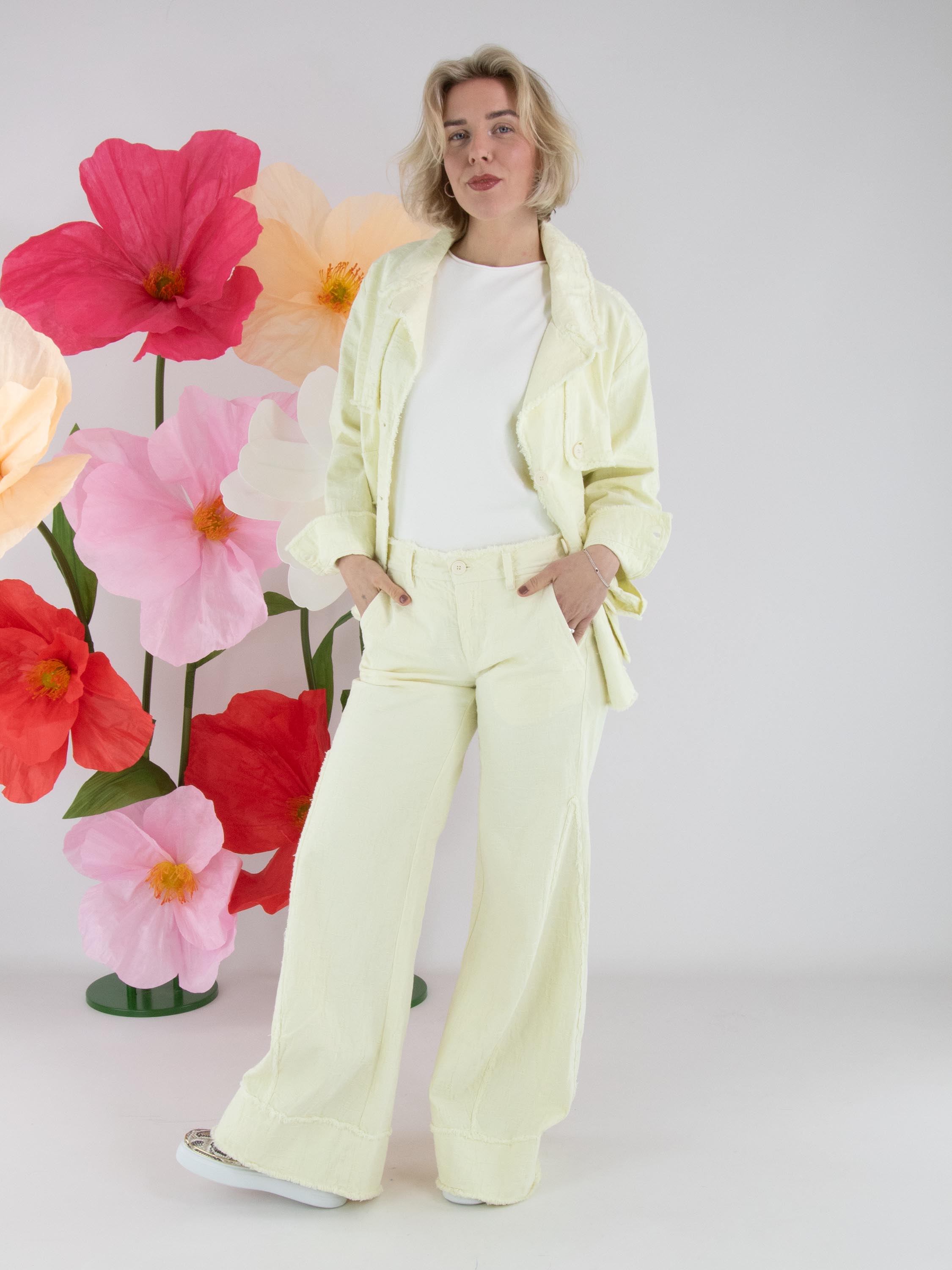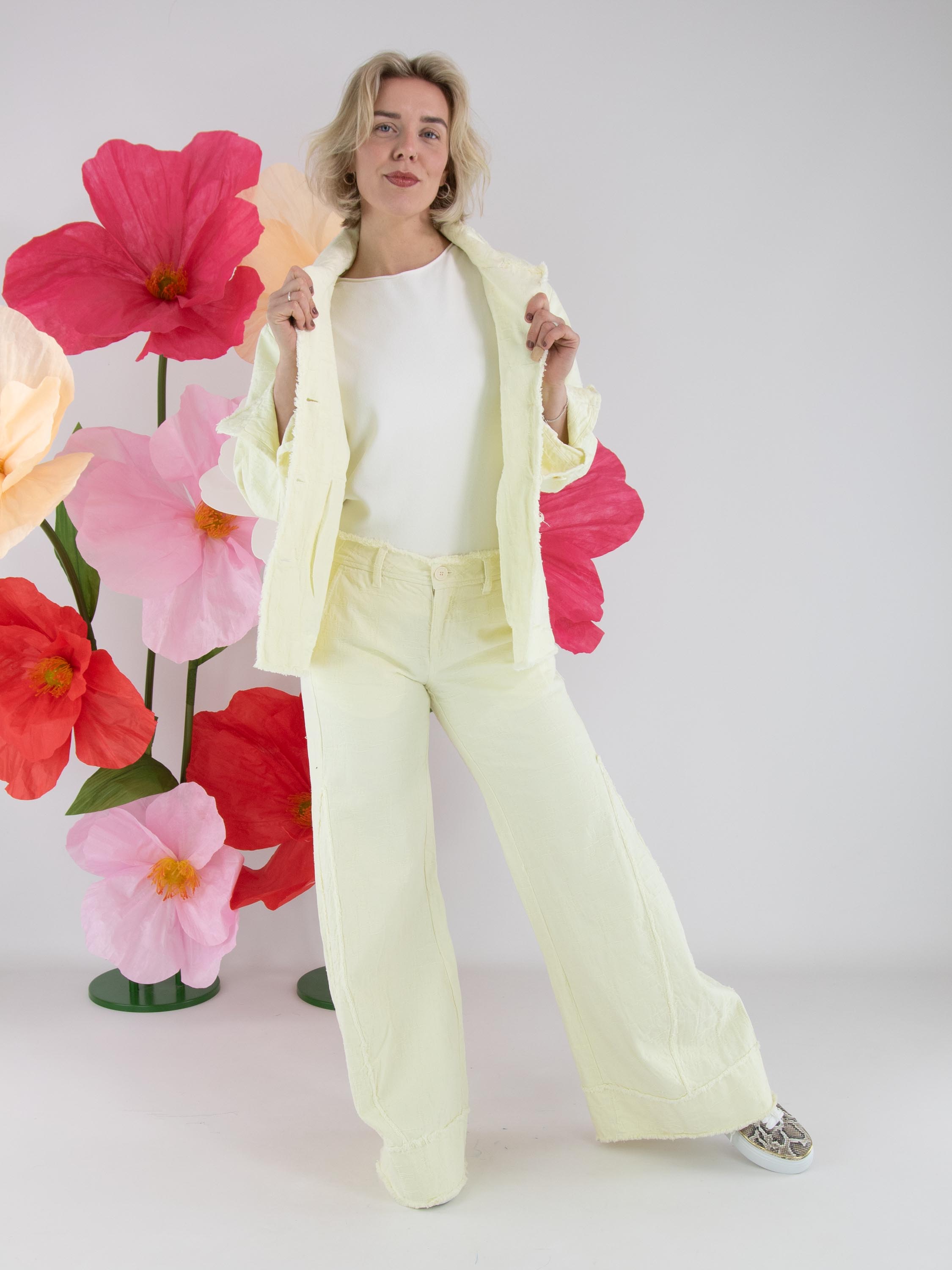 Eine Hose von High Lab in Pastellgelb. Der Stoff weist eine sichtbare Struktur auf, wobei die Kanten fein ausgefranst sind. Oberhalb des Knies sind an beiden Seiten Keile eingesetzt, die für weit geschnittene Hosenbeine sorgen; auch hier sind die Kanten dezent ausgefranst. Die Hose verfügt über Seitentaschen und kann bei 30 Grad gewaschen werden.