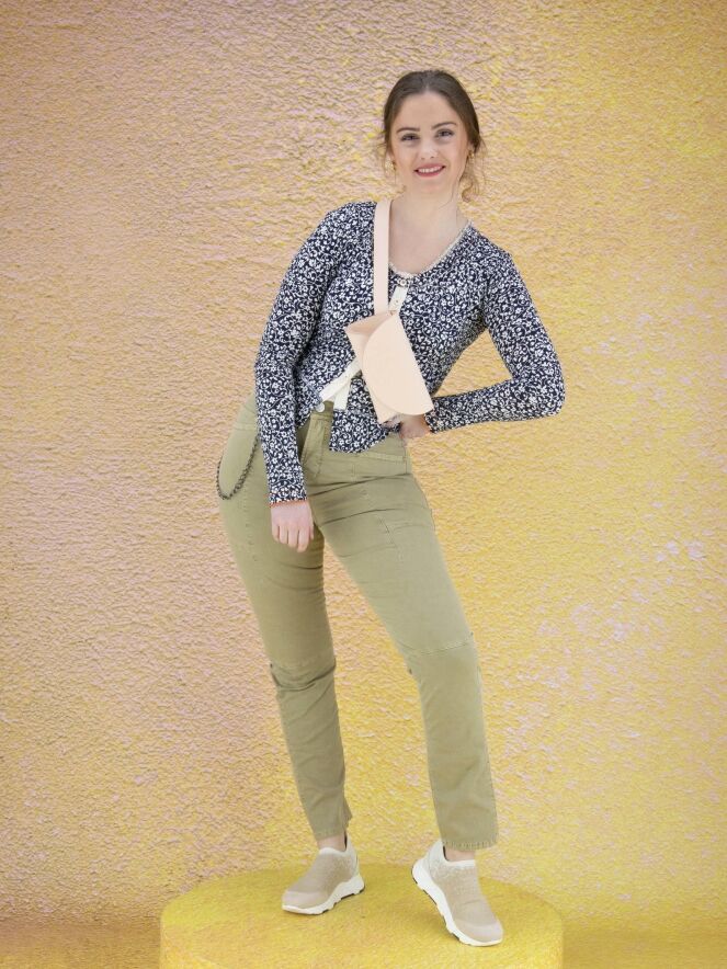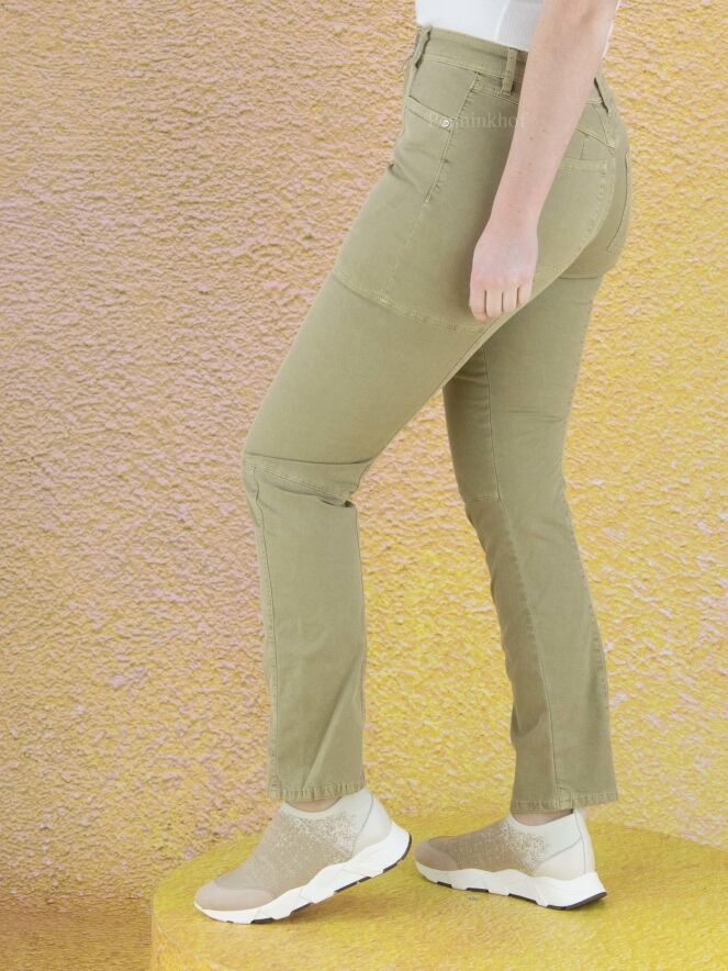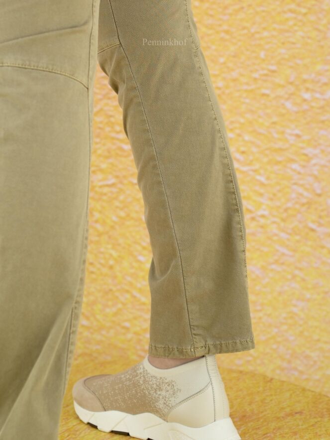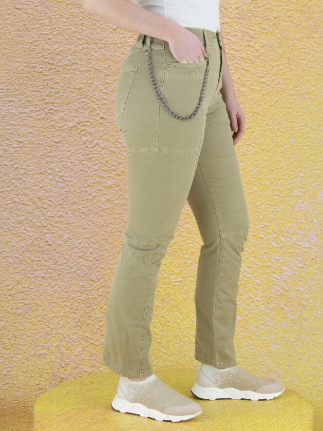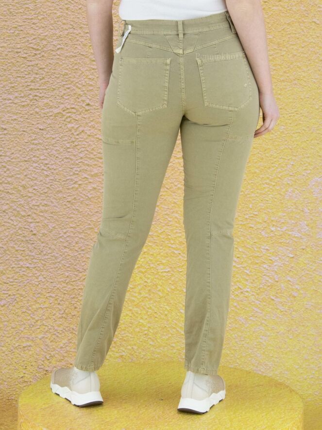 Eine taupefarbene Jeans der Designermarke High. Die Jeans ist mit horizontalen und vertikalen Nähten versehen. Die Jeans kommt als 5-Pocket-Modell und kann bei 30 Grad gewaschen werden.