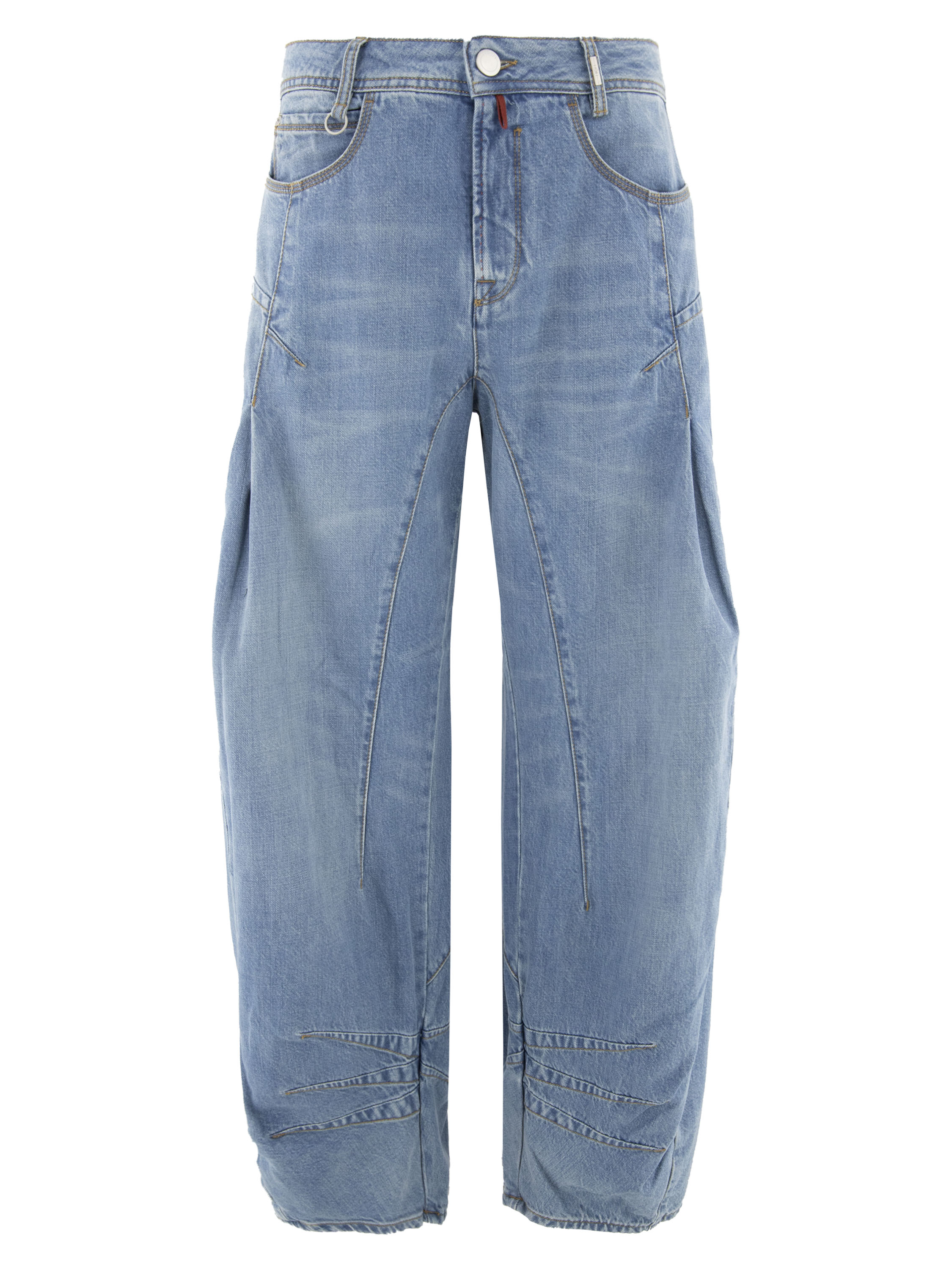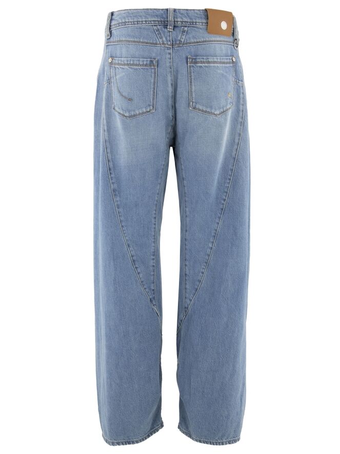 Eine Jeans von High in hellem Jeansblau. Die Jeans ist im klassischen 5-Pocket-Stil gearbeitet. Unterhalb der Hüfte sind auf beiden Seiten Falten eingearbeitet. Am unteren Ende der Hosenbeine befinden sich an der Innenseite drei doppelte, zulaufende Nähte. Diese Jeans kann bei 30 Grad gewaschen werden.