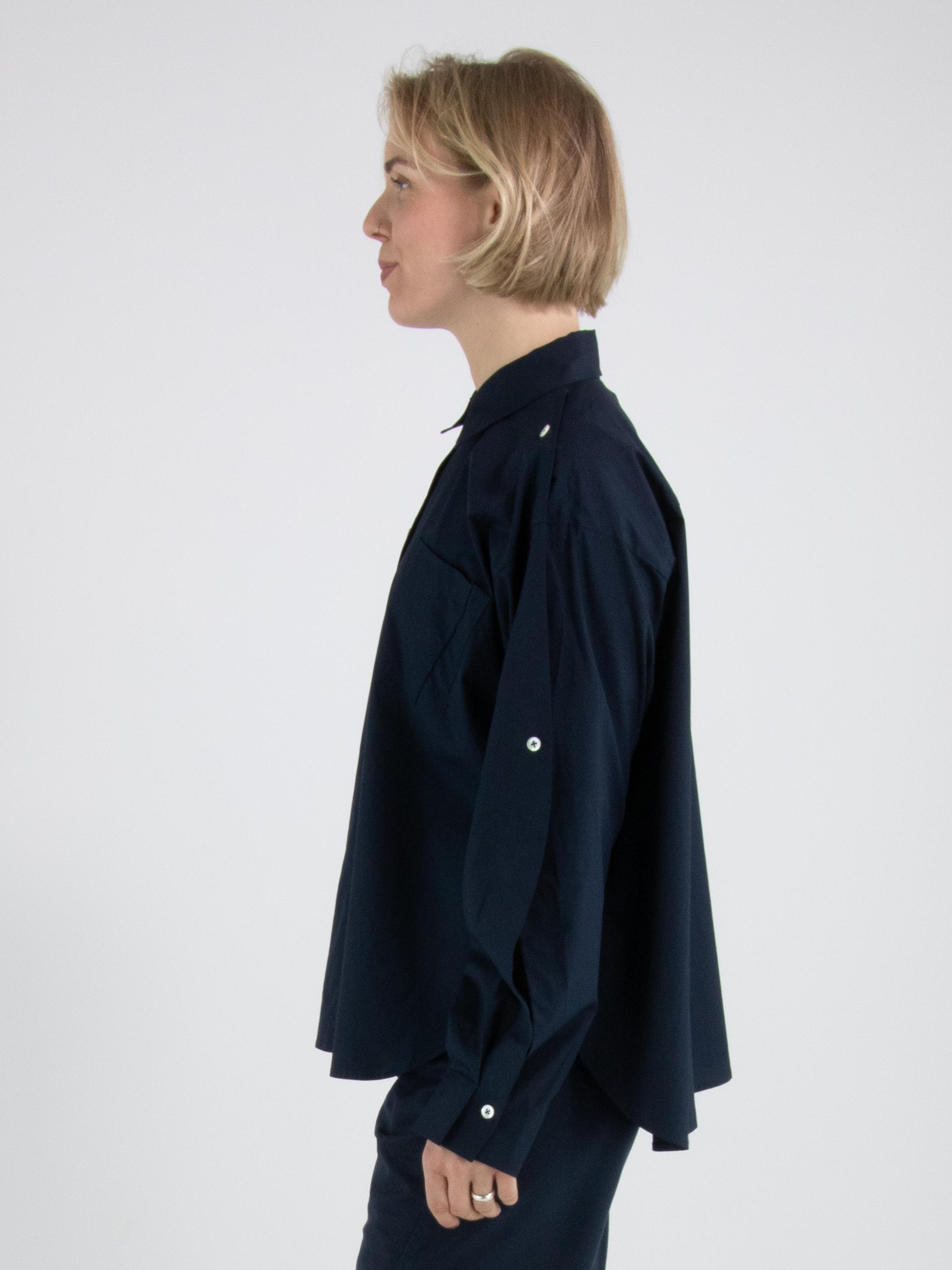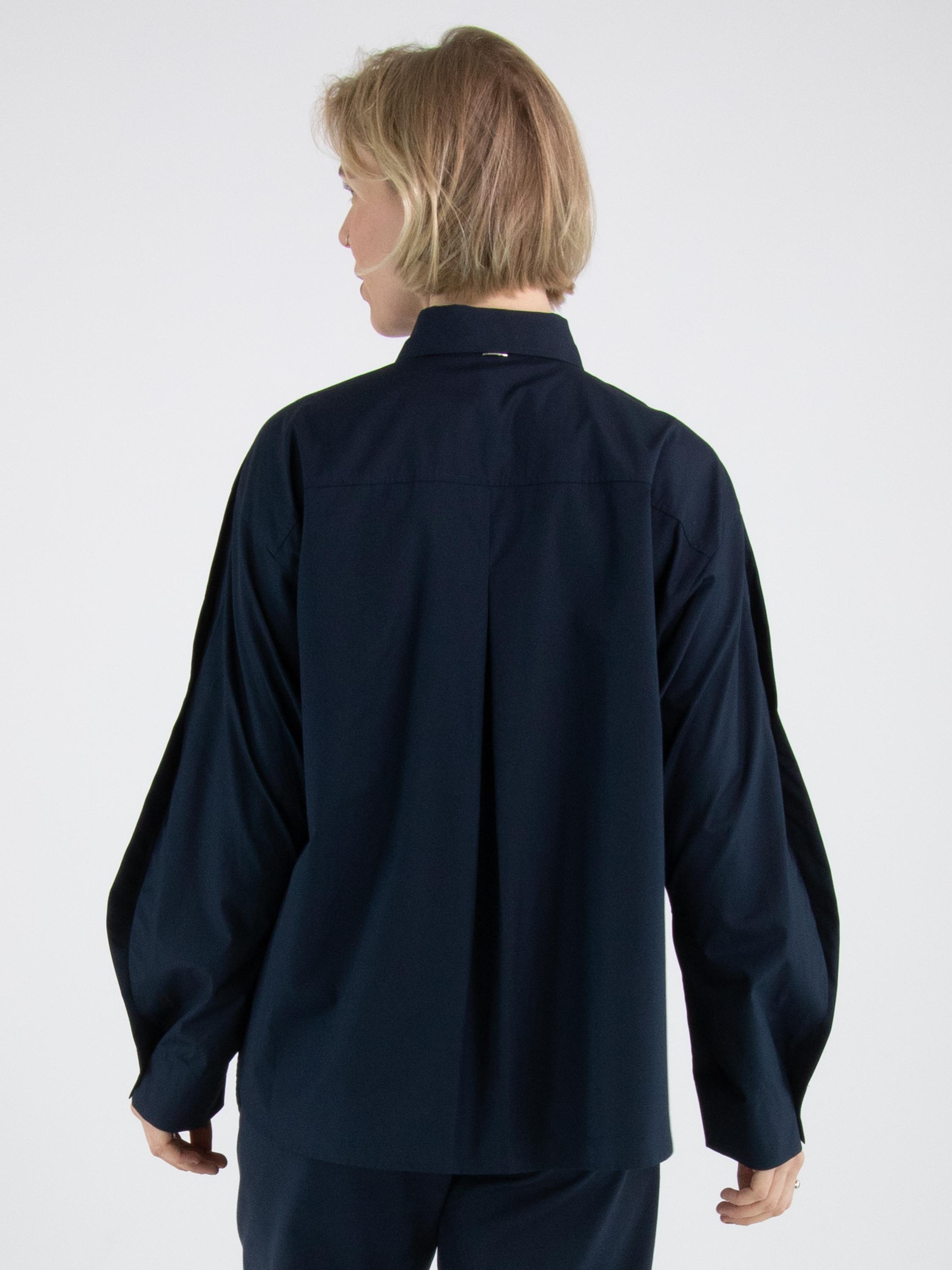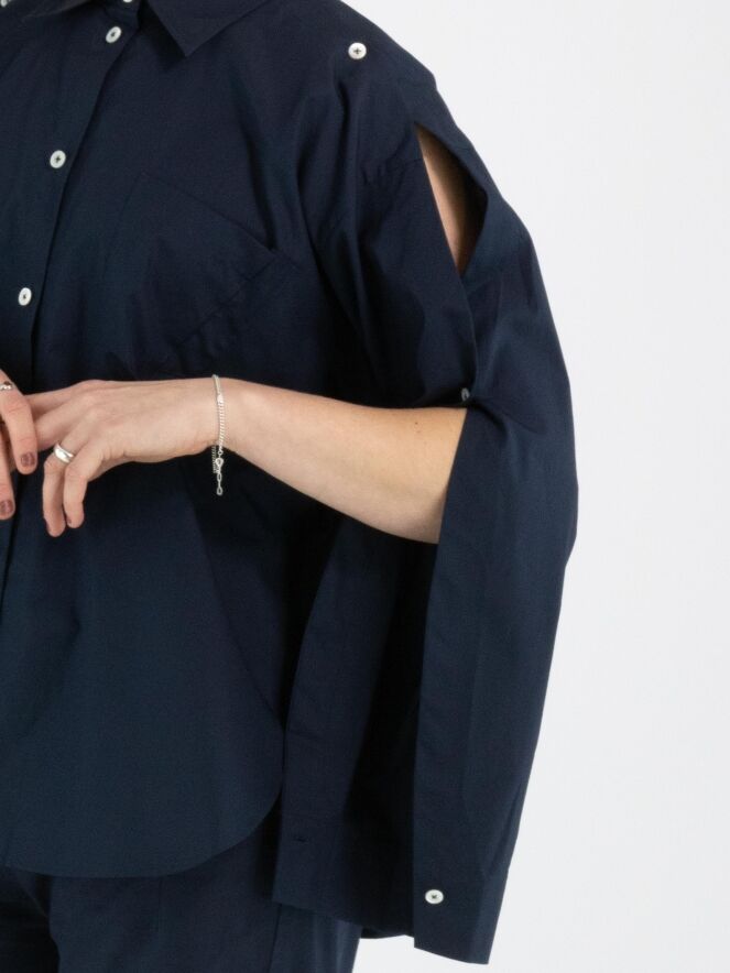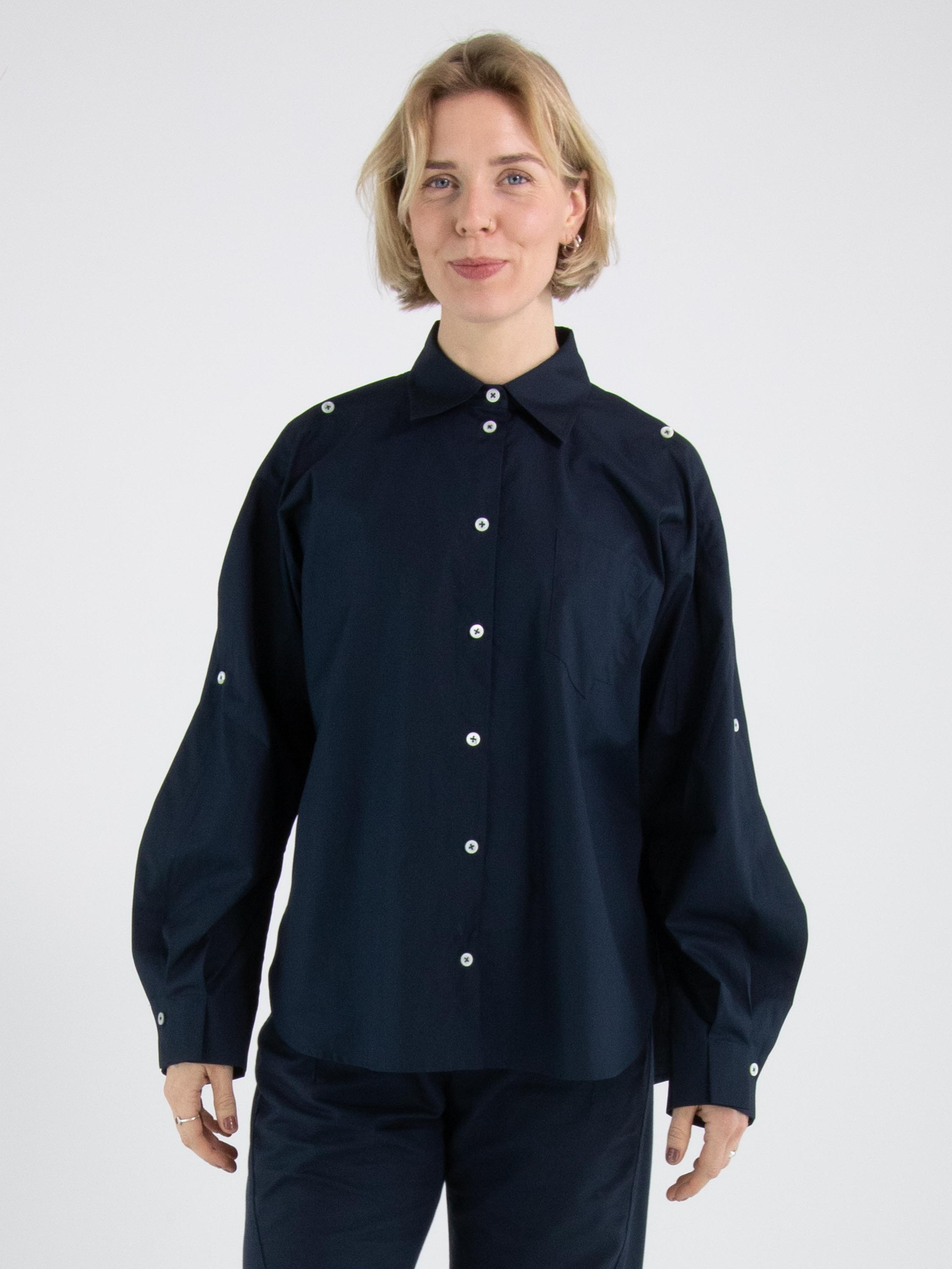 Eine Bluse von High in Nachtblau. Die Brusttasche hat eine doppelte asymmetrische Naht. Der obere Teil der langen Ärmel ist von der Schulter aus offen und teilweise mit Knopfverschlüssen geschlossen. Diese Bluse kann per Hand gewaschen werden.