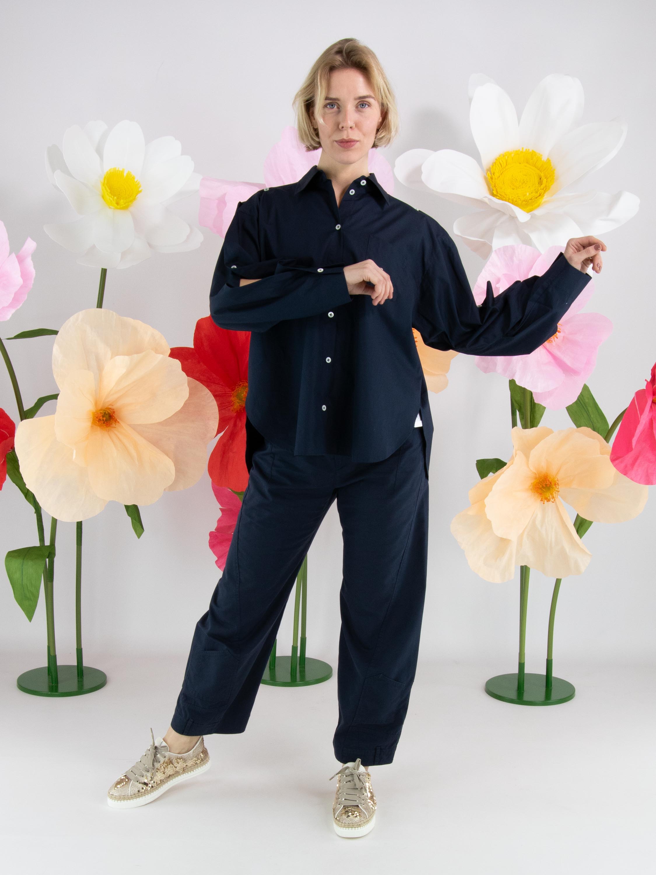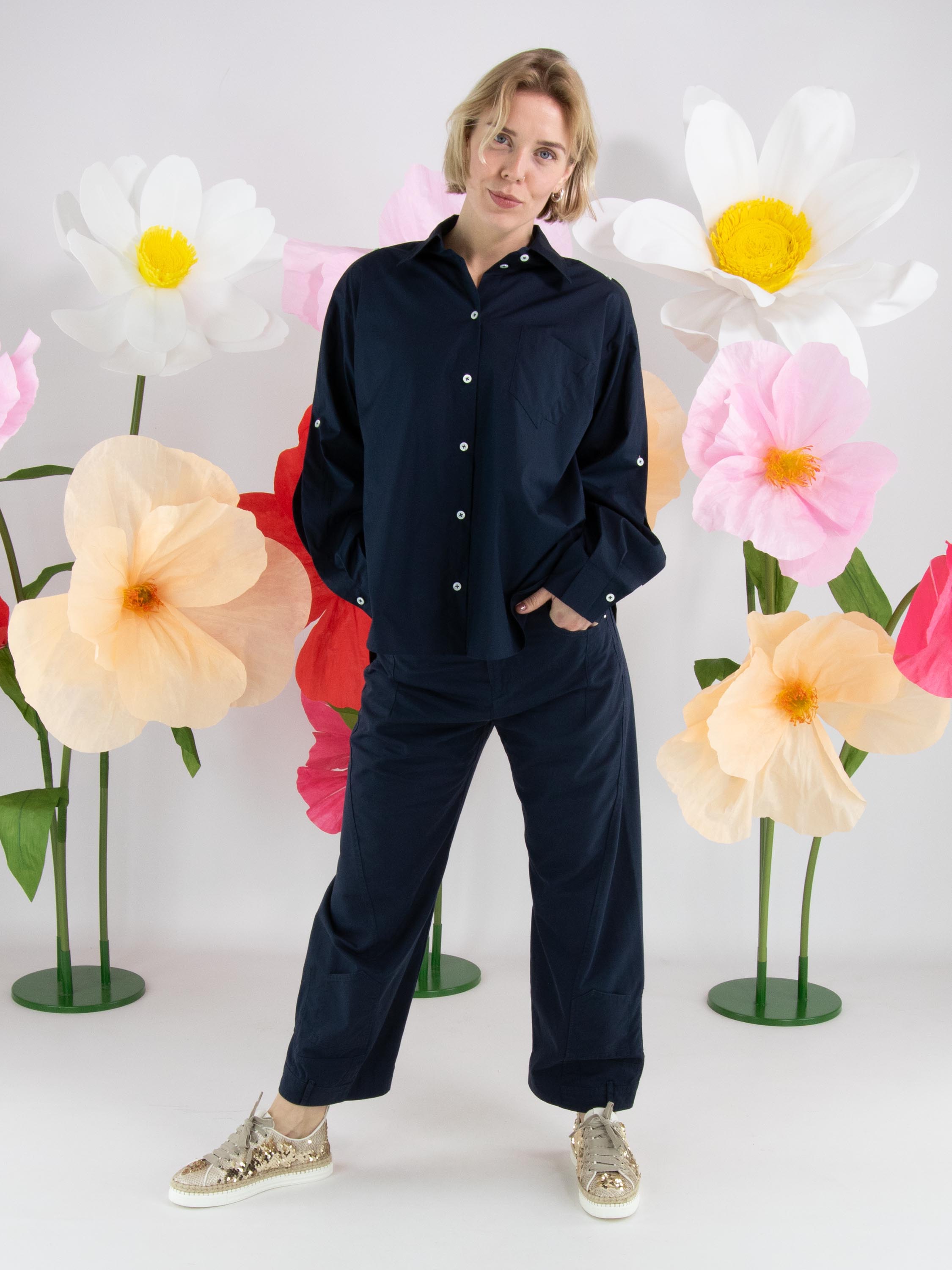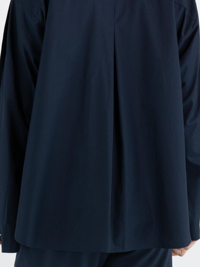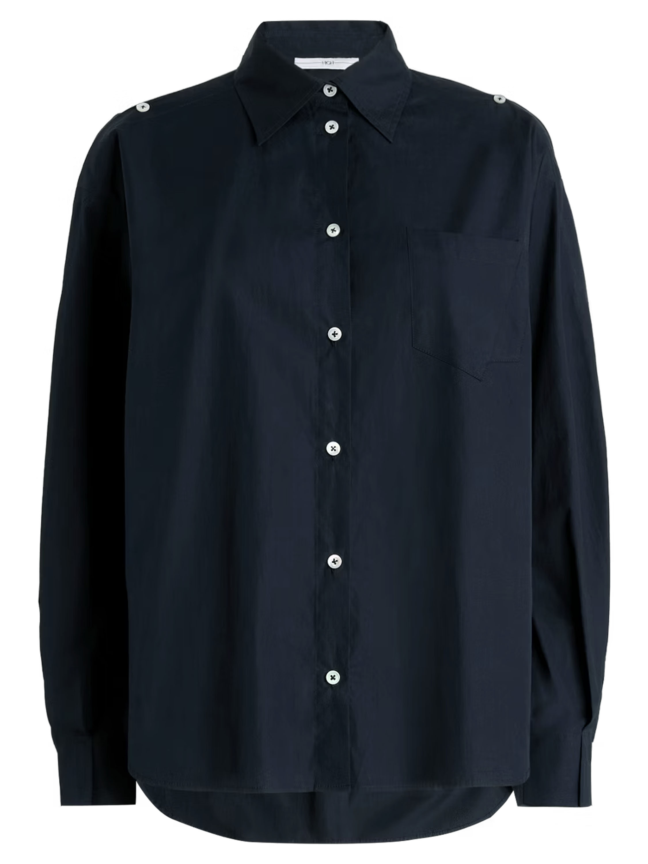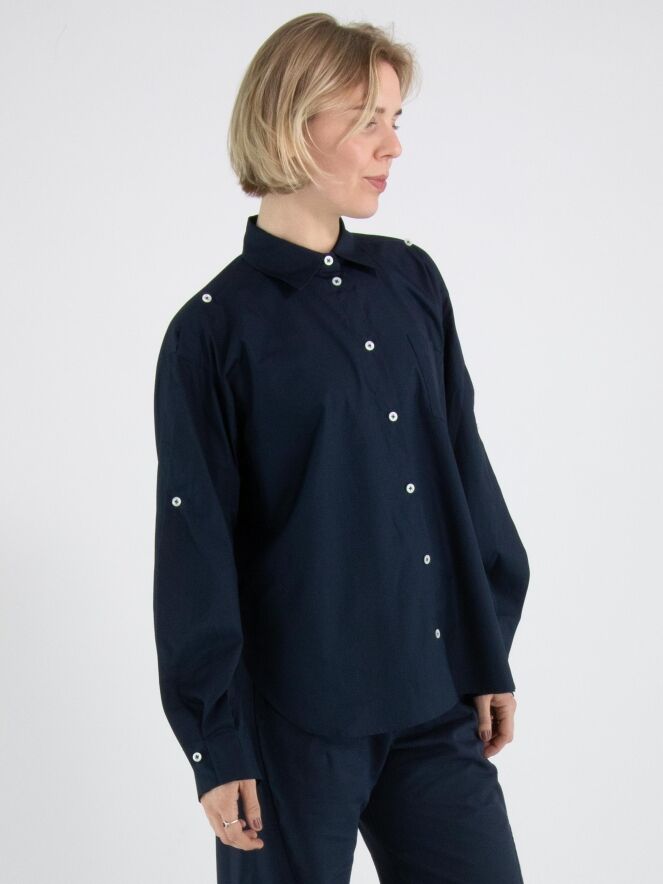 Eine Bluse von High in Nachtblau. Die Brusttasche hat eine doppelte asymmetrische Naht. Der obere Teil der langen Ärmel ist von der Schulter aus offen und teilweise mit Knopfverschlüssen geschlossen. Diese Bluse kann per Hand gewaschen werden.
