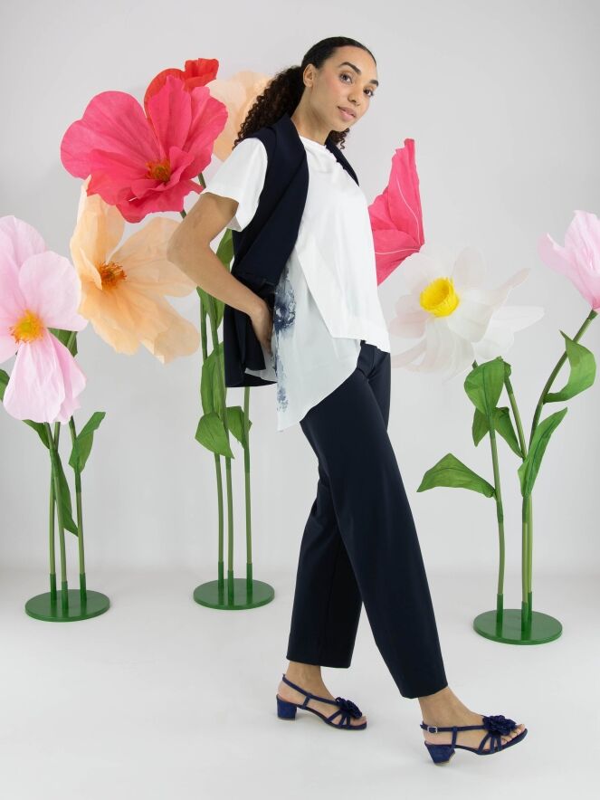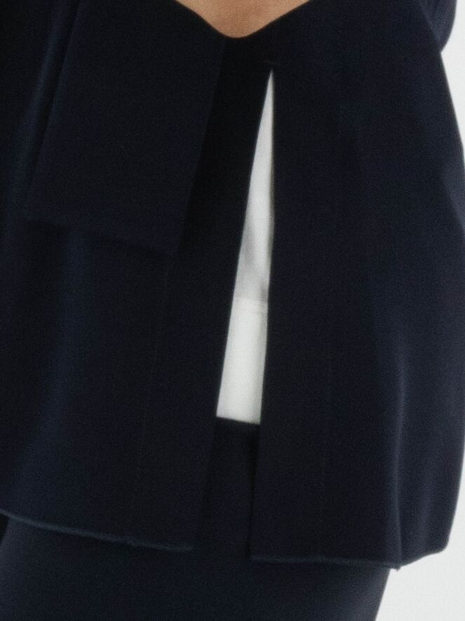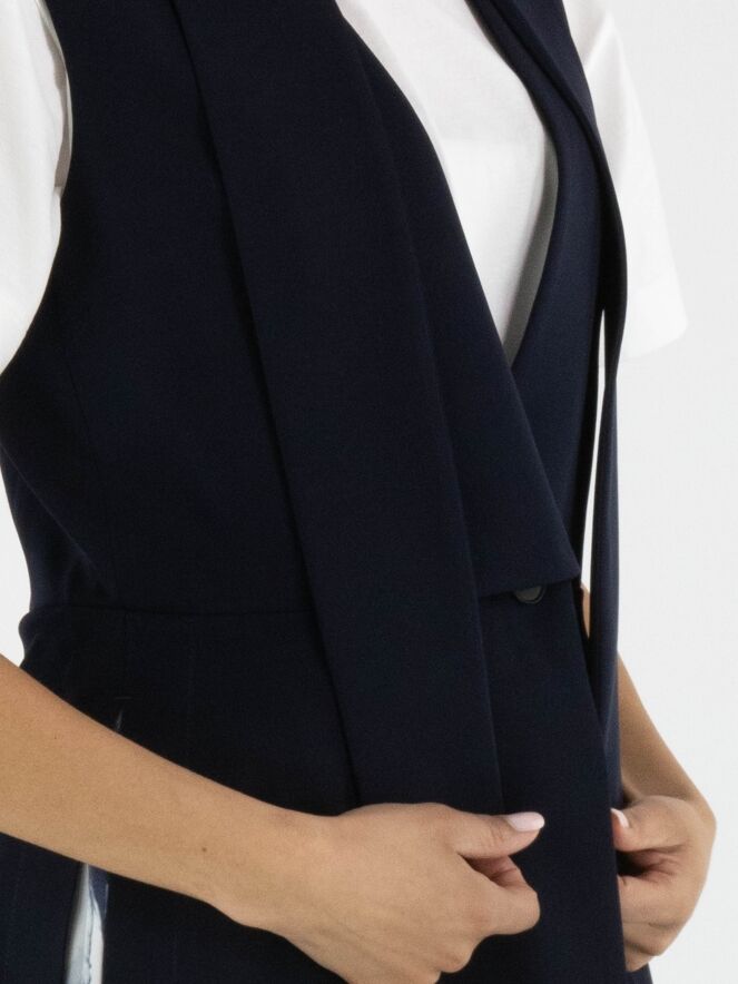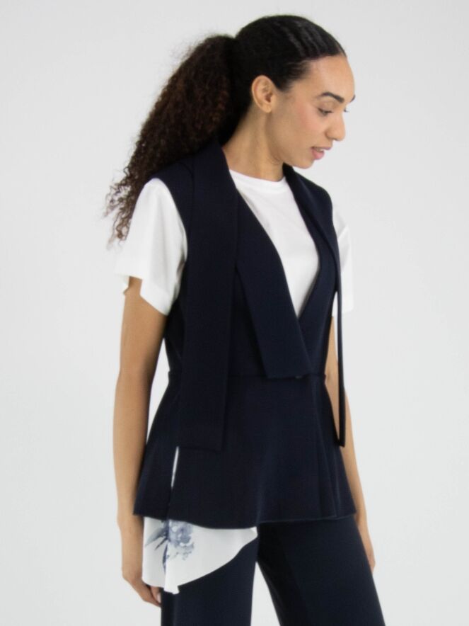 Gilet von High in Marineblau. Das Modell ist rechts mit einem Kragen gearbeitet, während die linke Seite kragenlos bleibt und so einen markanten asymmetrischen Effekt erzeugt. Von den Schultern fallen zwei lange Bänder aus dem gleichen Stoff, die optisch an einen eleganten Schalkragen erinnern. Auf Taillenhöhe wird das Gilet mit einem Knopf geschlossen. Seitliche Schlitze bis zur Taille verleihen dem Design eine luftige, moderne Silhouette. Dieses exklusive Designergilet kann bei 30 Grad gewaschen werden.