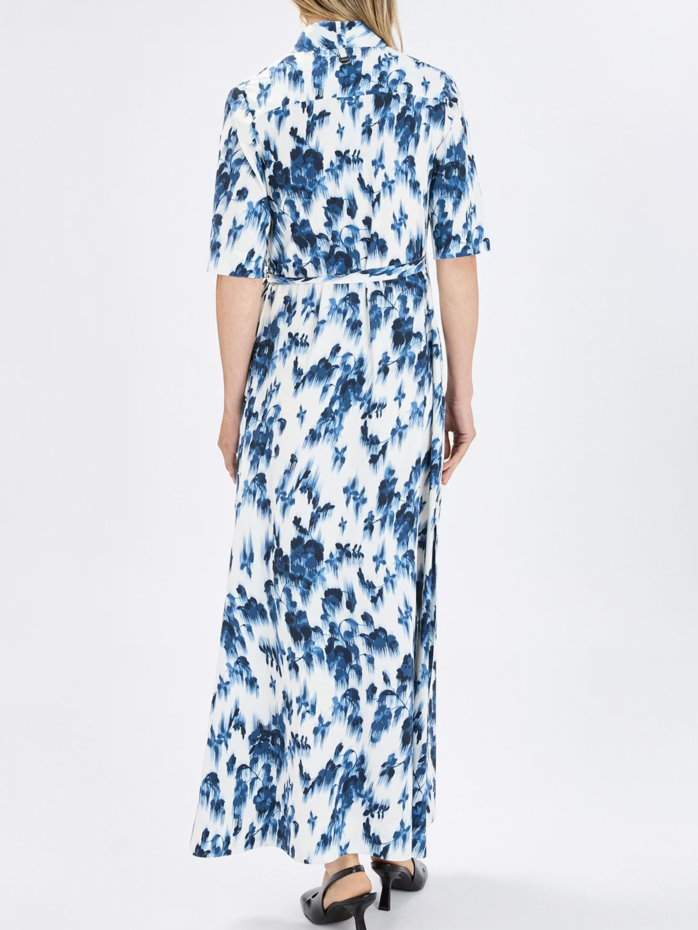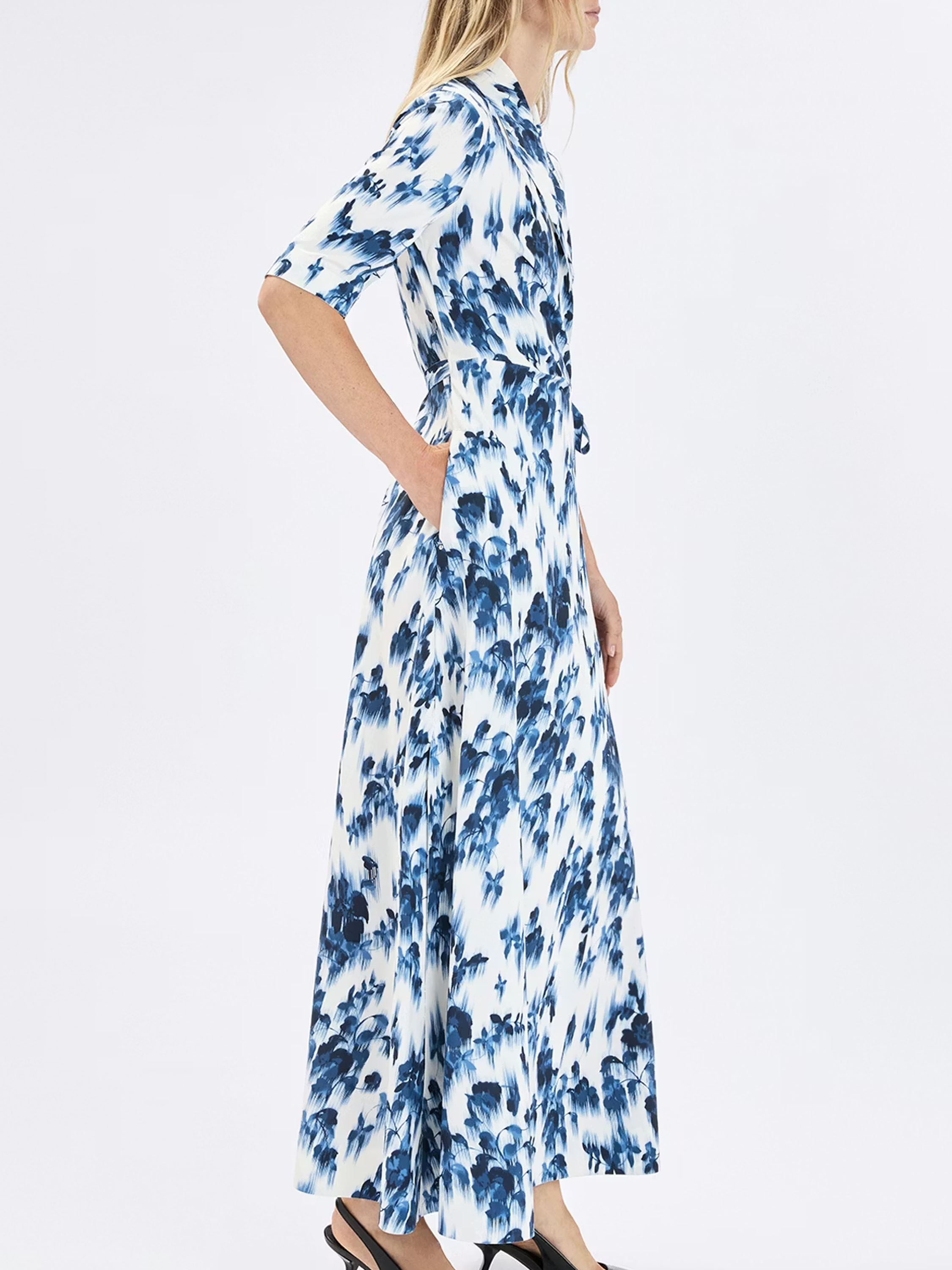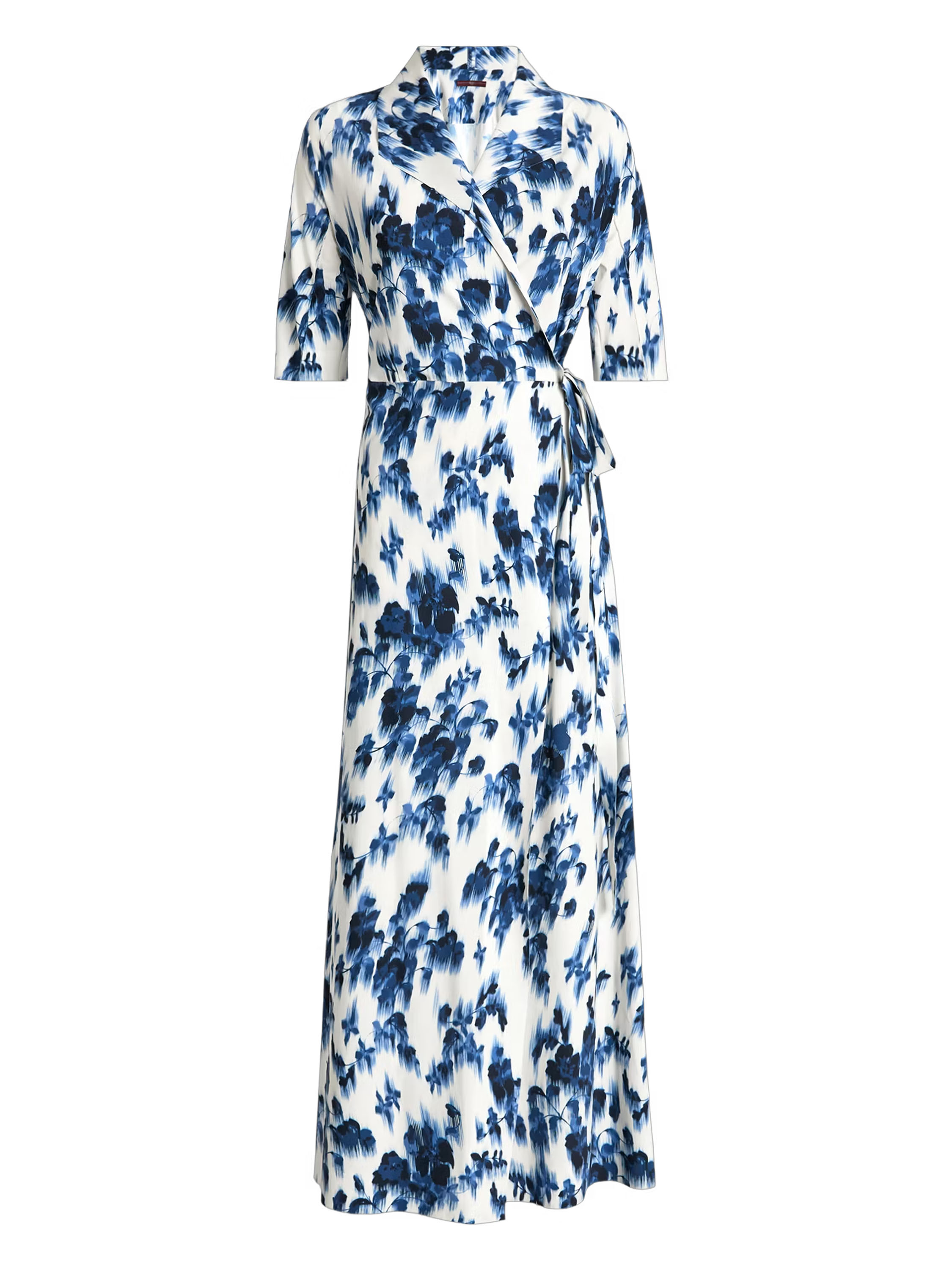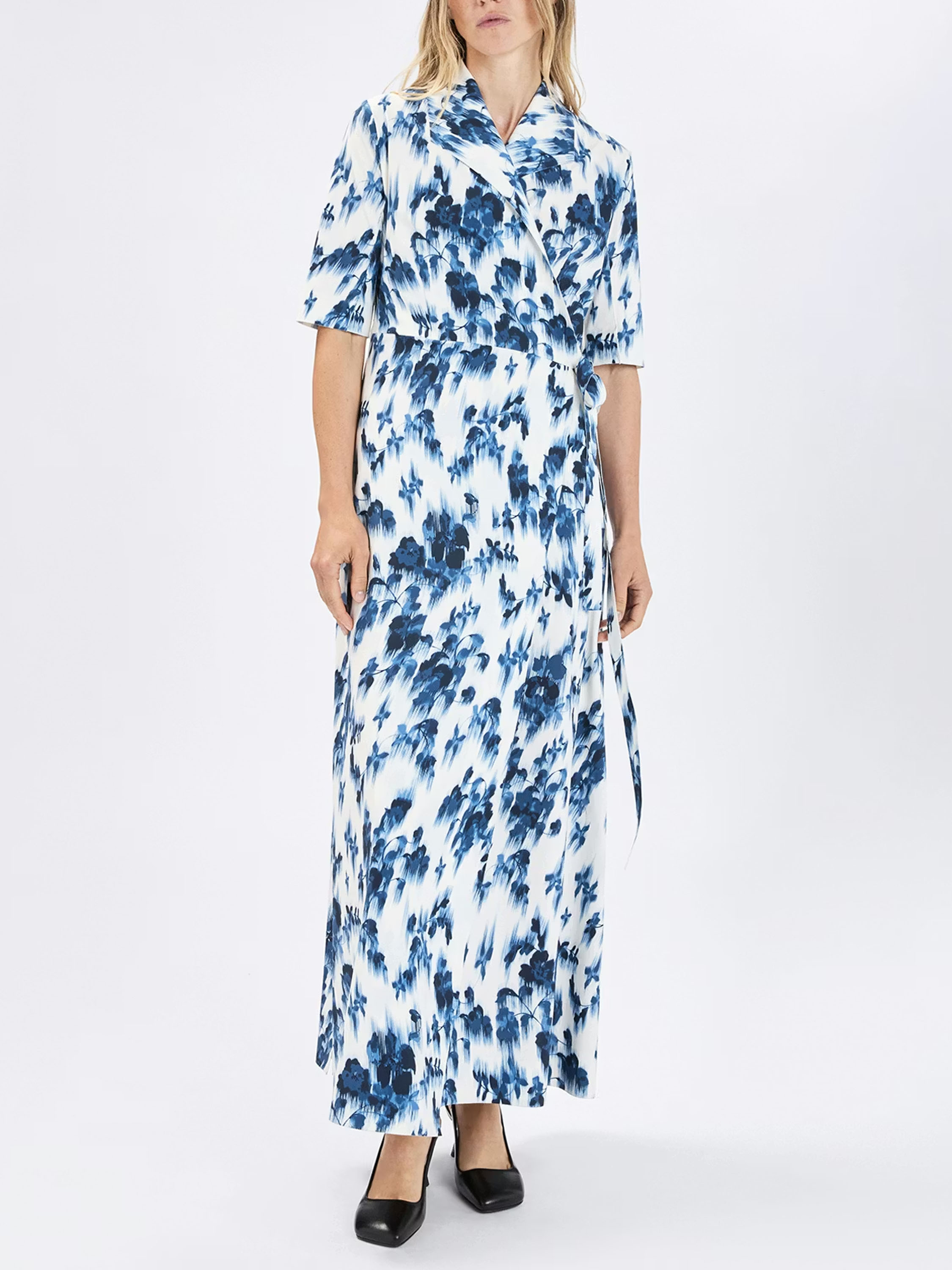 Ein Wickelkleid von High Tech mit einem verwischten Blumenprint in mehreren Blautönen auf weißem Grund. Das Kleid hat kurze Ärmel. Am unteren Saum befindet sich an beiden Seiten ein Schlitz. Dieses Kleid kann per Hand gewaschen werden.