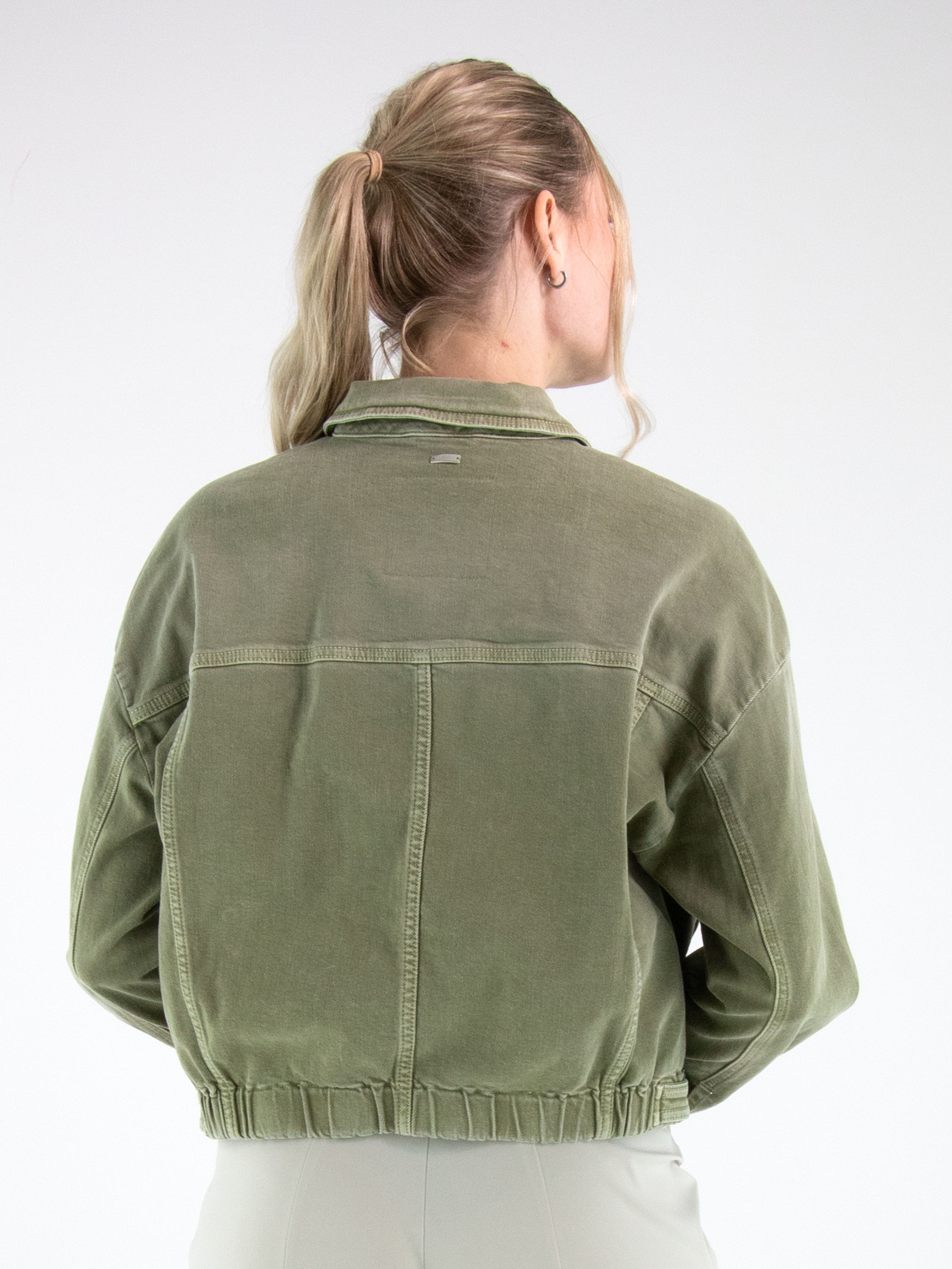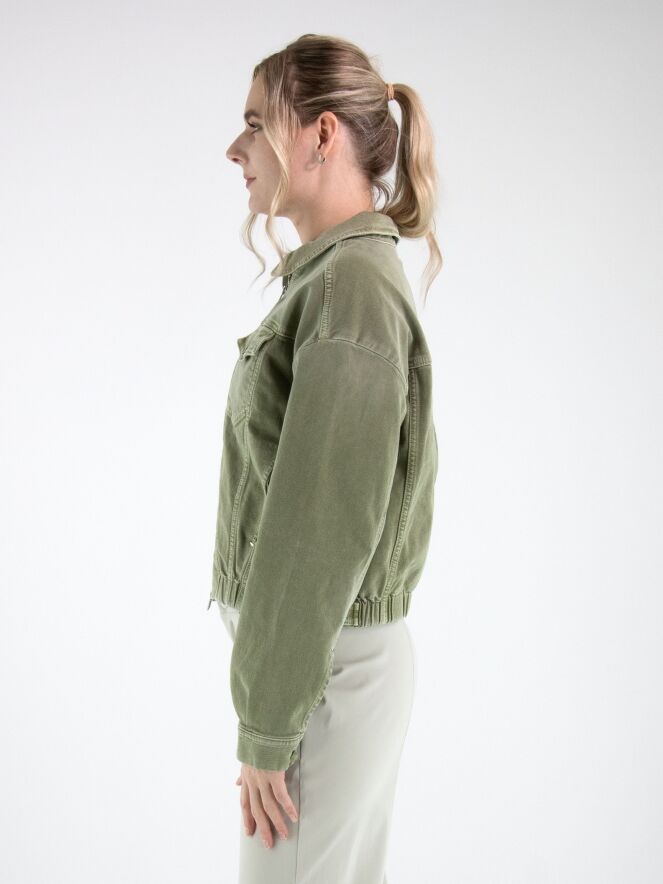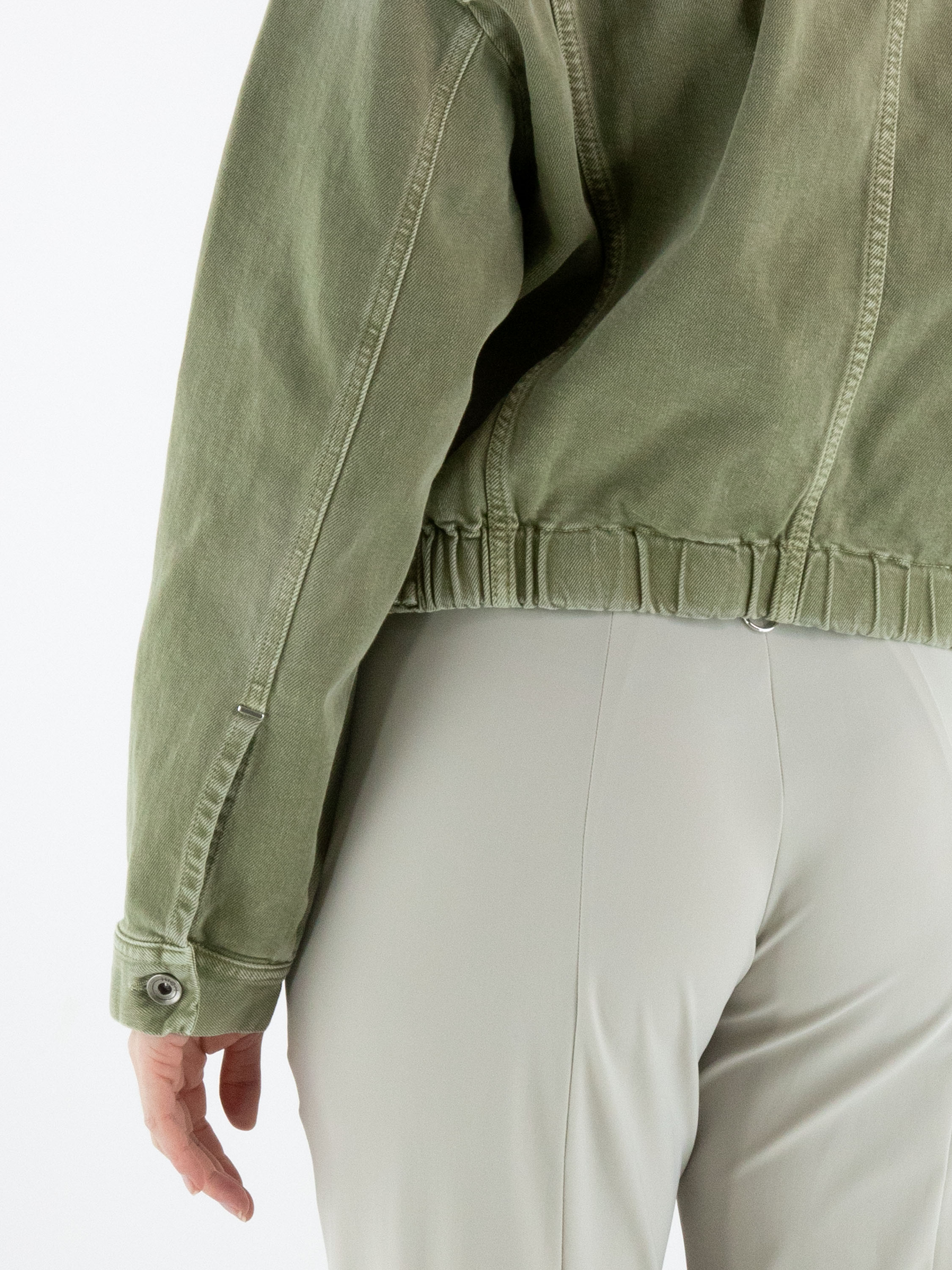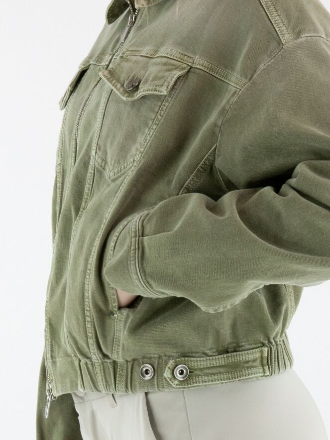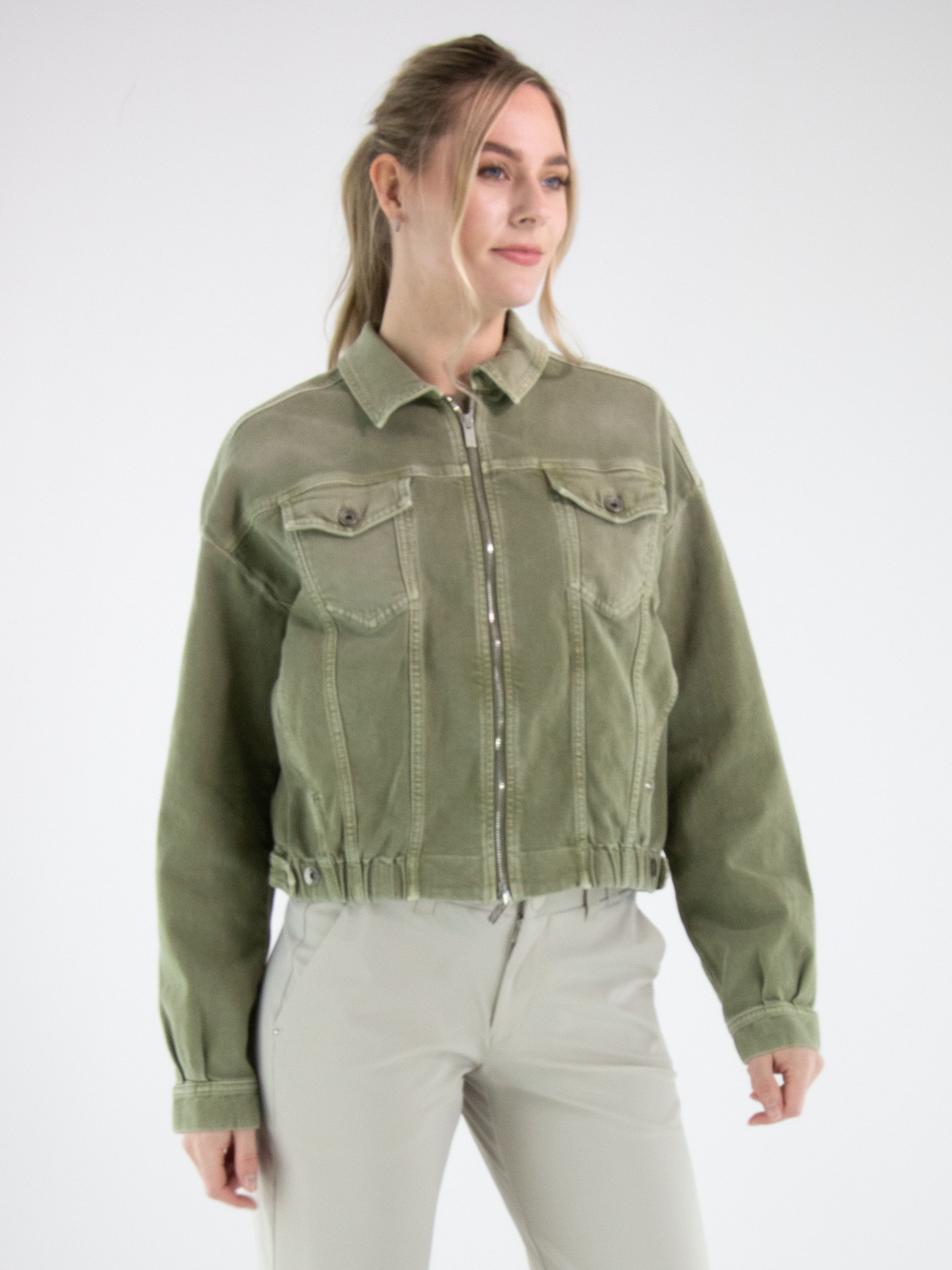 Jeansjacke von High in einem Used-Olivgrün. Das Modell verfügt über einen Reißverschluss und einen elastischen Bund am Saum, der den Denimstoff leicht rafft und dem Design eine moderne Silhouette verleiht. Diese Jacke kann bei 30 Grad gewaschen werden.
