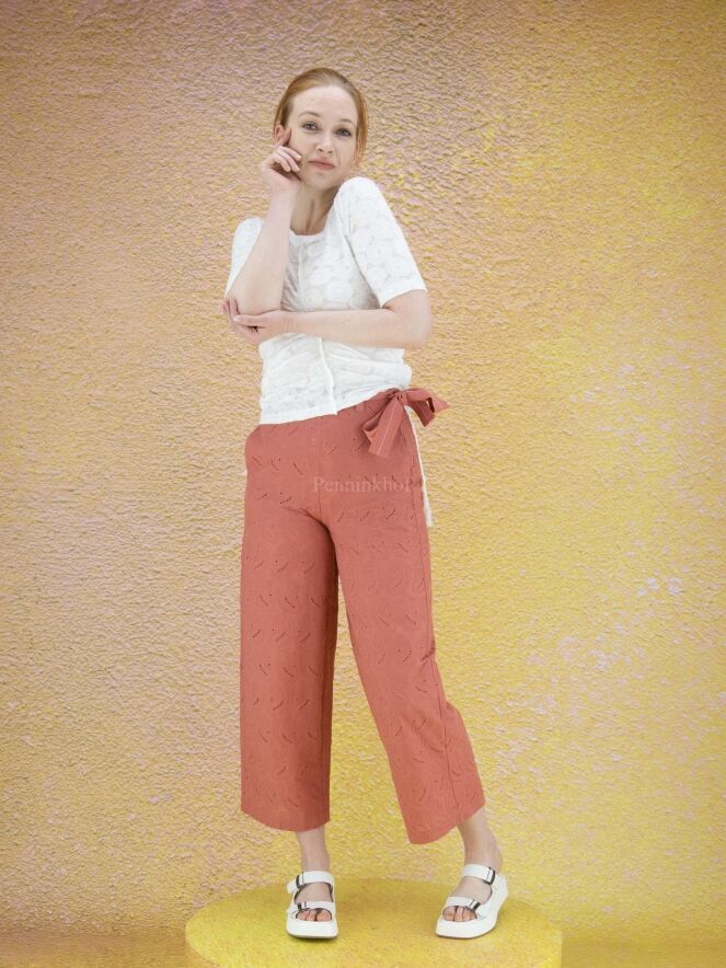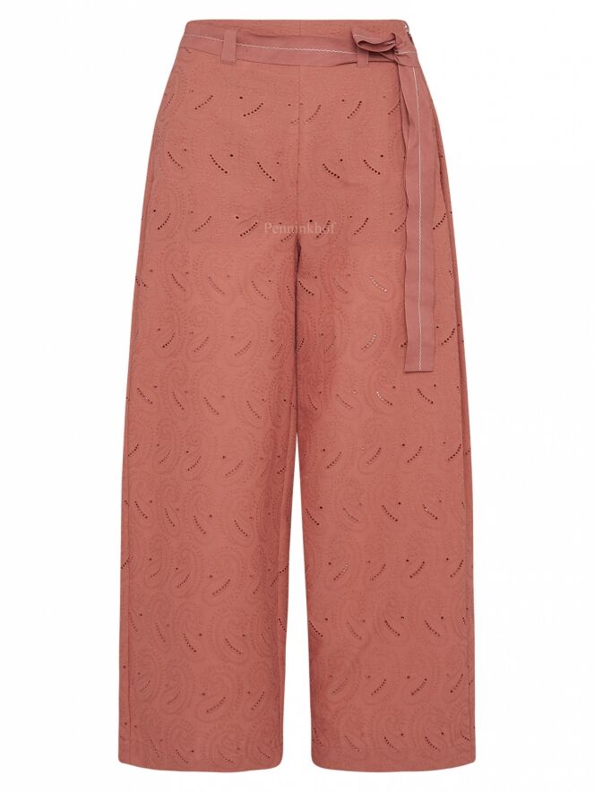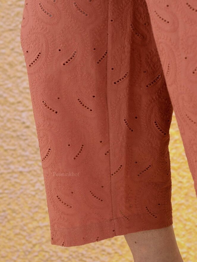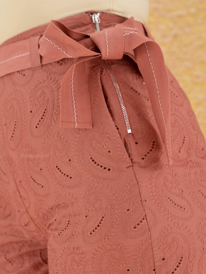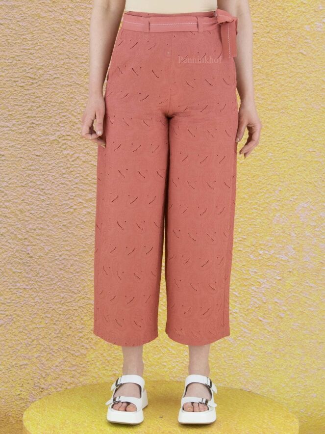 Eine Hose in barocker Struktur der Designermarke High mit perforierten Löchern in einem weichen Rostrot. In der Taille befindet sich ein Stoffgürtel mit einer Steppnaht in der Mitte. An der Seite befindet sich ein Reißverschluss. Diese Hose kann von Hand gewaschen werden.