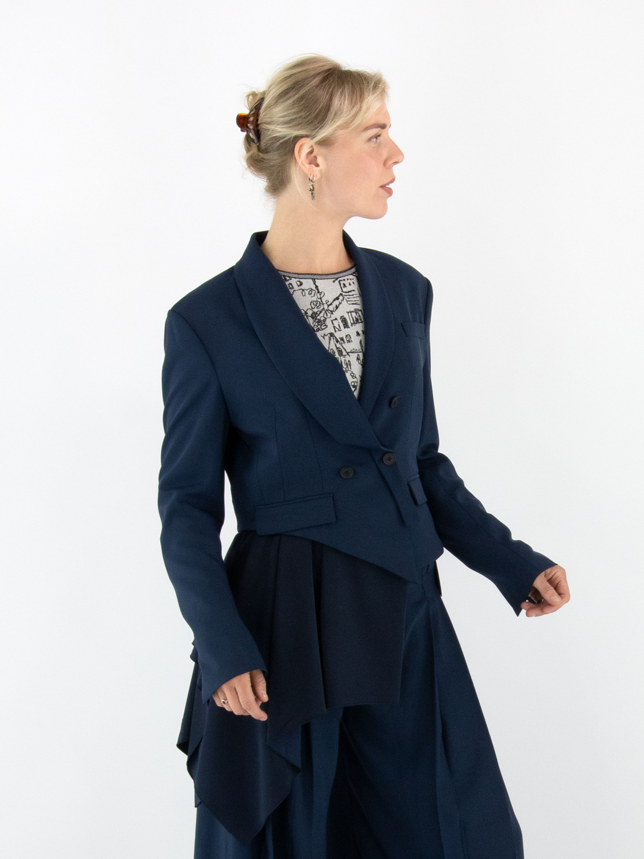 Kurzer Double-Breasted Blazer von High in Nachtblau. Das rechte Revers des Kragens ist teilweise gelöst und an der Knopfleiste fixiert, was einen besonderen Design-Effekt schafft. Am rechten unteren Teil befindet sich ein mattes Satindetail, das diagonal von der rechten Seite über den Rücken bis zur linken Seite verläuft. Der Blazer ist komplett gefüttert und darf nicht gewaschen werden.