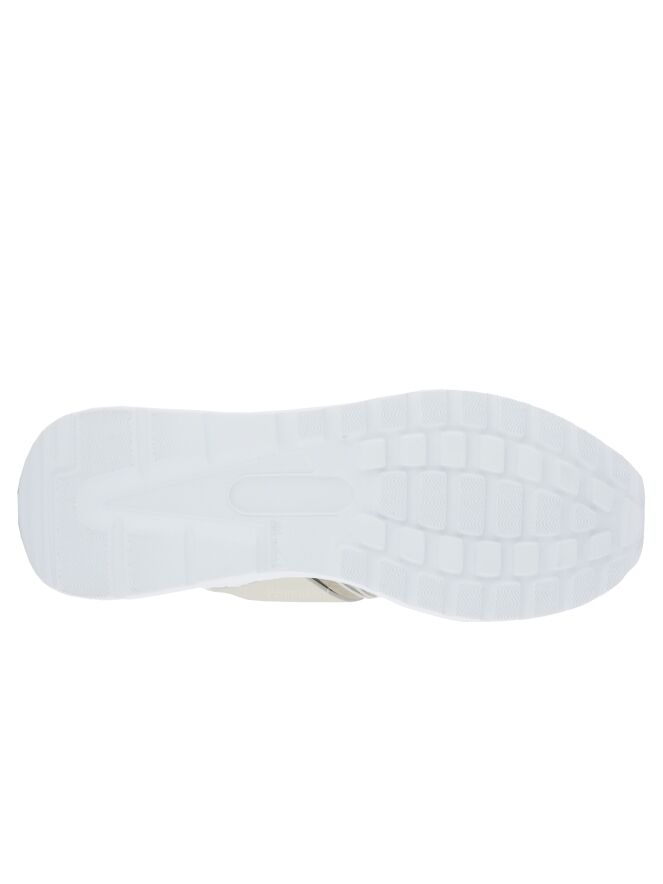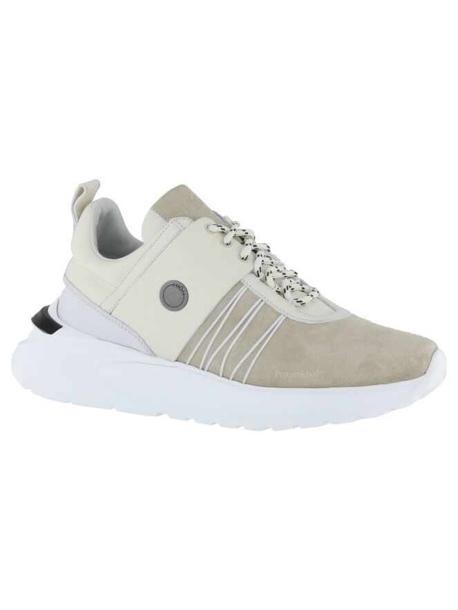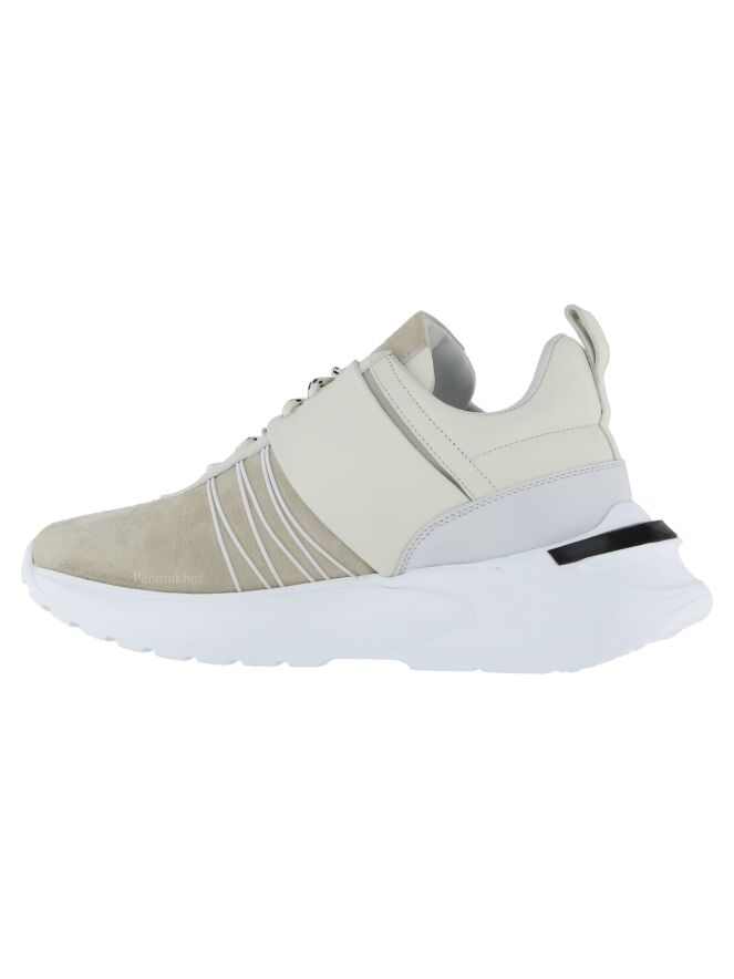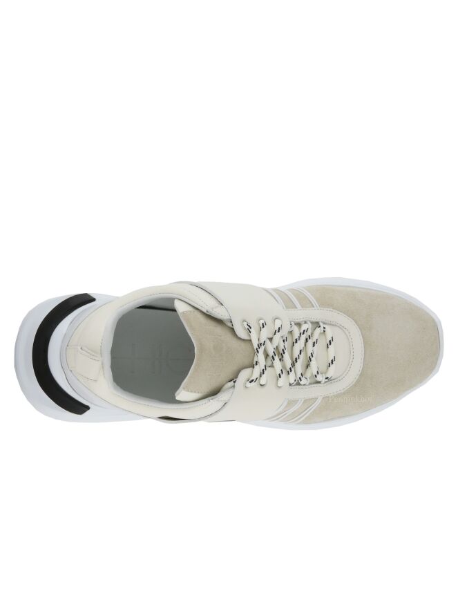 Ein beiger Sneaker der Designermarke High. Der Spann ist aus Wildleder und von den Seiten bis zur Ferse ist der Sneaker aus cremeweißem Glattleder. An den Seiten befinden sich cremeweiße Zierschnüre. Die leicht diagonal linierte Sohle ist weiß und mit einem weißen Streifen an der Ferse versehen. Die Innenseite ist mit Leder gefüttert.