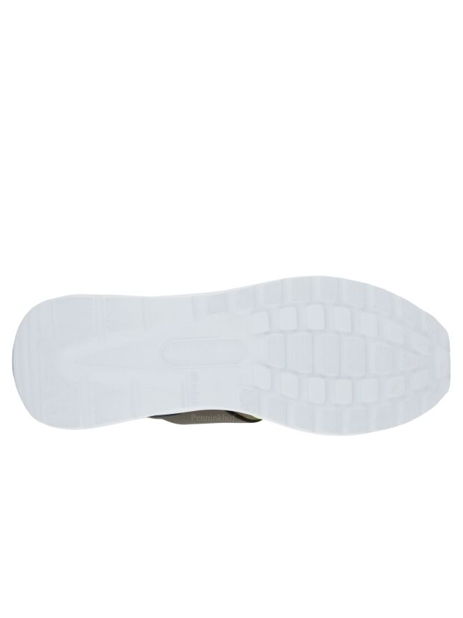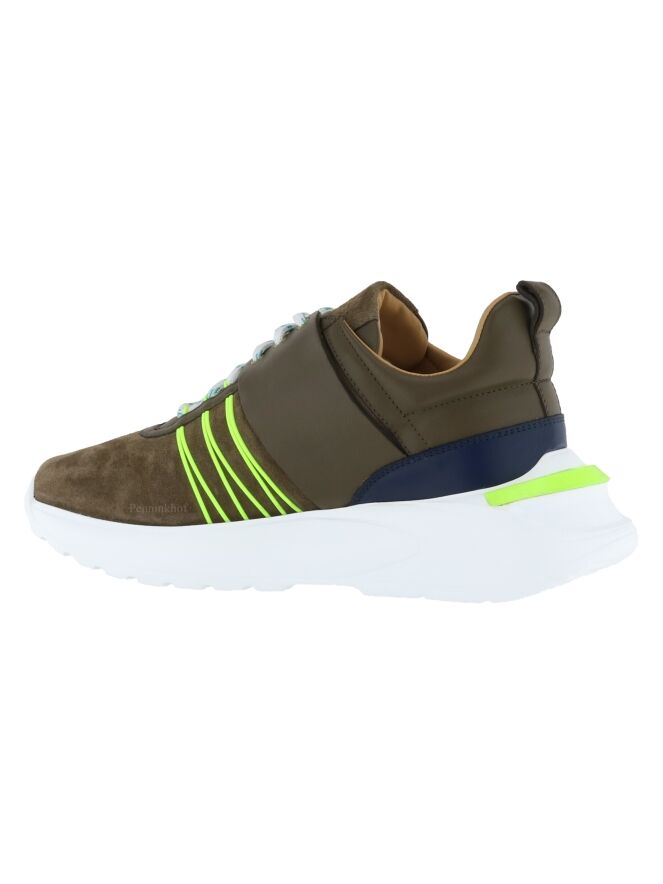 Ein olivgrüner Sneaker der Designermarke High. Der Spann ist aus Wildleder und von den Seiten bis zur Ferse ist der Sneaker aus Glattleder. An den Seiten befinden sich limettenfarbene Zierschnüre. Die leicht diagonal linierte Sohle ist weiß und mit einem limettenfarbenen Streifen an der Ferse versehen. Die Innenseite ist mit Leder gefüttert.
