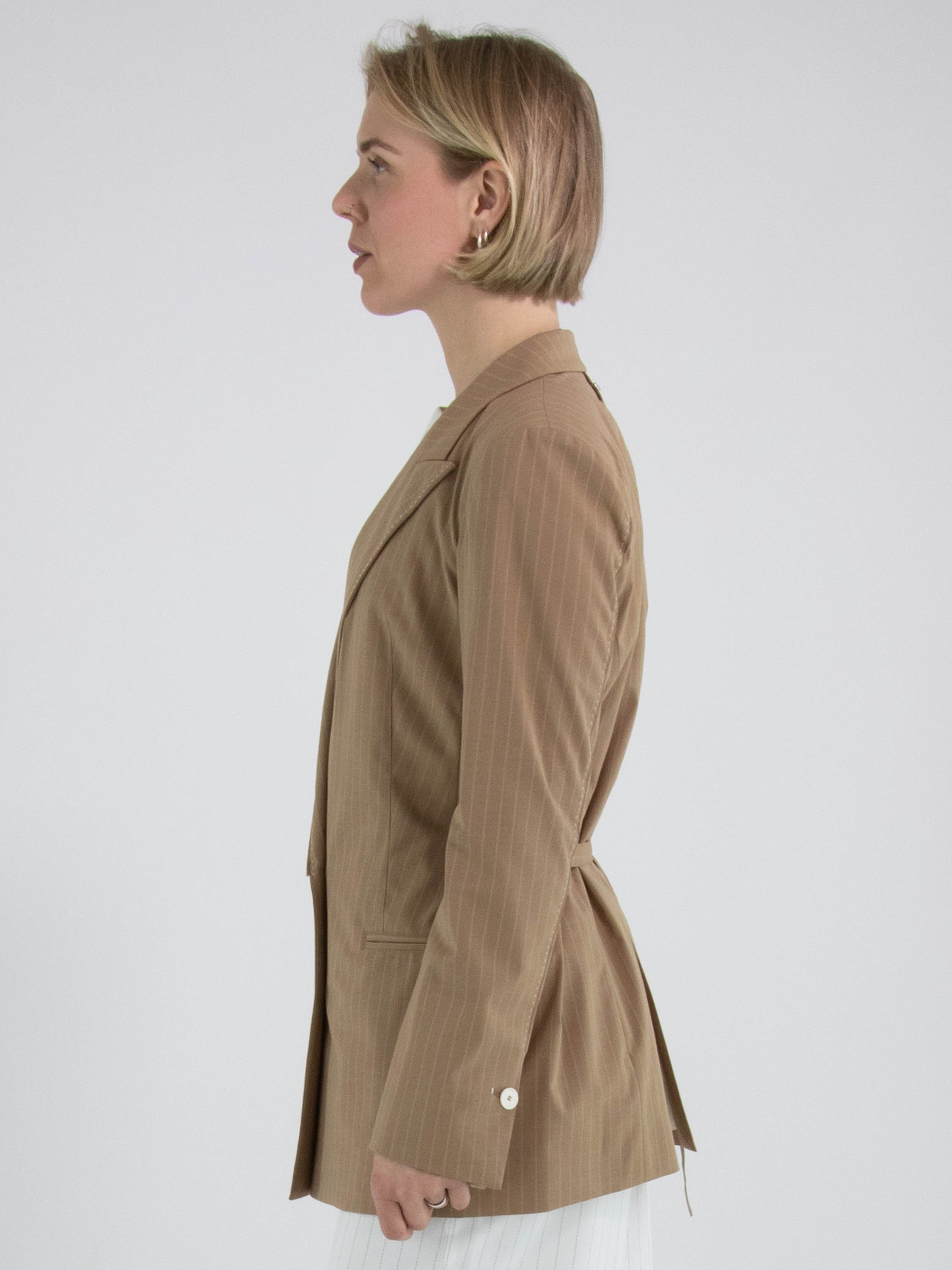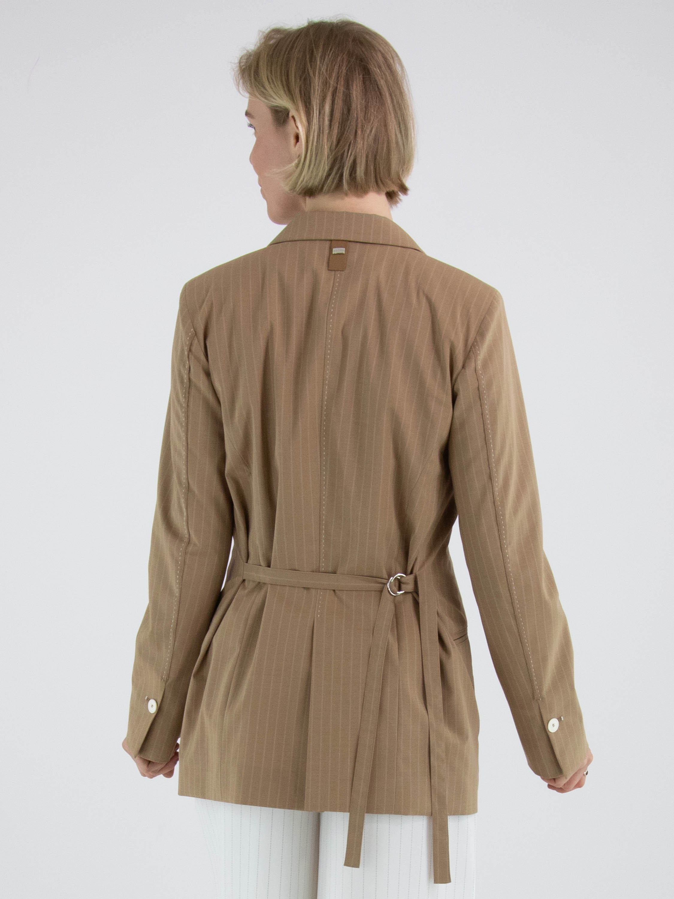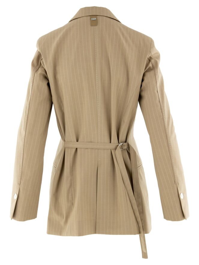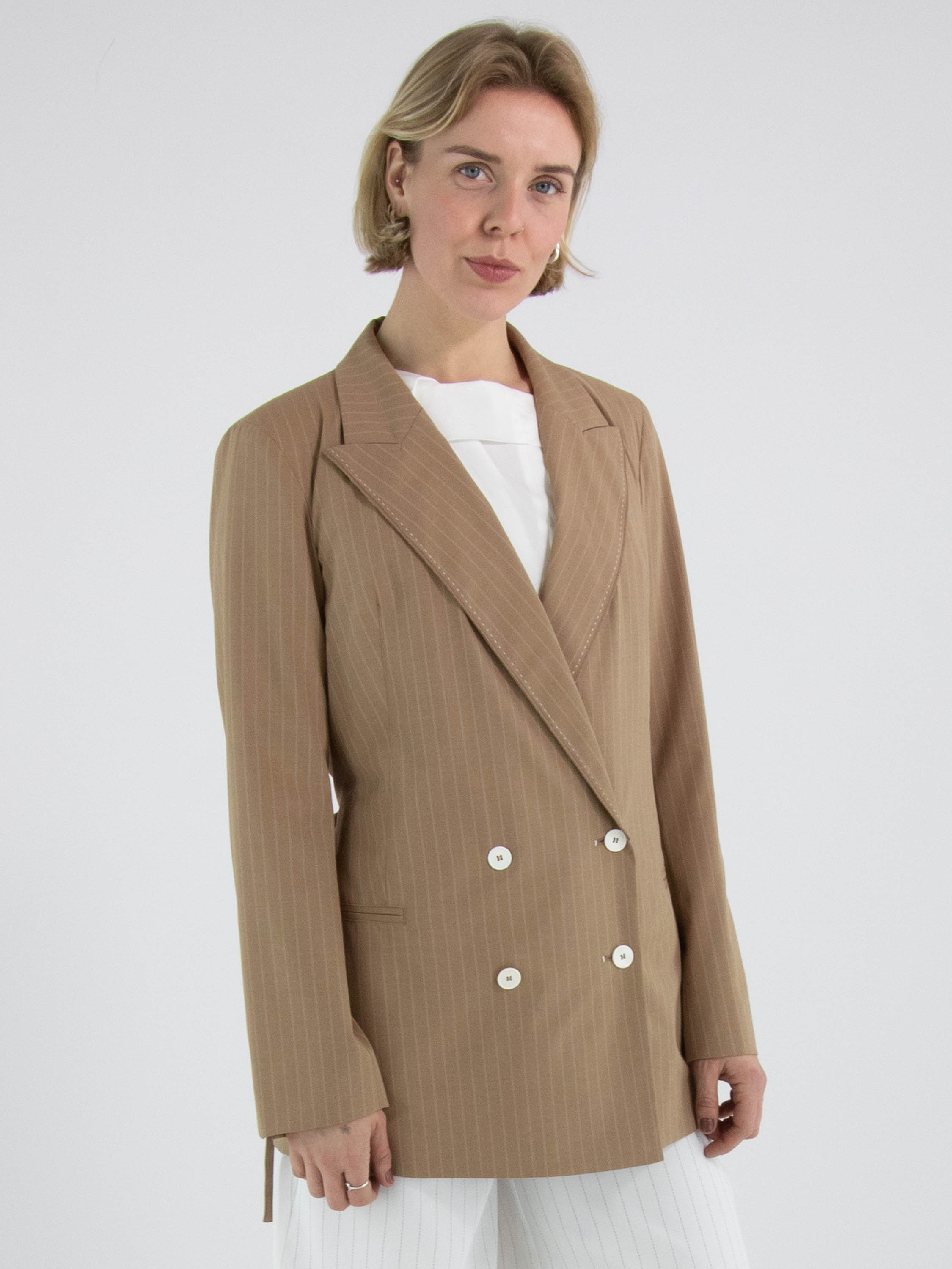 Ein doppelreihiger Blazer von High in einer Kreidestreifenstruktur in Camel. Entlang der Reverskanten und mittig auf der Rückseite verläuft eine dekorative weiße Ziernaht. Der Blazer hat cremeweiße Knöpfe und ist vollständig gefüttert. Auf der Rückseite befindet sich auf Taillenhöhe ein Band aus dem gleichen Stoff wie der Blazer mit einer silberfarbenen Schnalle, um optional eine leicht taillierte Silhouette zu erzielen. Dieser Blazer darf nicht gewaschen werden.