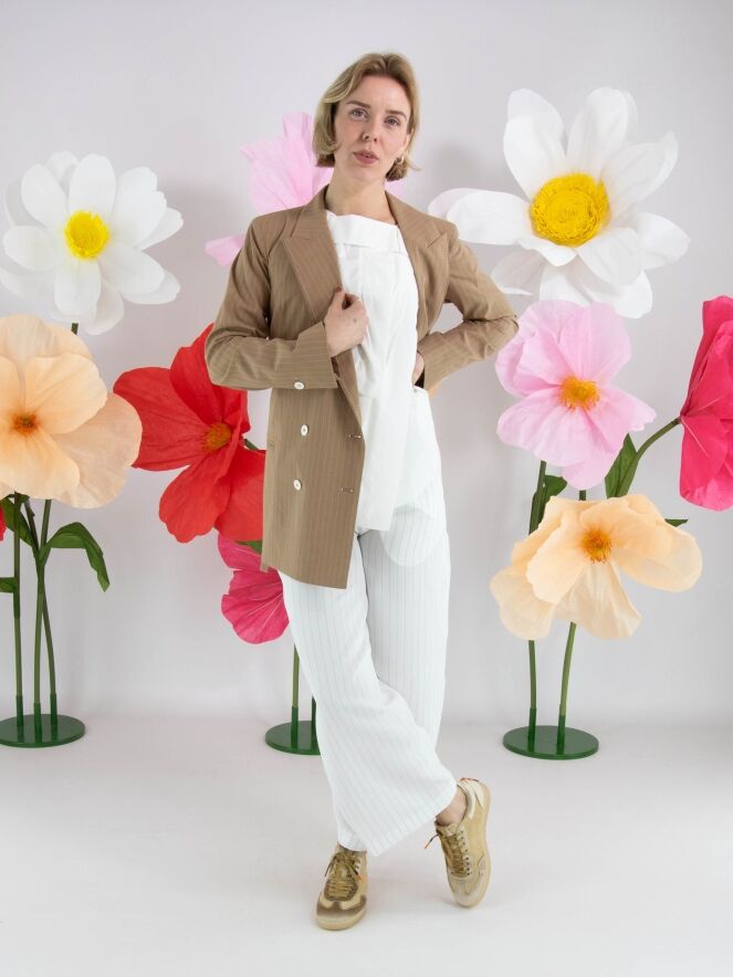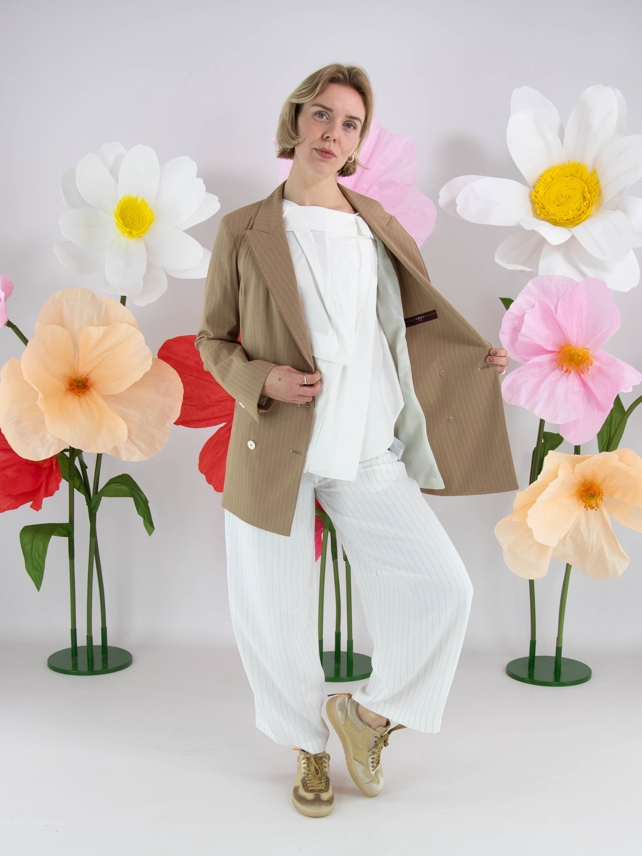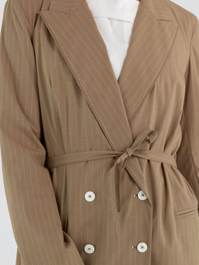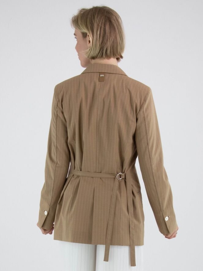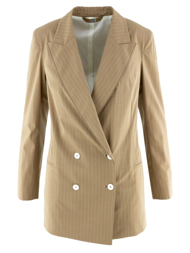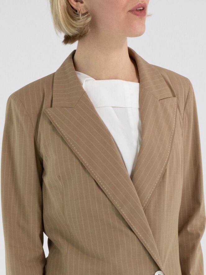 Ein doppelreihiger Blazer von High in einer Kreidestreifenstruktur in Camel. Entlang der Reverskanten und mittig auf der Rückseite verläuft eine dekorative weiße Ziernaht. Der Blazer hat cremeweiße Knöpfe und ist vollständig gefüttert. Auf der Rückseite befindet sich auf Taillenhöhe ein Band aus dem gleichen Stoff wie der Blazer mit einer silberfarbenen Schnalle, um optional eine leicht taillierte Silhouette zu erzielen. Dieser Blazer darf nicht gewaschen werden.