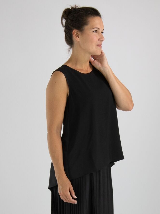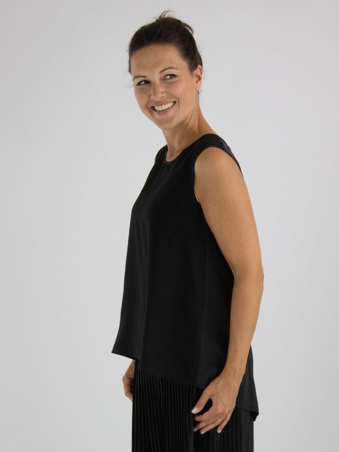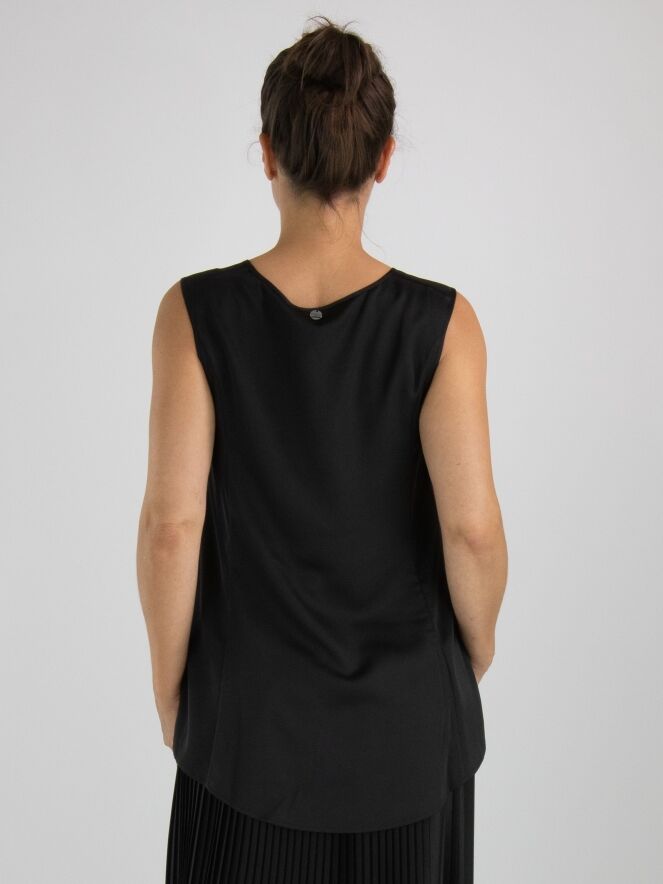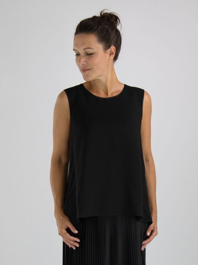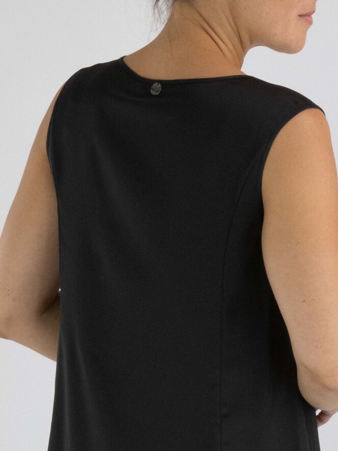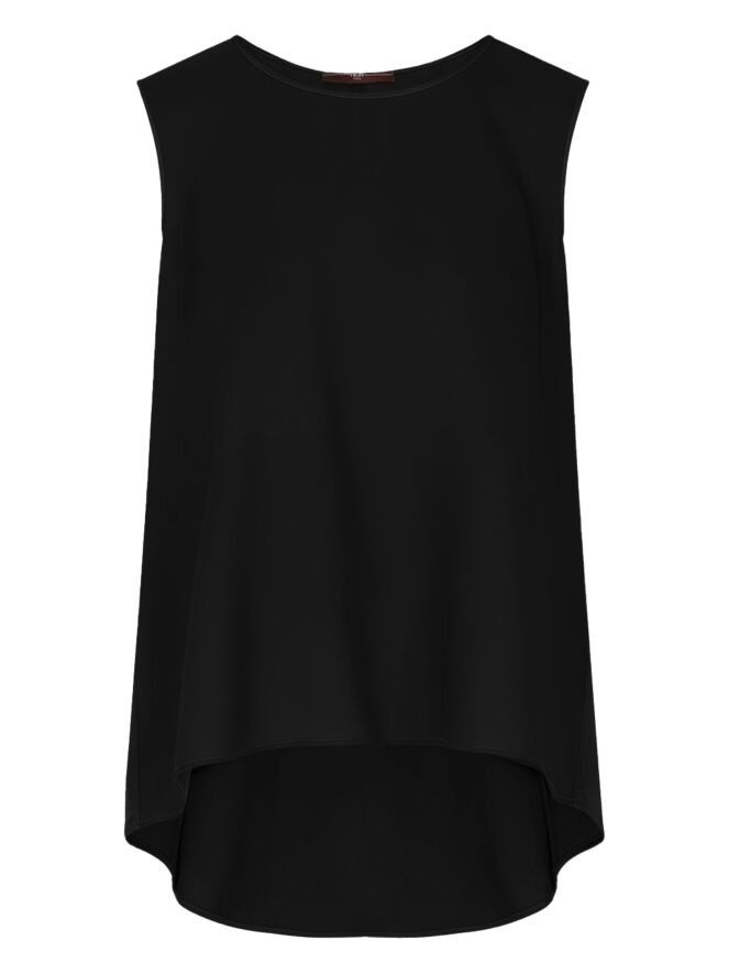 Ein Top von High in Schwarz. Das Top hat einen runden Halsausschnitt und eine leichte A-Linien-Form. Die Vorderseite ist matt und die Rückseite aus mattem Satin. Dieses Top kann von Hand gewaschen werden.