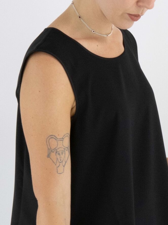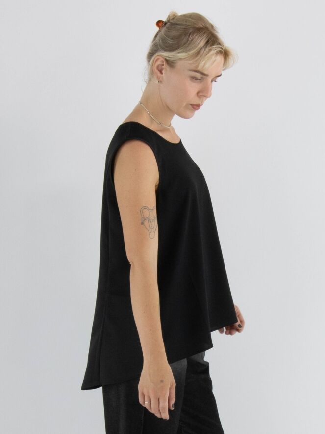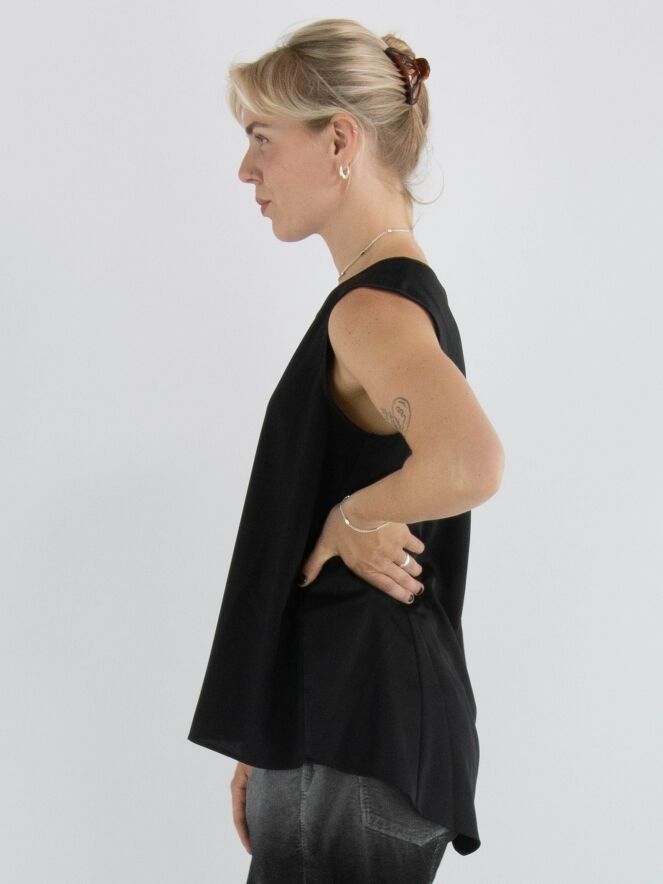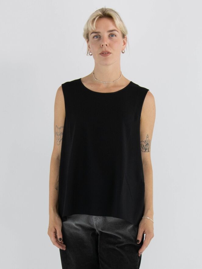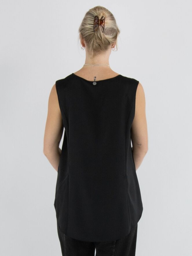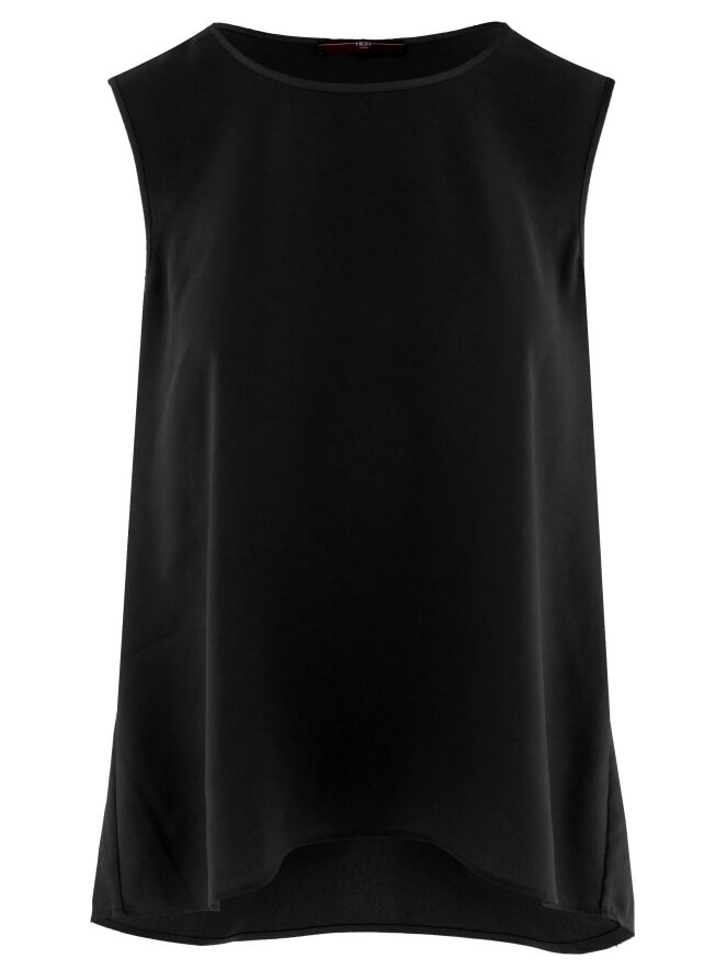 Top von High in Schwarz. Sie hat einen runden Ausschnitt und eine dezente A-Linie. Die Vorderseite besteht aus mattem Stoff, die Rückseite aus mattem Satin. Dieses Top sollte von Hand gewaschen werden.