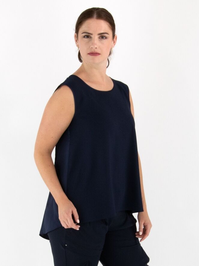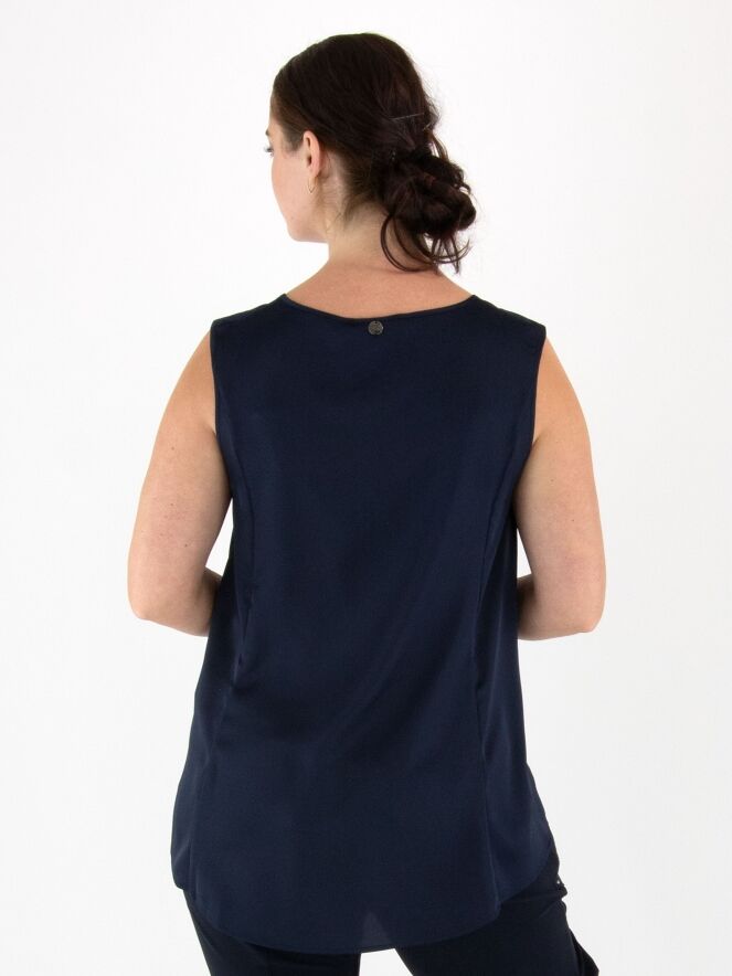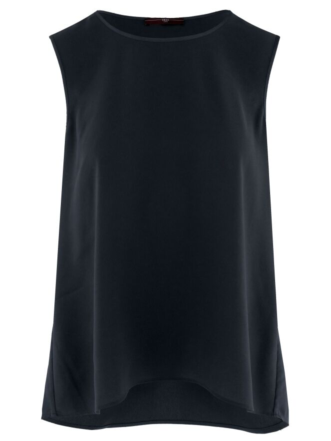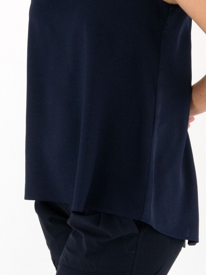 Top von High in Marineblau. Sie hat einen runden Ausschnitt und eine dezente A-Linie. Die Vorderseite besteht aus mattem Stoff, die Rückseite aus mattem Satin. Dieses Top sollte von Hand gewaschen werden.