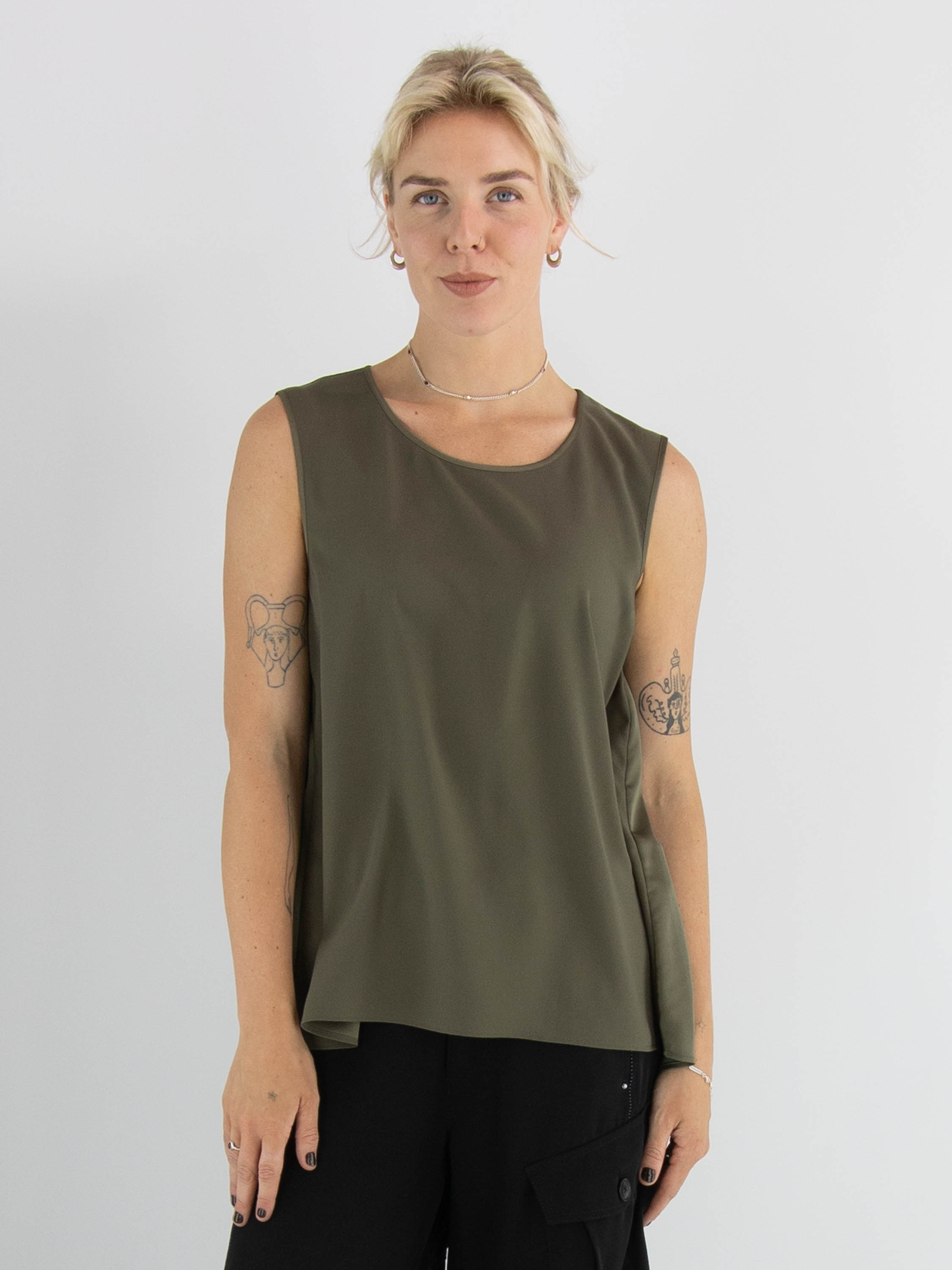 Top von High in Olivgrün. Das Modell hat einen runden Ausschnitt und eine dezente A-Linie. Die Vorderseite ist matt, die Rückseite besteht aus mattem Satin. Dieses Top sollte von Hand gewaschen werden.