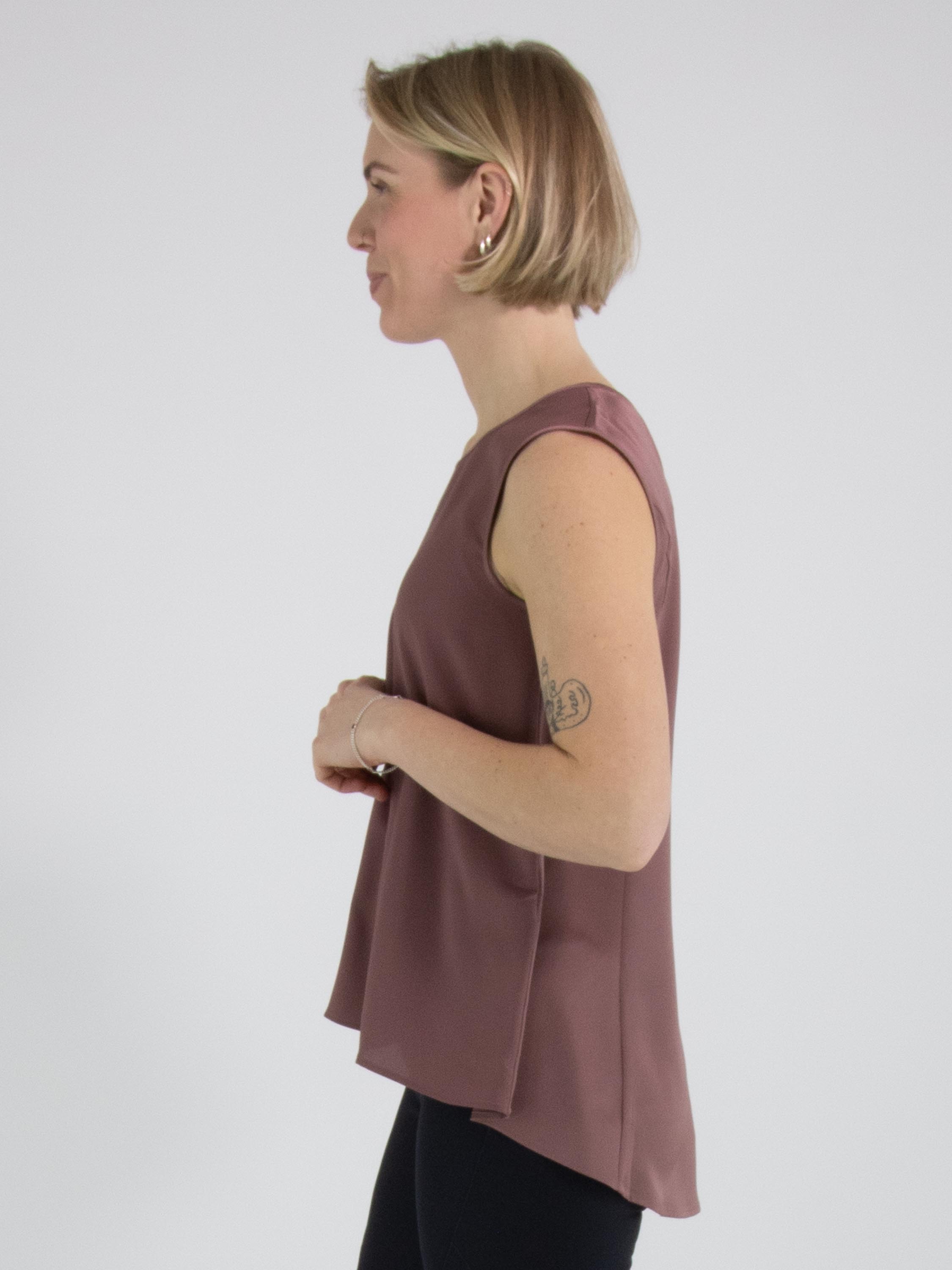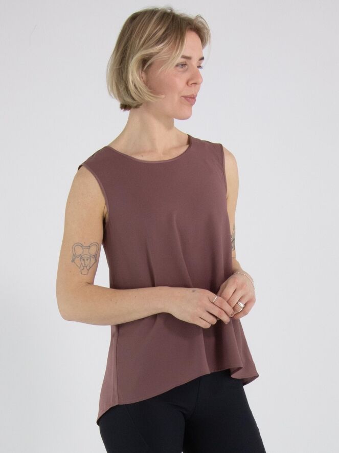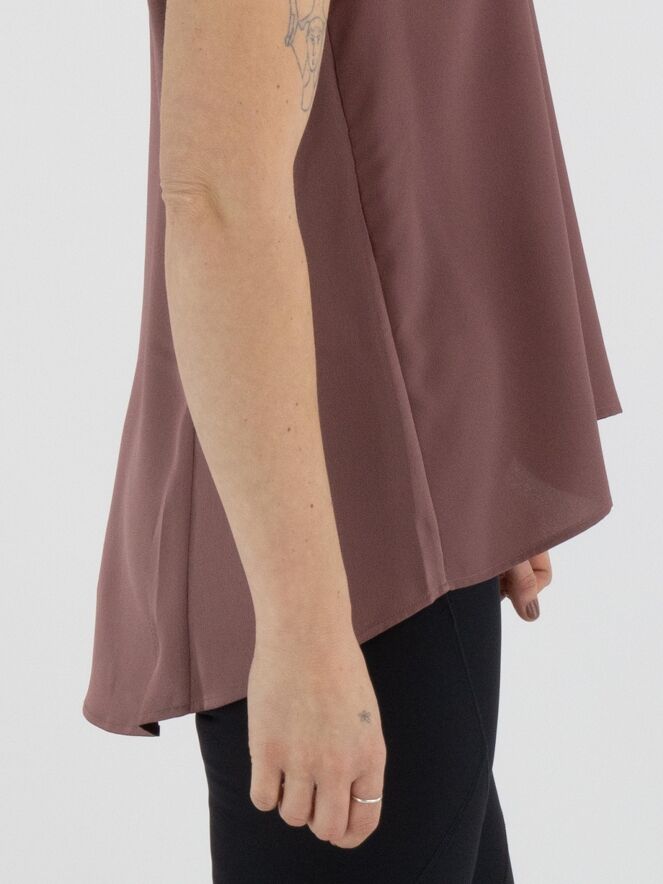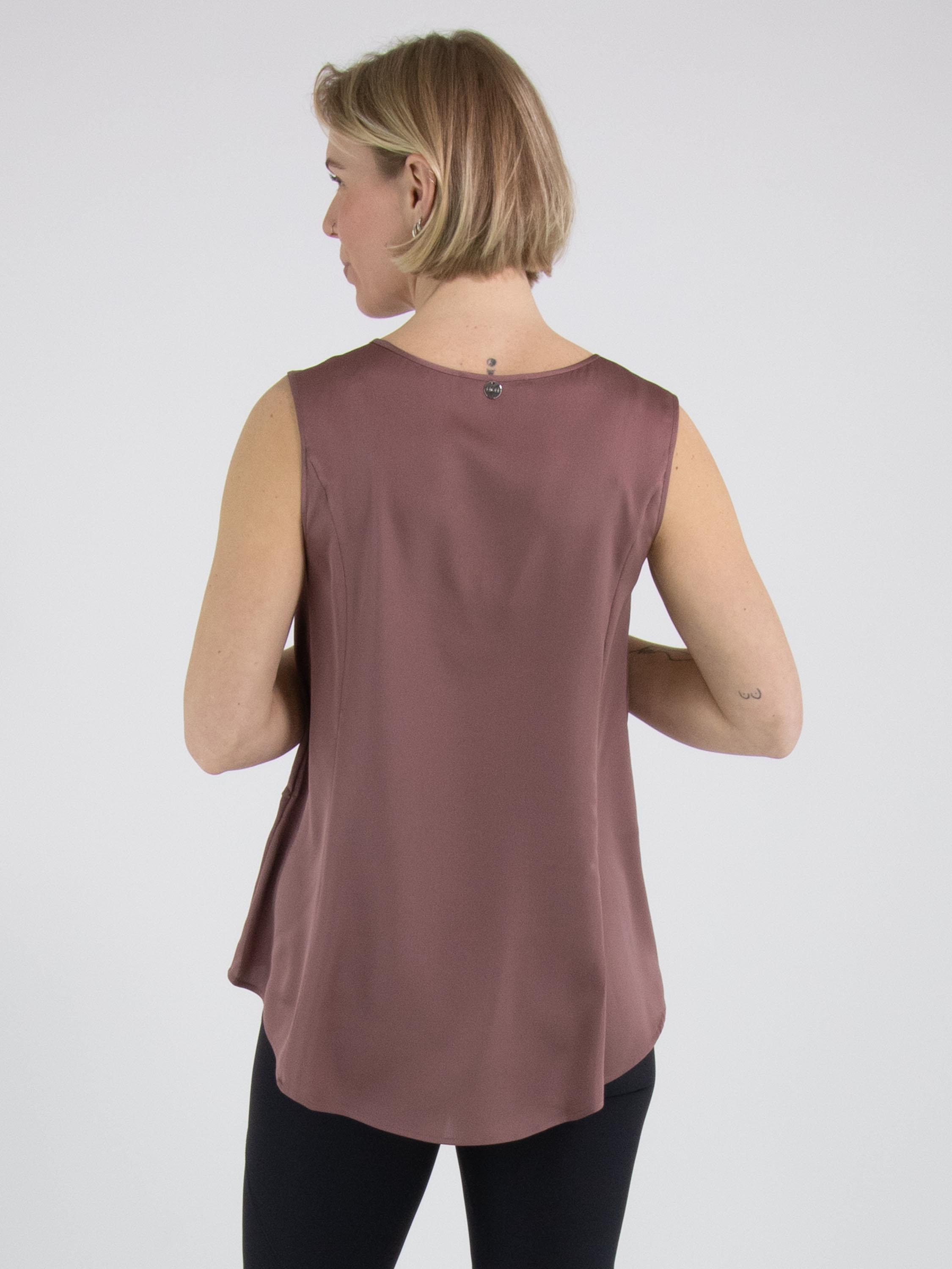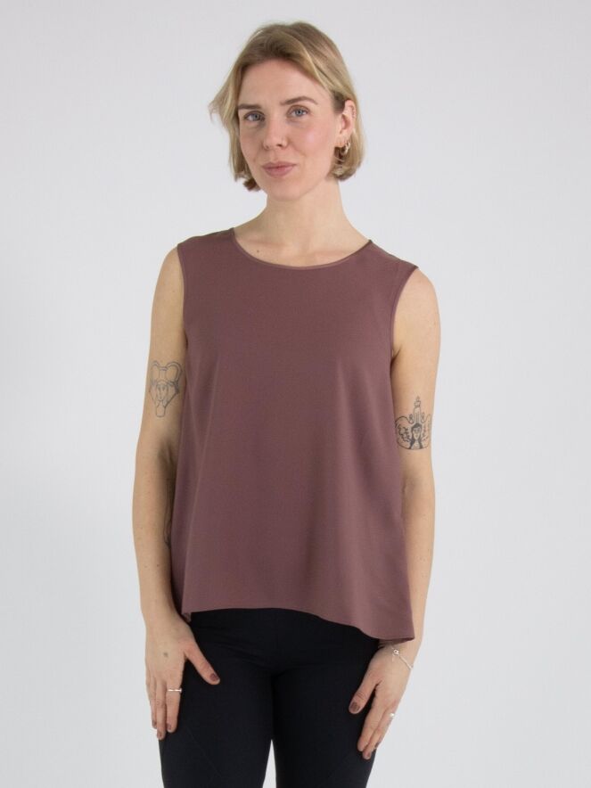Ein Top von High in der Farbe Mauve. Das Top hat einen Rundhalsausschnitt und eine leichte A-Linie. Die Vorderseite ist aus einem matten Stoff gefertigt, während die Rückseite aus mattem Satin besteht. Dieses Top kann per Hand gewaschen werden.