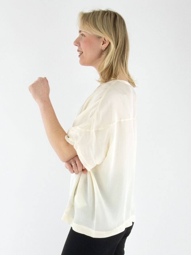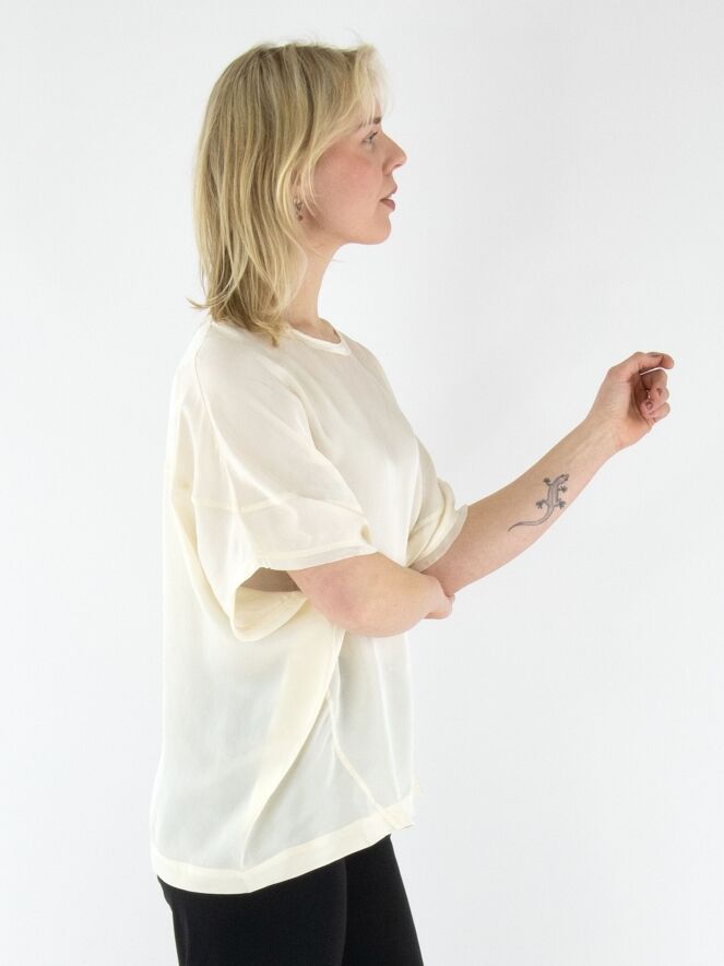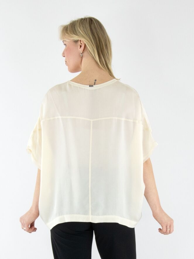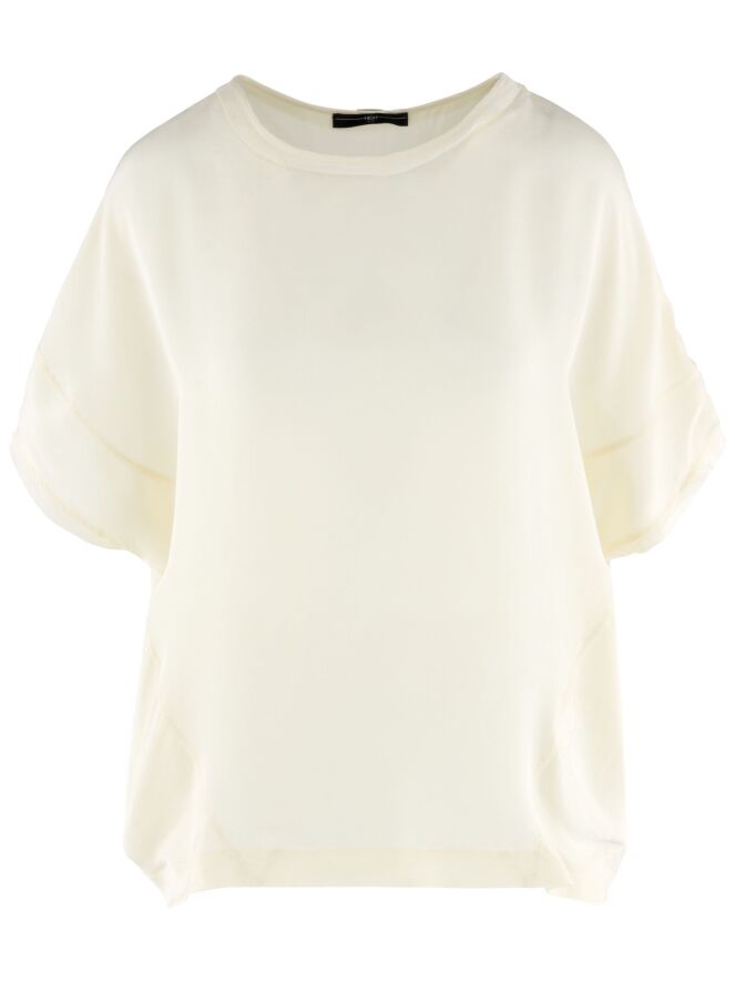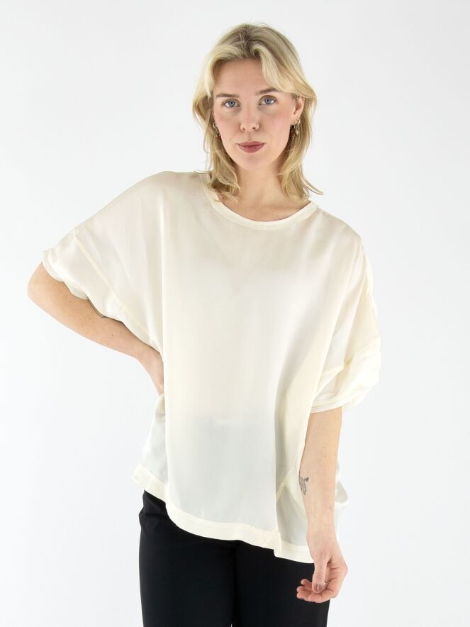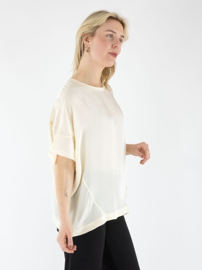 Ein matt satiniertes Shirt von High in Cremeweiß. Entlang des Randes des runden Ausschnitts und an den Abschlüssen der kurzen Ärmel befindet sich eine Voile-Biese. Dieses Shirt sollte von Hand gewaschen werden.