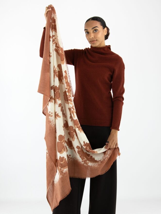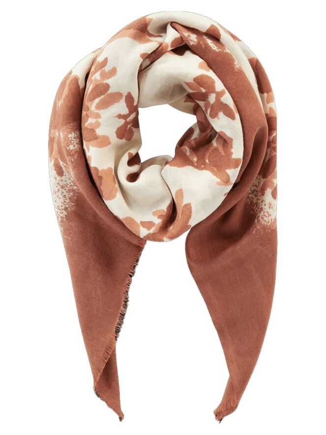 Luxuriöses, leicht transparentes Tuch von High mit einem grafischen Muster in verschiedenen Braun- und Cremeweißtönen. Die Ränder sind fein ausgefranst. Dieses Tuch darf nicht gewaschen werden.