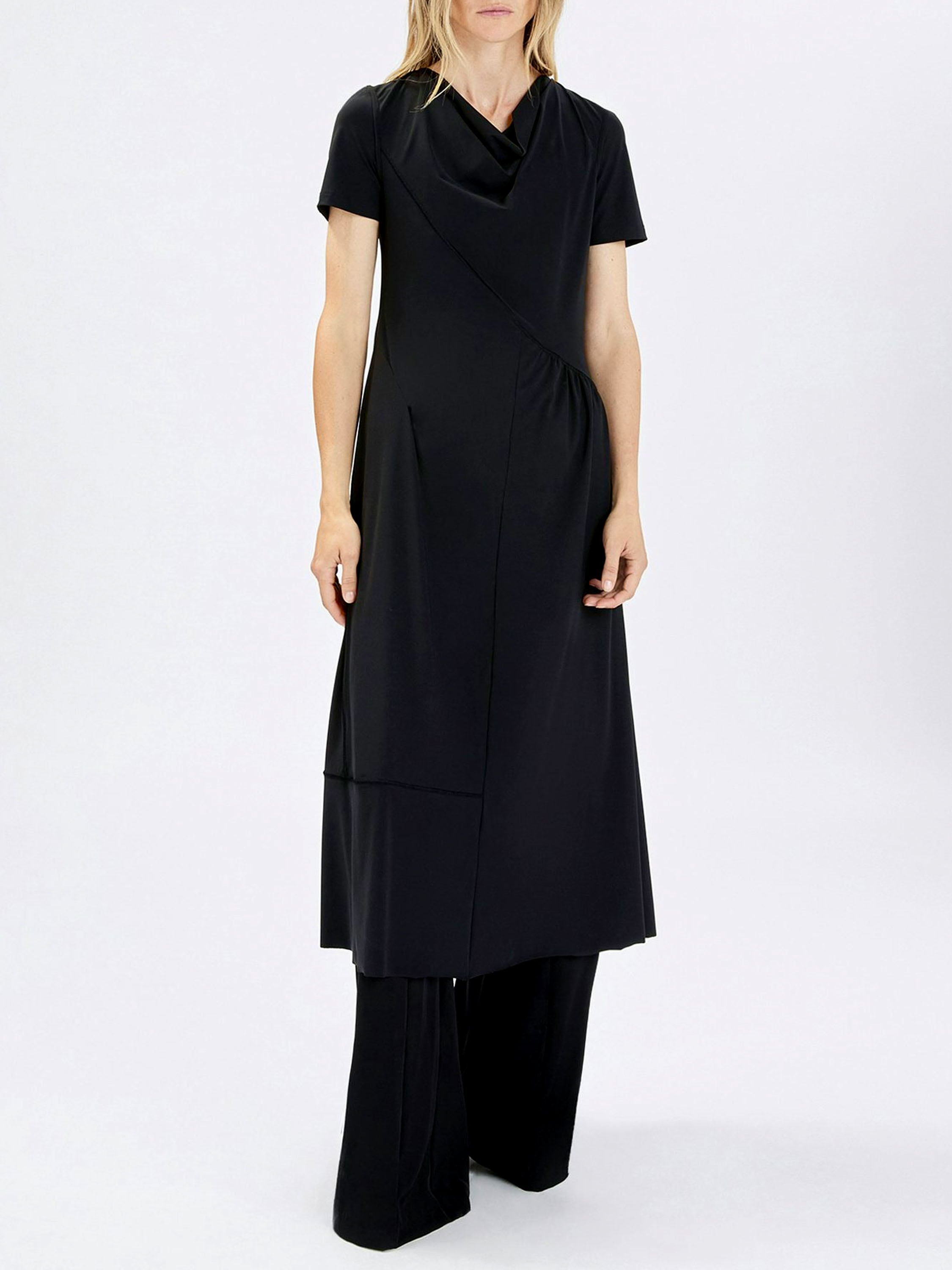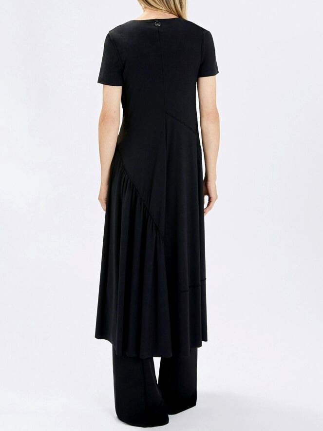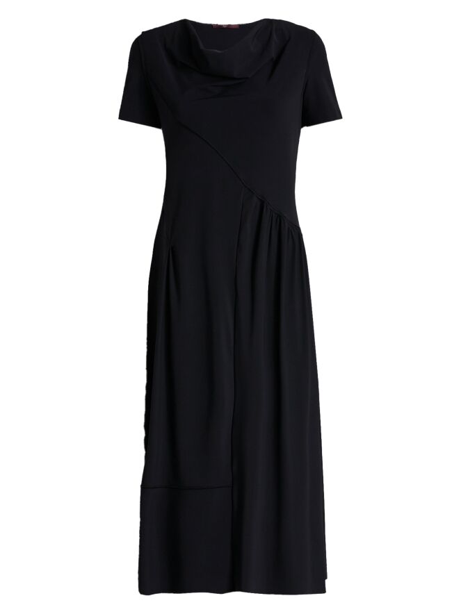 Kleid von High in einem eleganten Marineblau. Mit weich fallendem Ausschnitt und kurzen Ärmeln überzeugt es durch eine feminine, fließende Ausstrahlung. Eine diagonale Naht verläuft von der linken Schulter zur rechten Taillenseite. Unterhalb dieser Naht ist der Stoff auf Taillenhöhe fein gefältelt und setzt einen raffinierten Akzent. Ab der Taille fällt das Kleid in einer schmeichelnden A-Linie weit aus. Dieses exklusive Designerkleid kann bei 30 Grad gewaschen werden.
