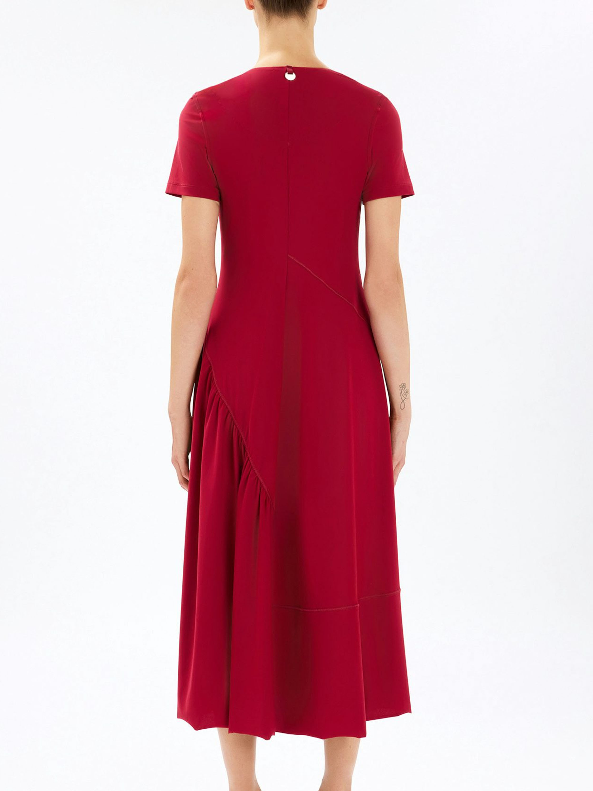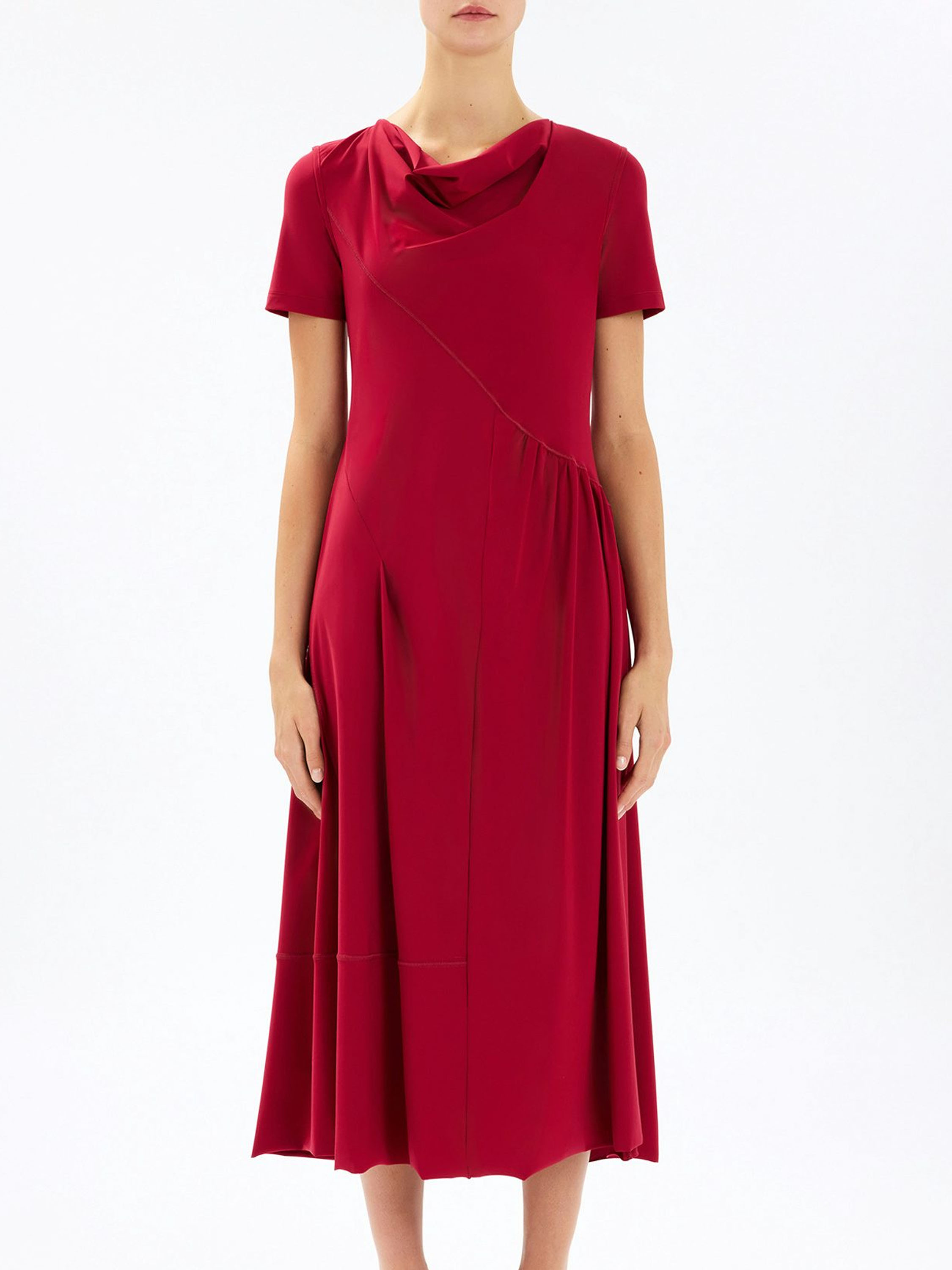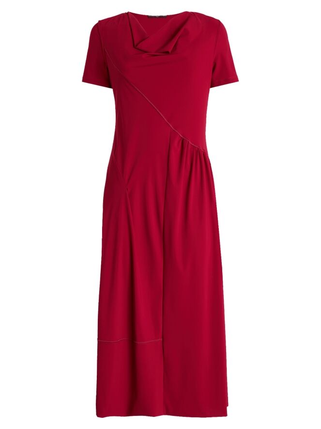 Kleid von High in einem intensiven Himbeerrot. Mit weich fallendem Ausschnitt und kurzen Ärmeln gearbeitet, verläuft eine diagonale Naht von der linken Schulter zur rechten Taillenseite. Unterhalb dieser Naht ist der Stoff fein gefältelt und setzt einen dezenten, femininen Akzent. Ab der Taille fällt das Kleid in einer schmeichelnden A-Linie weit aus. Dieses exklusive Designerkleid kann bei 30 Grad gewaschen werden.