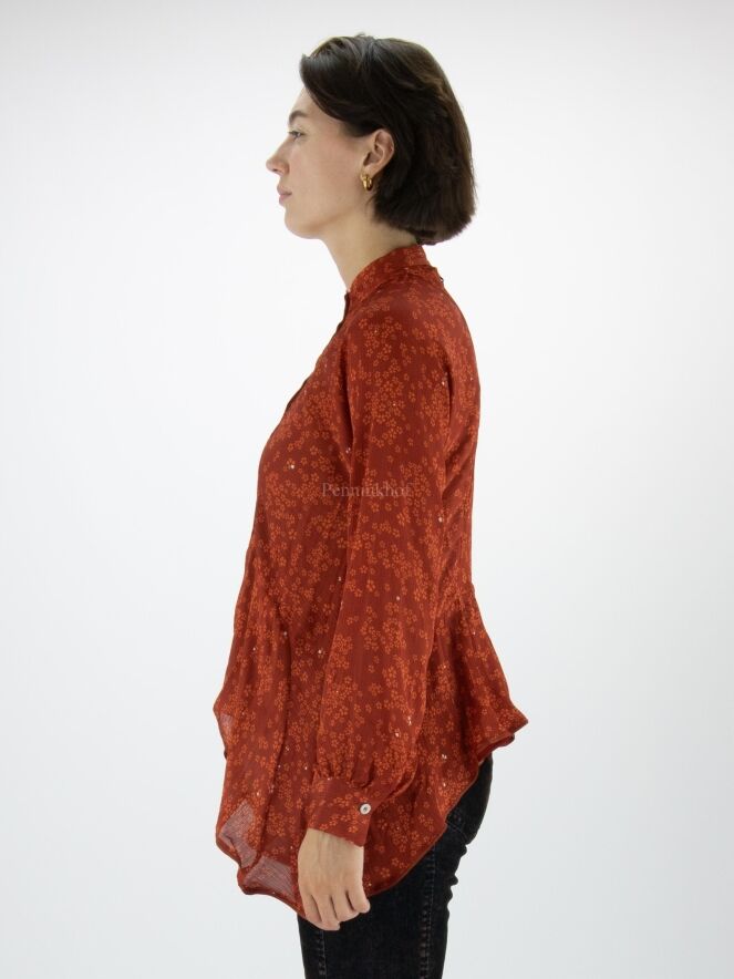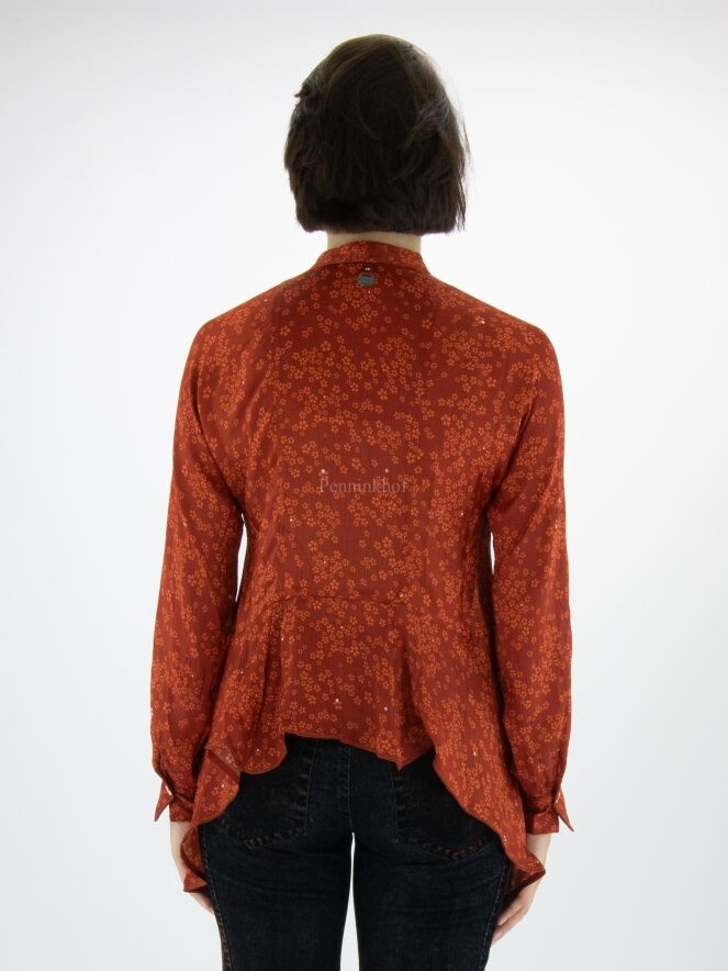 High's Bluse mit Blumendruck in den Farben hellrot auf rotem Grund. Auf Höhe der Taille befindet sich eine Steppnaht. Ab der Steppnaht hat die Bluse auf beiden Seiten mehr Stoff. Diese Bluse kann bei 30 Grad gewaschen werden.