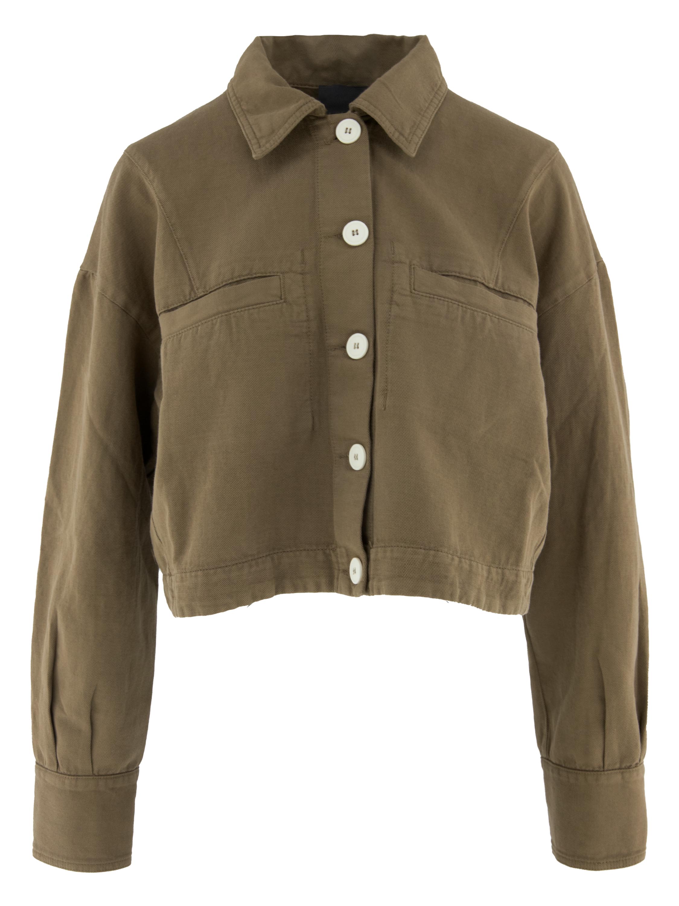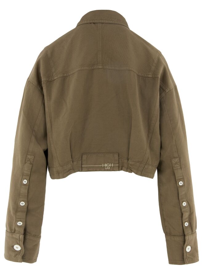 Kurzer Blazer von High in einem Olivgrün. Der Blazer wird mit fünf Knöpfen geschlossen und überzeugt durch eine moderne, markante Silhouette. Die Ärmel sind mit einer Knopfleiste versehen, die entlang des Unterarms bis zu den Manschetten verläuft und dem Design ein besonderes, elegantes Detail verleiht. Der Blazer verfügt über Brusttaschen und kann bei 30 Grad gewaschen werden.