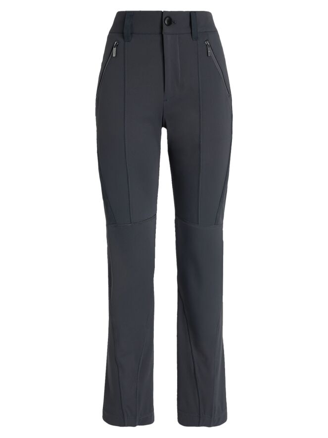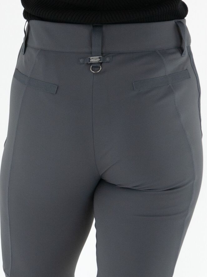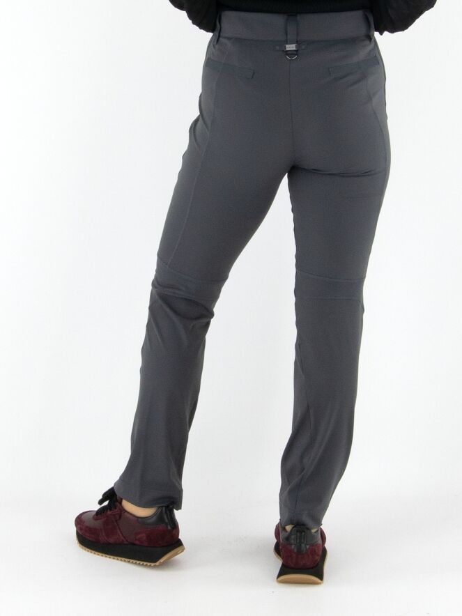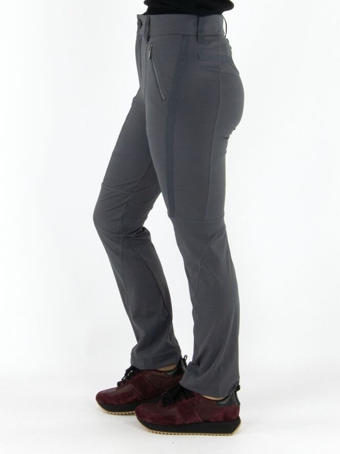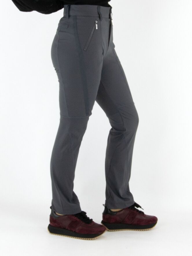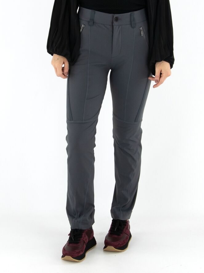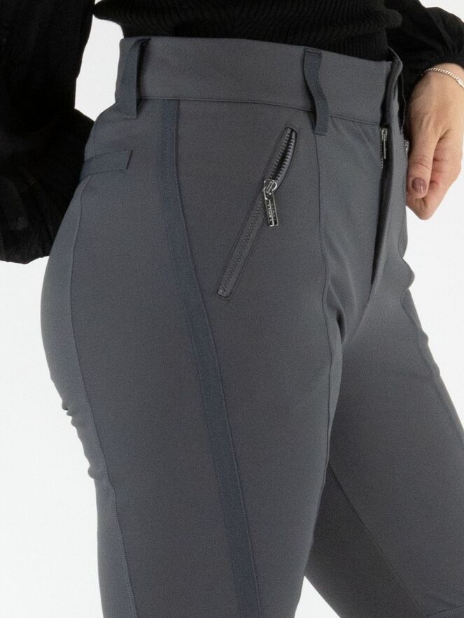 Eine Hose von High in Grau. Die Vordertaschen sind mit Reißverschlüssen versehen. Die Hose ist mit mehreren diagonalen, vertikalen und horizontalen Nähten und Paspeln gearbeitet. Diese Hose kann von Hand gewaschen werden.