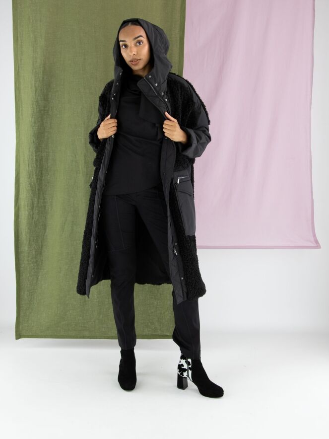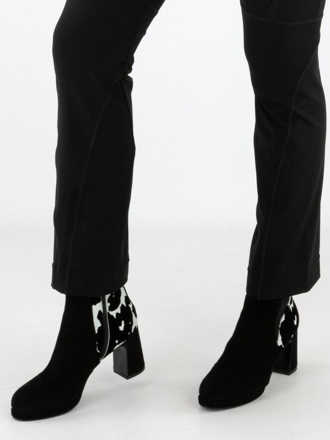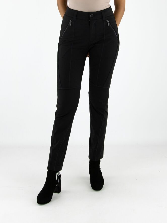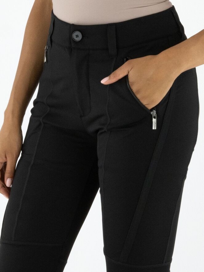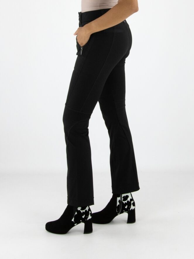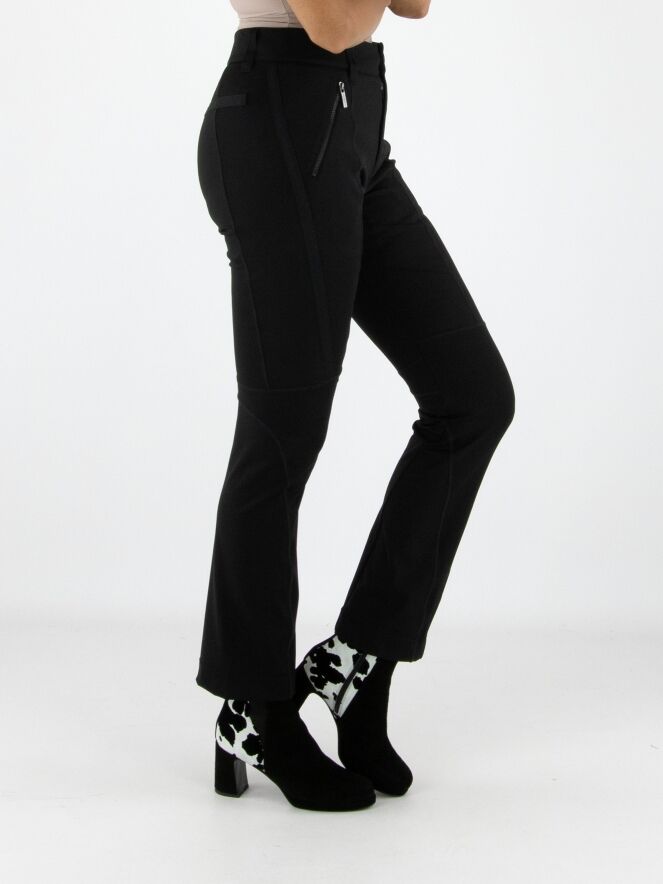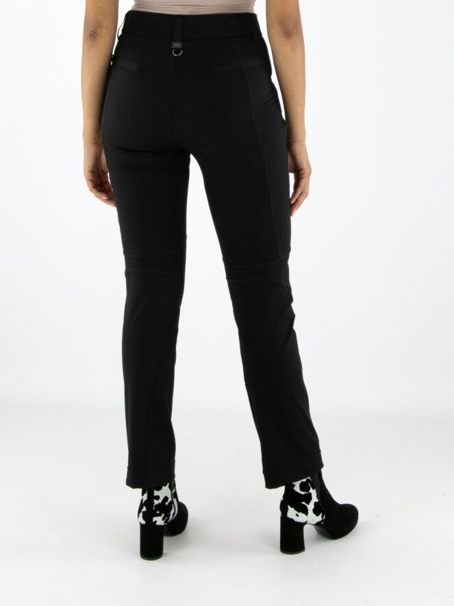 Hose von High in Schwarz. Die Vordertaschen sind mit Reißverschlüssen ausgestattet. Die Hose ist mit mehreren diagonalen, vertikalen und horizontalen Nähten sowie Paspeln verarbeitet. Diese Hose sollte von Hand gewaschen werden.