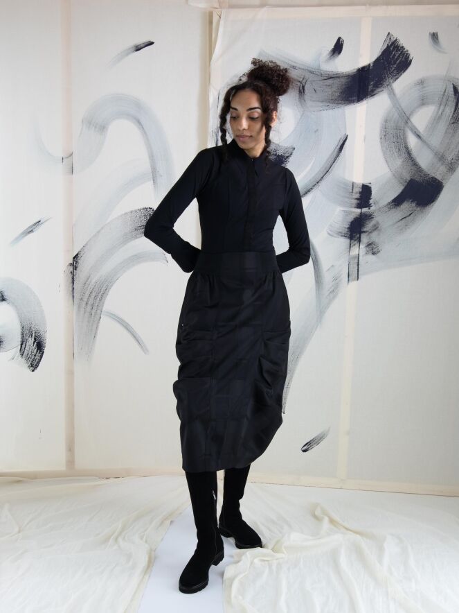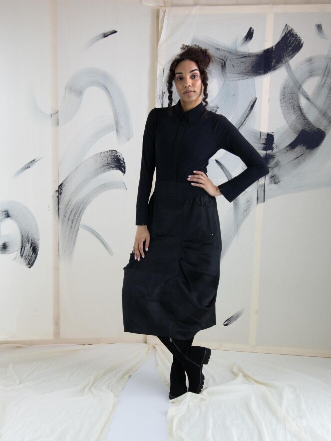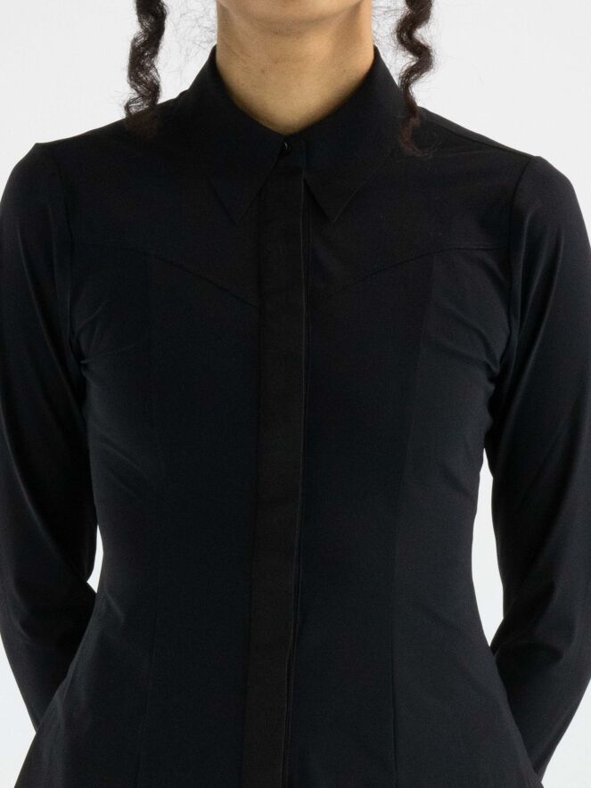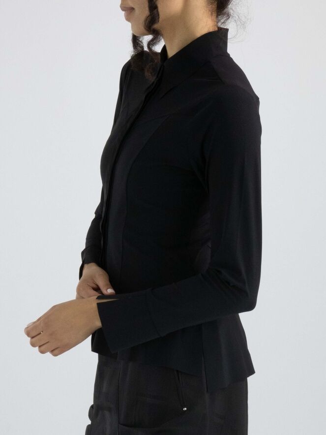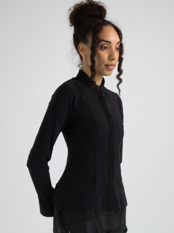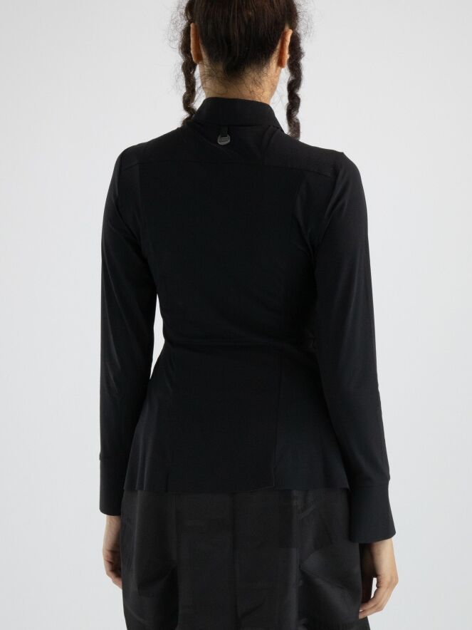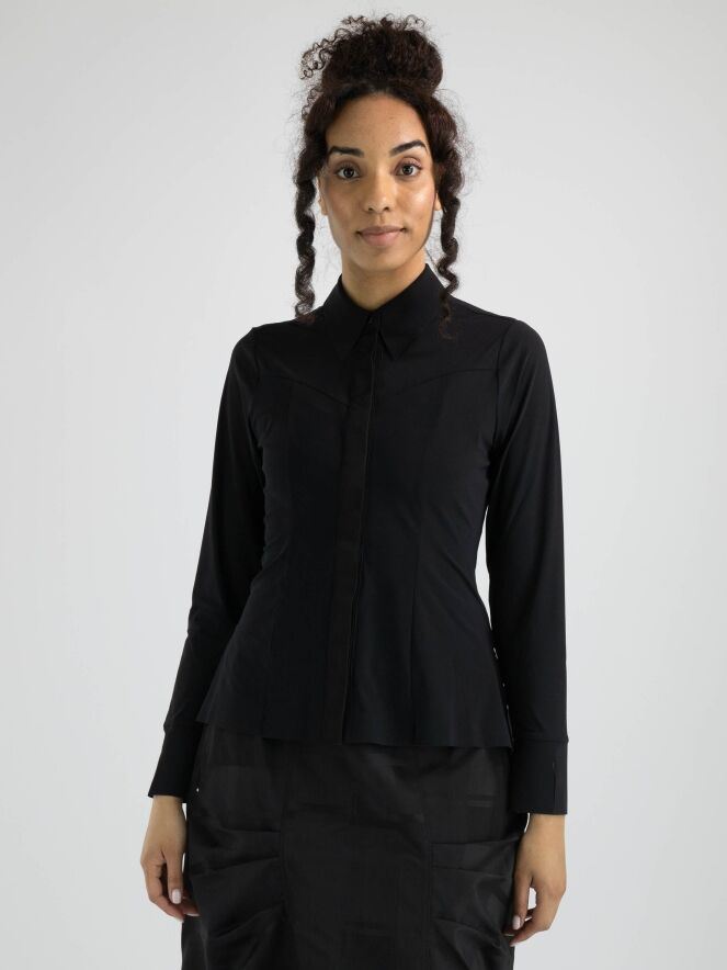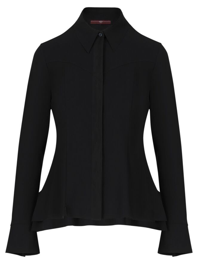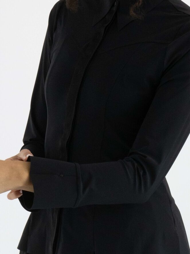 Eine schwarze Bluse von High, die leicht ausgestellt ist. Die langen Ärmel enden mit einem feinen, elastischen V-Schnitt. Diese Bluse kann bei 30 Grad gewaschen werden.