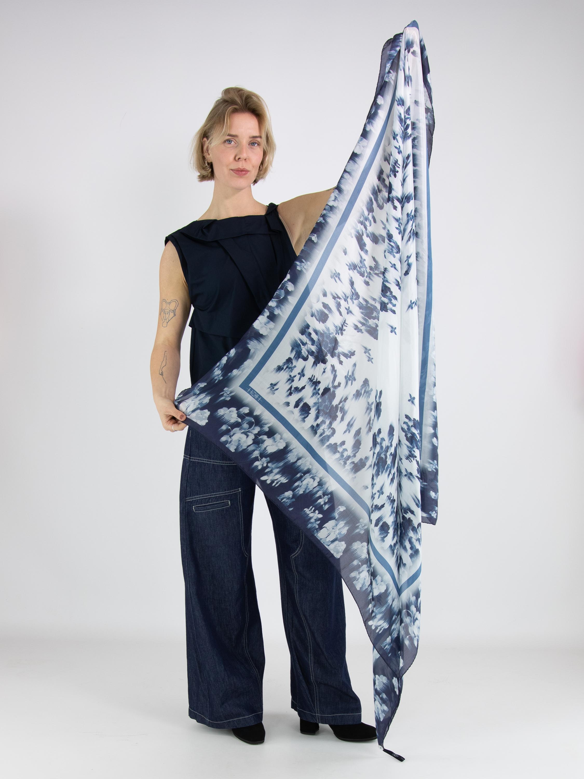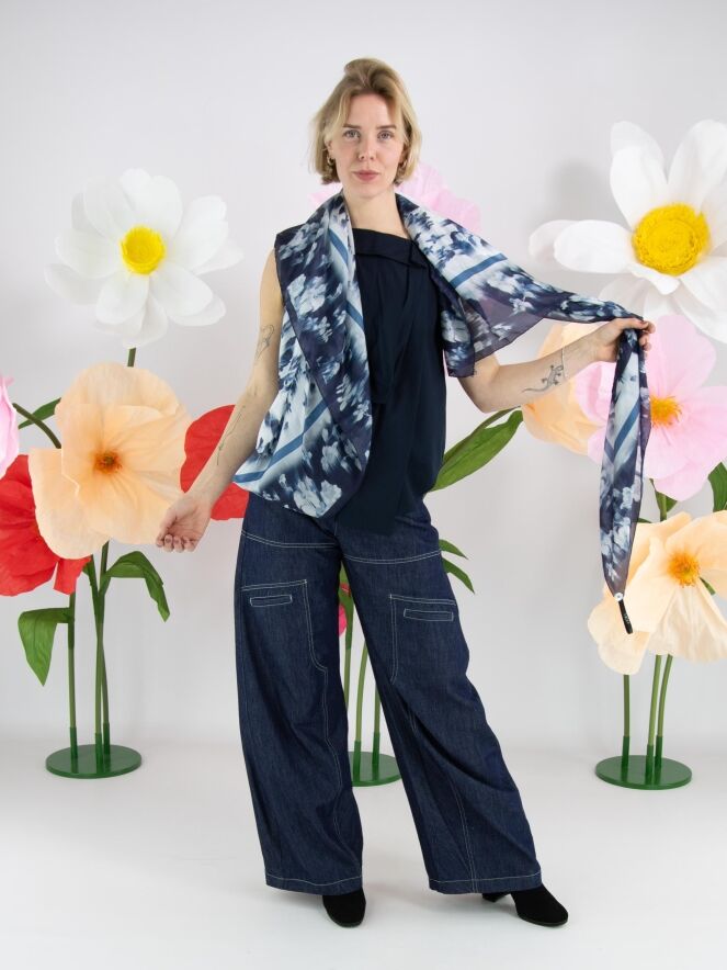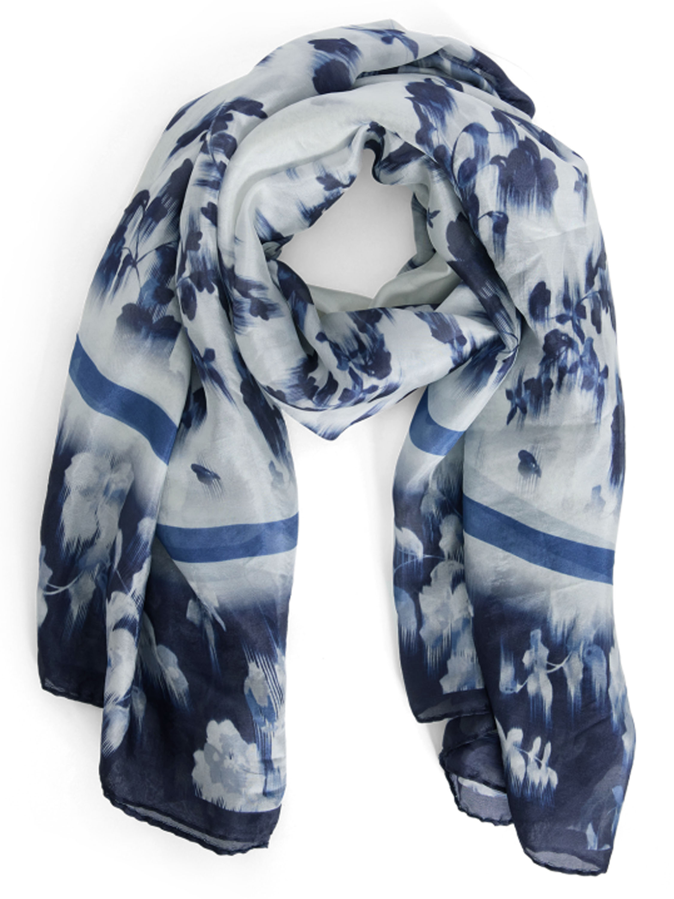 Ein luxuriöser, leicht transparenter Schal mit einem verwischten Blumenprint in mehreren Blau- und Weißtönen. Dieser Schal darf nicht gewaschen werden.
