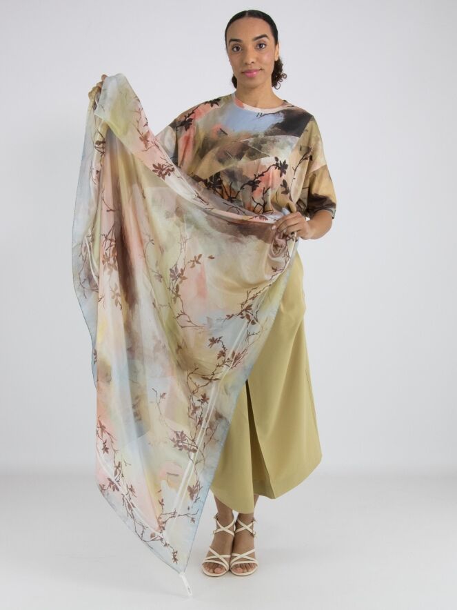 A luxurious lightly sheer shawl from High Tech with a graphic multicolour watercolour print, featuring main tones of various shades of taupe, pastel blue and salmon. This shawl must not be washed.