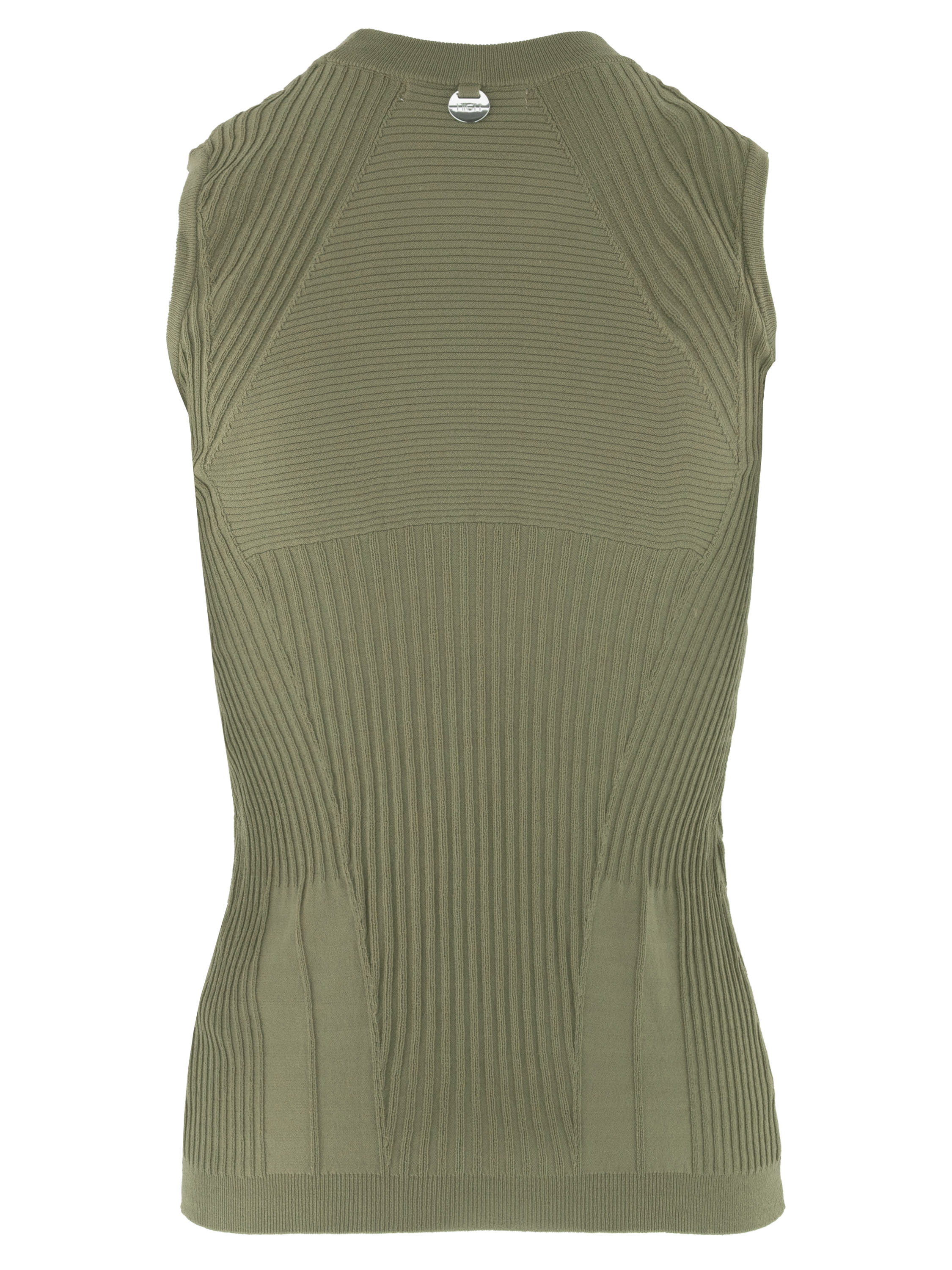 Top von High in einem eleganten Olivgrün. Der Stoff zeichnet sich durch eine besondere Streifenstruktur aus, die horizontal, vertikal und diagonal verläuft und dem Design eine dynamische, moderne Ausstrahlung verleiht. Ein fein gerippter Strickbund am Rundhalsausschnitt sorgt für einen dezent sportiven Abschluss. Dieses exklusive Designertop sollte per Hand gewaschen werden.