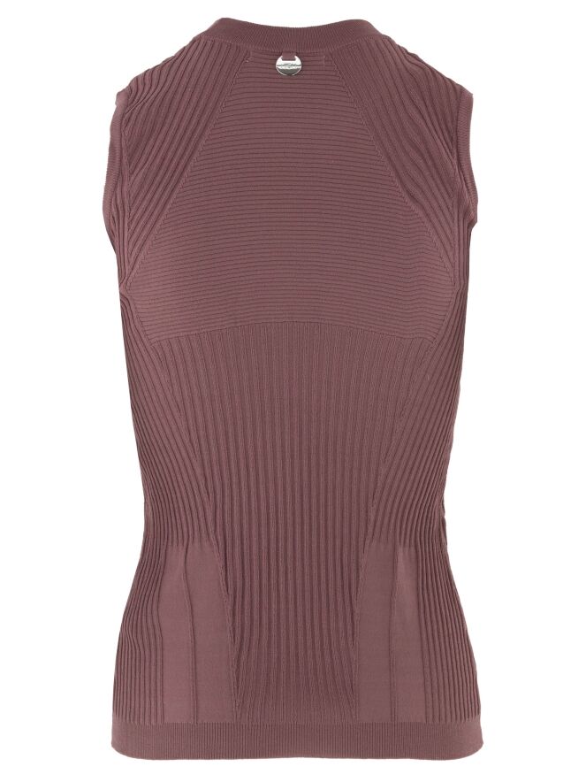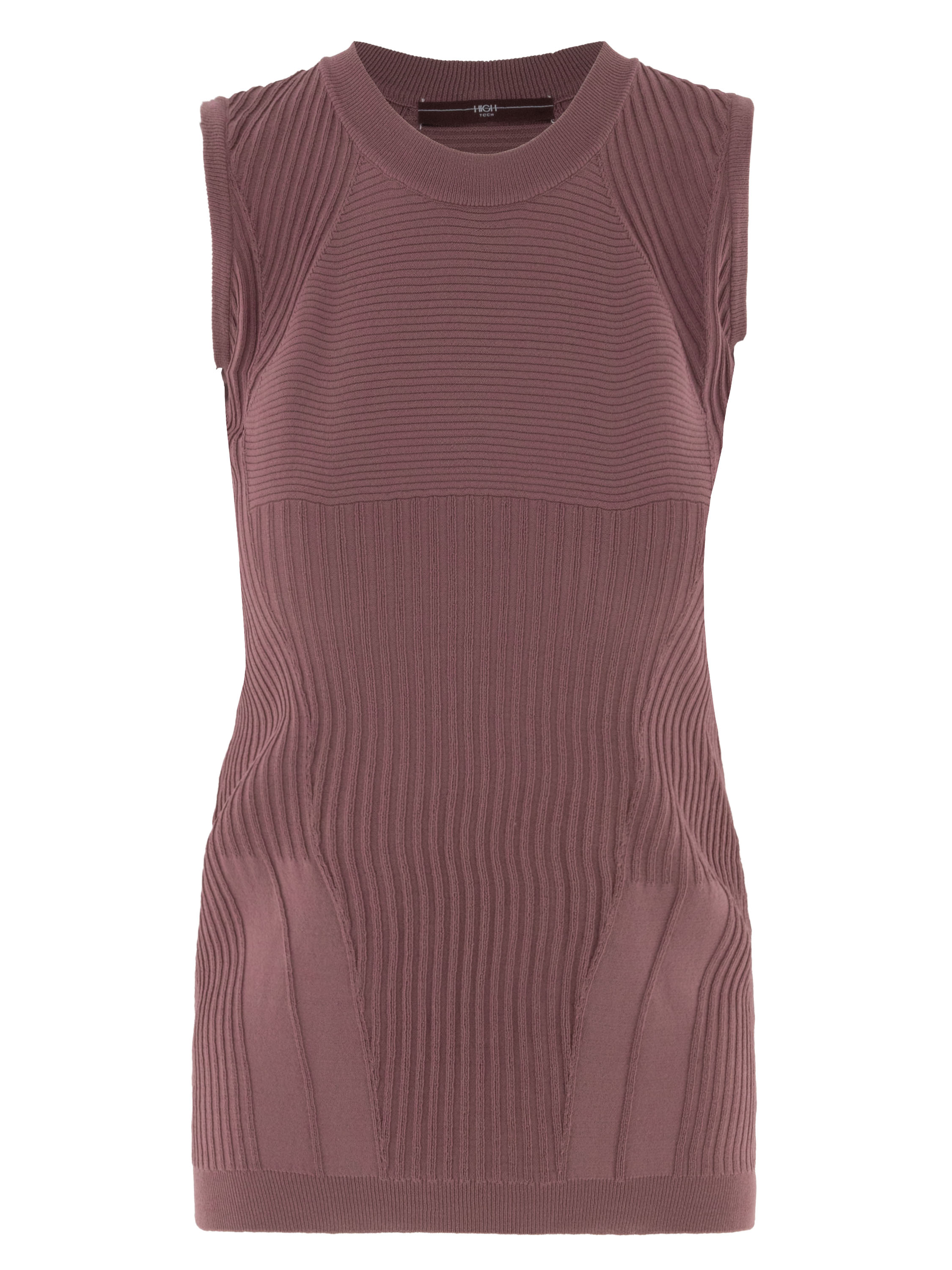 Ein Top von High in Himbeerrot. Das Top hat eine Streifenstruktur, die sowohl horizontal, vertikal als auch diagonal verläuft. Entlang des Randes des Rundhalsausschnitts befindet sich ein fein gerippter Strickbund. Dieses Top kann per Hand gewaschen werden.