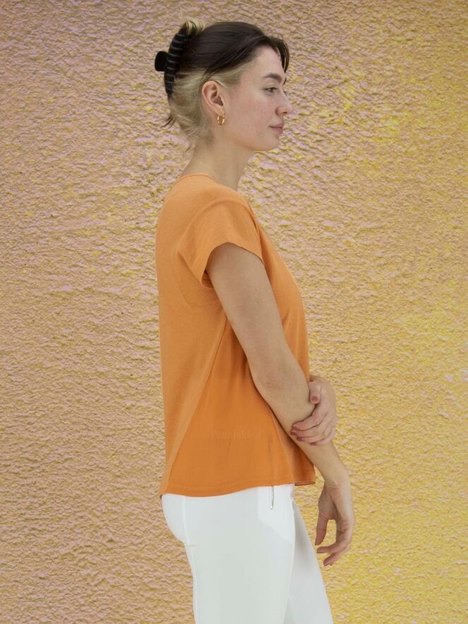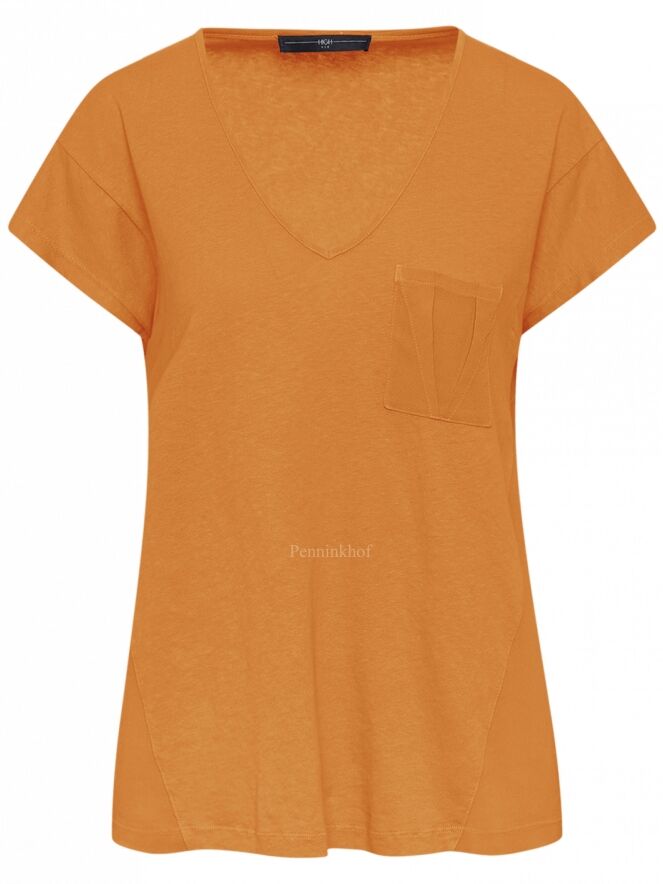 Ein Shirt der Designermarke High in Orange. Das Shirt hat einen V-Ausschnitt. Die Brusttasche und die Seiten sind aus einem leicht transparenten Kreppstoff. Dieses Shirt darf von Hand gewaschen werden.