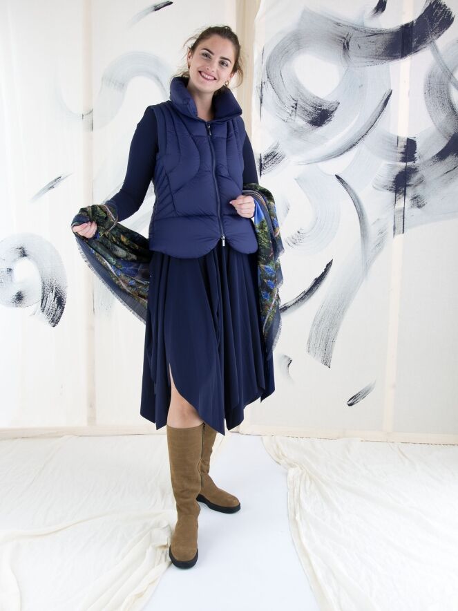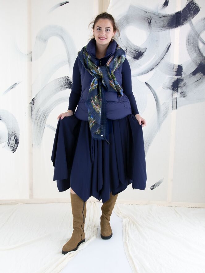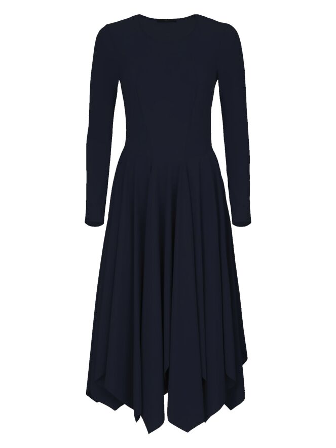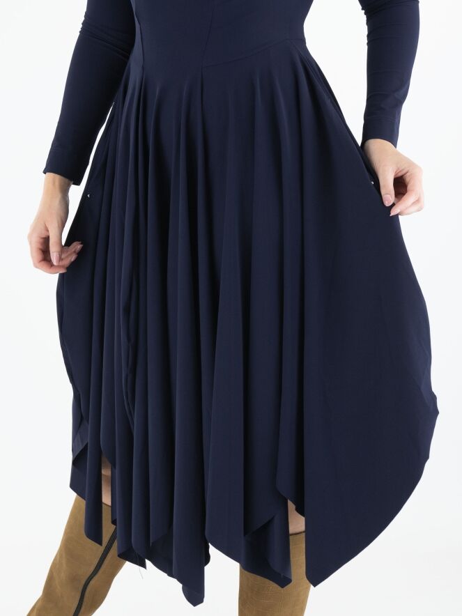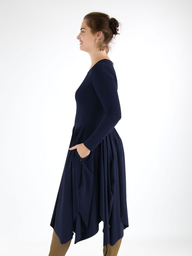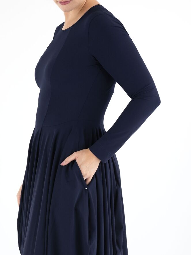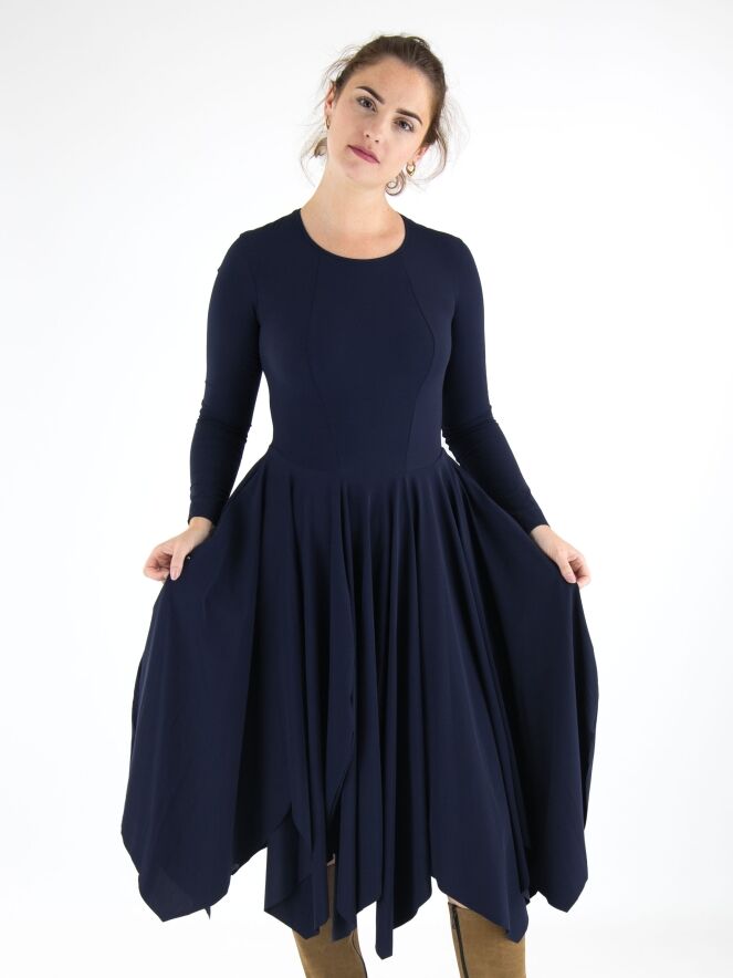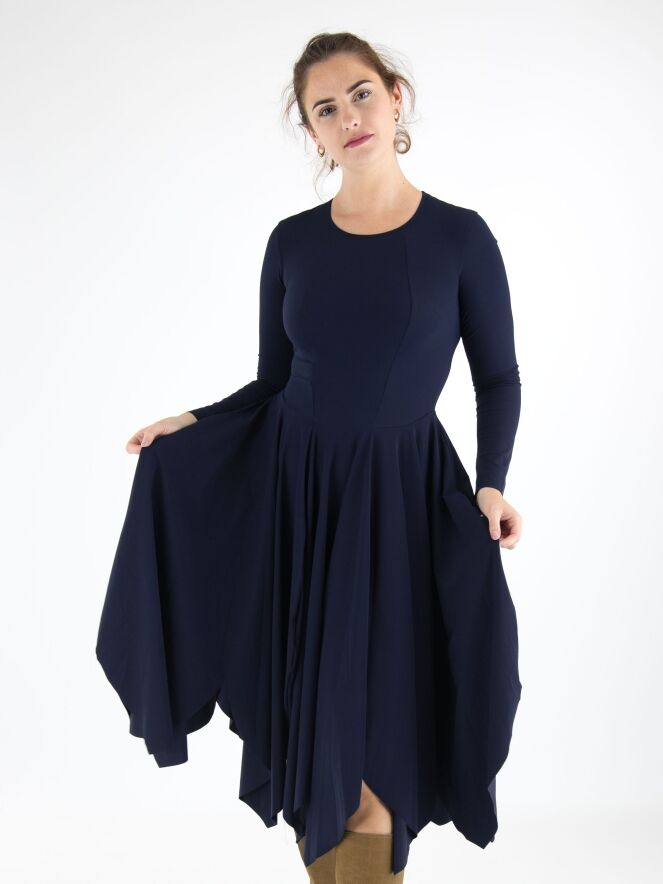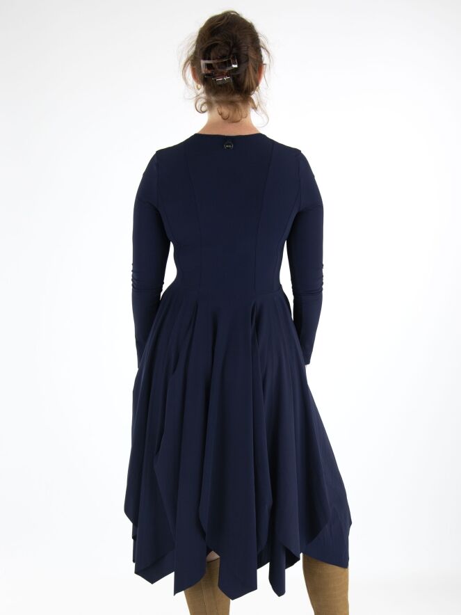 Ein Kleid von High in Nachtblau. Das Kleid hat lange Ärmel und einen hohen runden Ausschnitt. Das Oberteil ist schmal geschnitten und ab der Taille hat das Kleid eine sehr weite A-Linie mit Schlitzen. Direkt unter der Taille befinden sich Taschen. Dieses Kleid kann bei 30 Grad gewaschen werden.