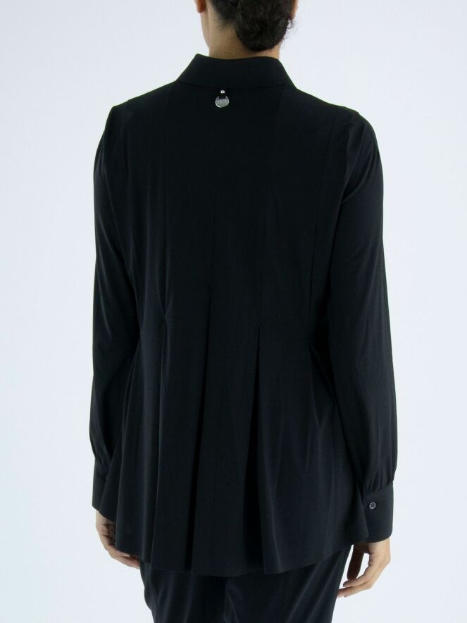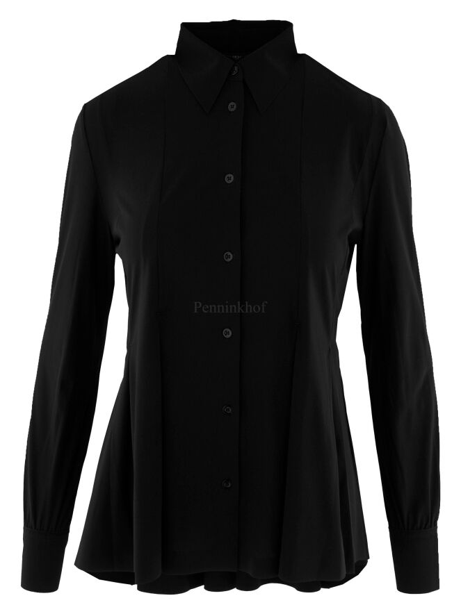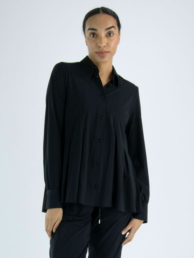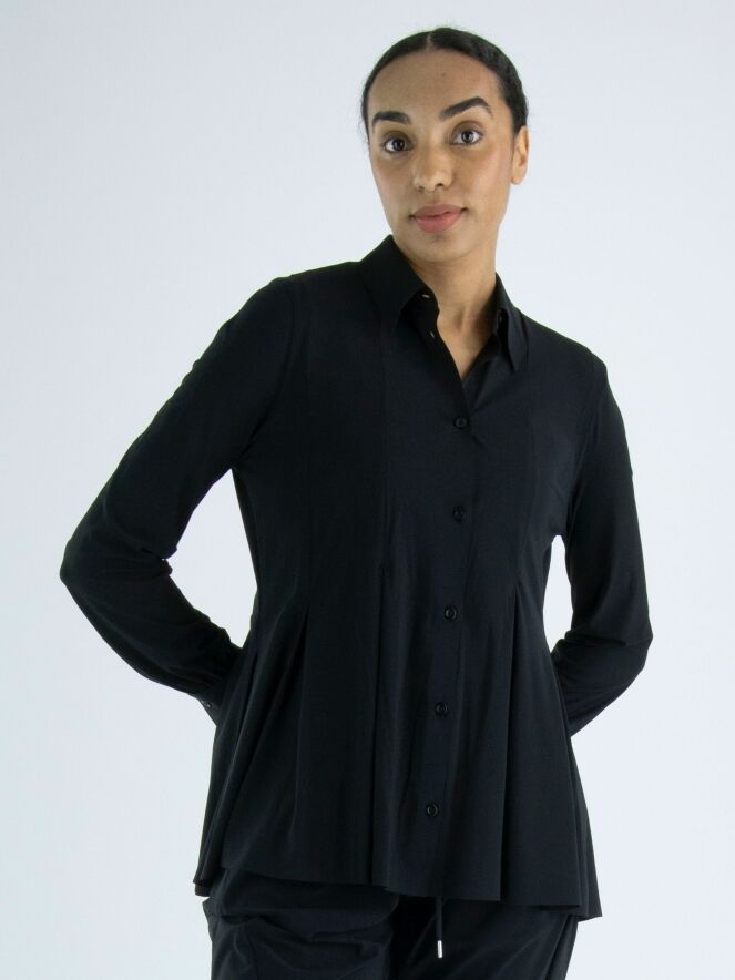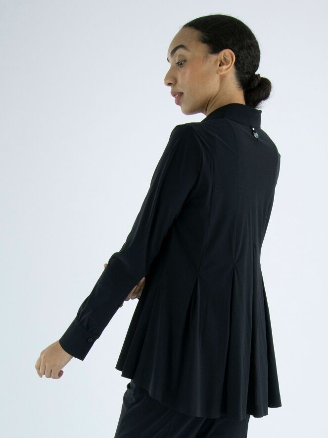 Eine Strickjacke oder Bluse von High in Schwarz. Ab der Taille gibt es mehrere Bundfalten, die der Strickjacke eine A-Linien-Form ab der Taille verleihen. Diese Strickjacke kann von Hand gewaschen werden.