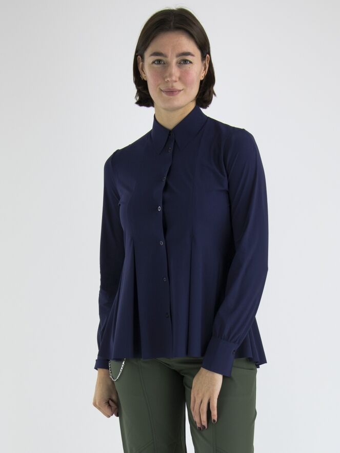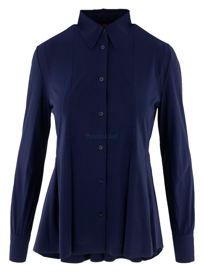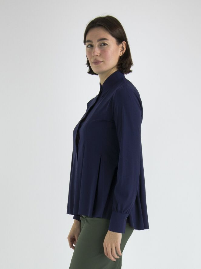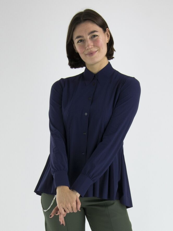 Eine Strickjacke oder Bluse von High in Nachtblau. Ab der Taille gibt es mehrere Bundfalten, die der Strickjacke eine A-Linien-Form ab der Taille verleihen. Diese Strickjacke kann von Hand gewaschen werden.