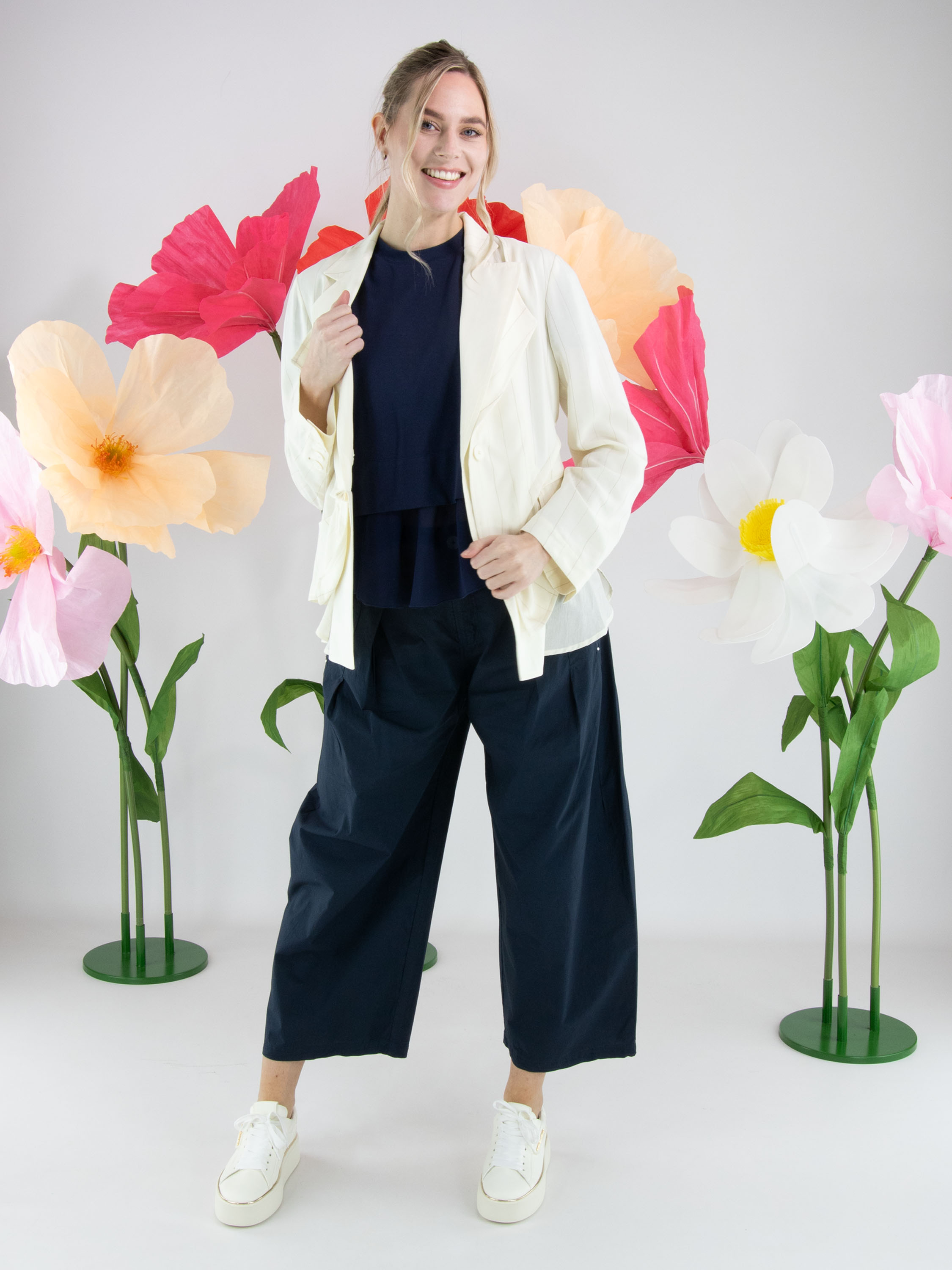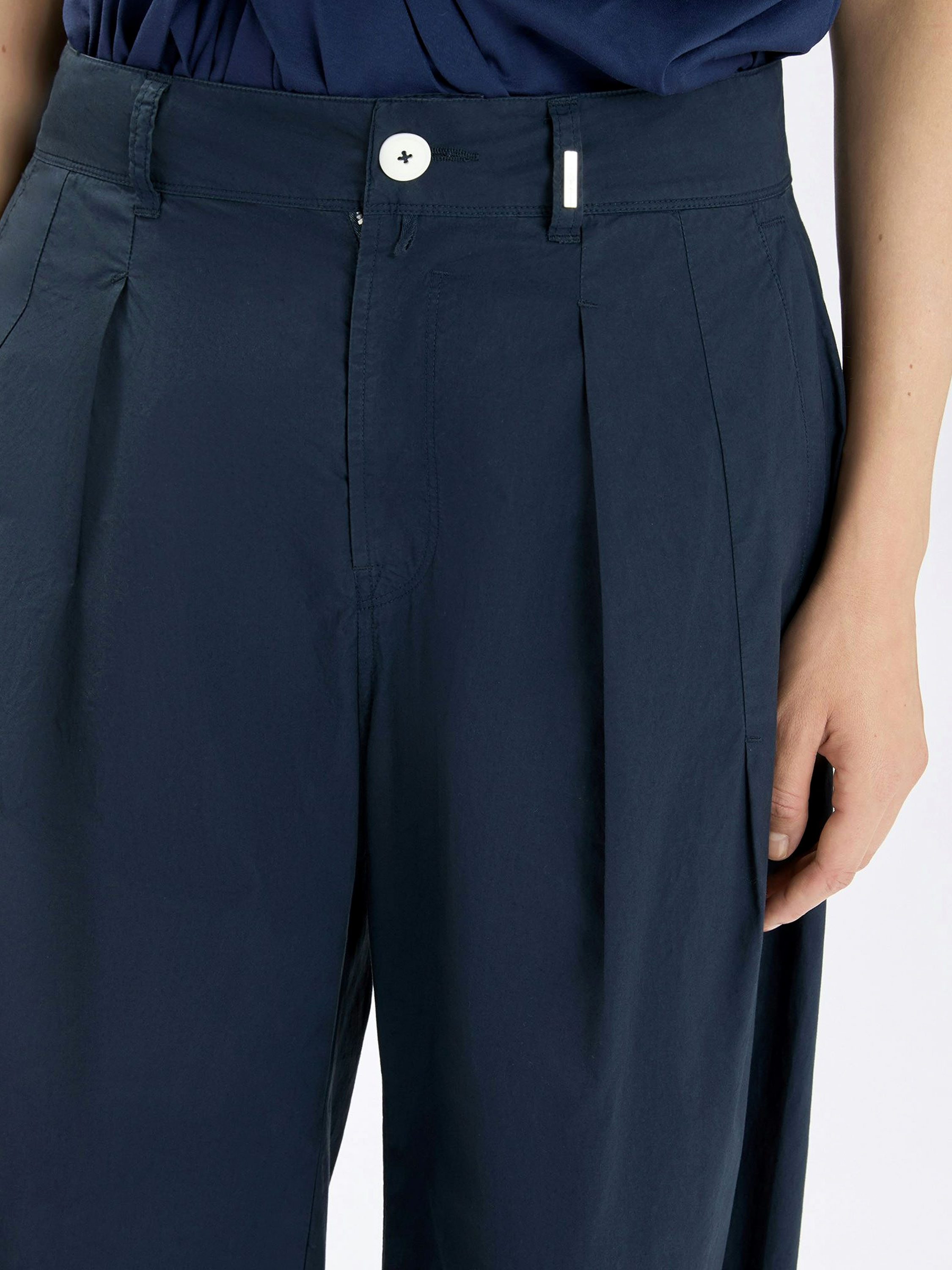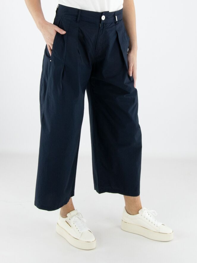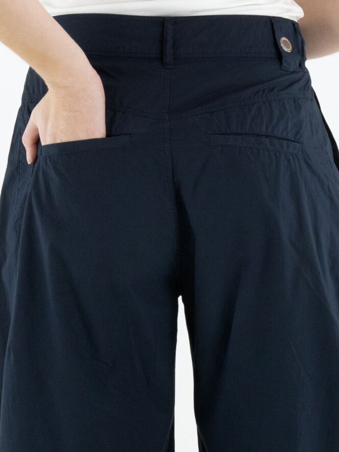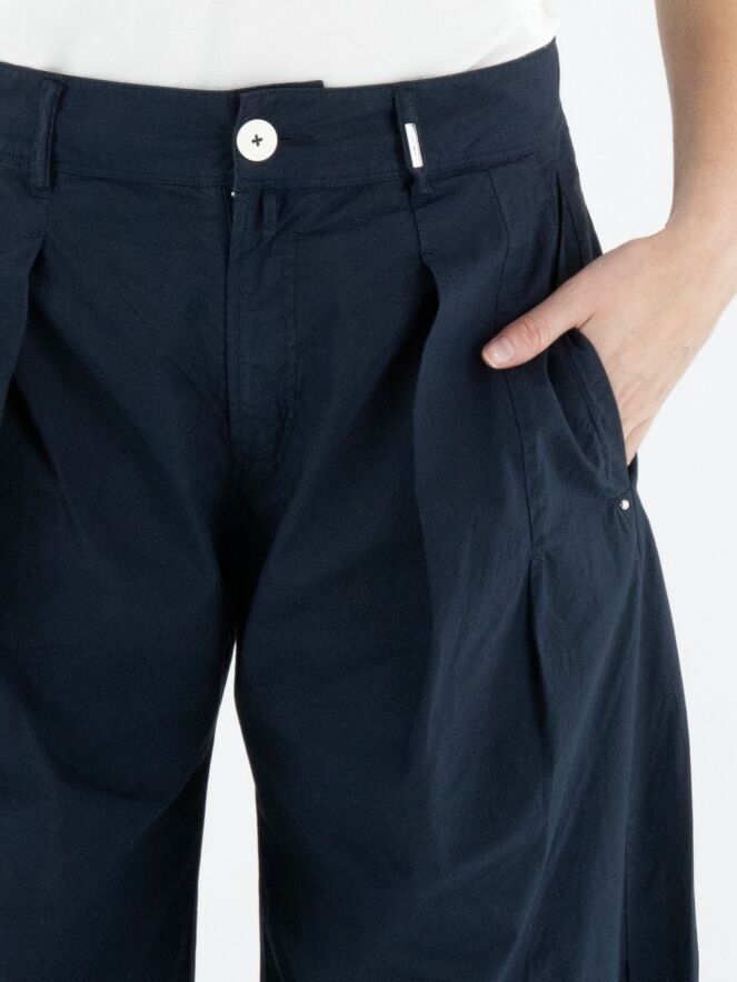Hose von High aus sommerlicher Baumwolle in Marineblau. Mehrere Bundfalten ab der Taille sorgen für einen eleganten, luftigen Fall. Mit Eingrifftaschen versehen, kann diese exklusive Designerhose bei 30 Grad gewaschen werden.