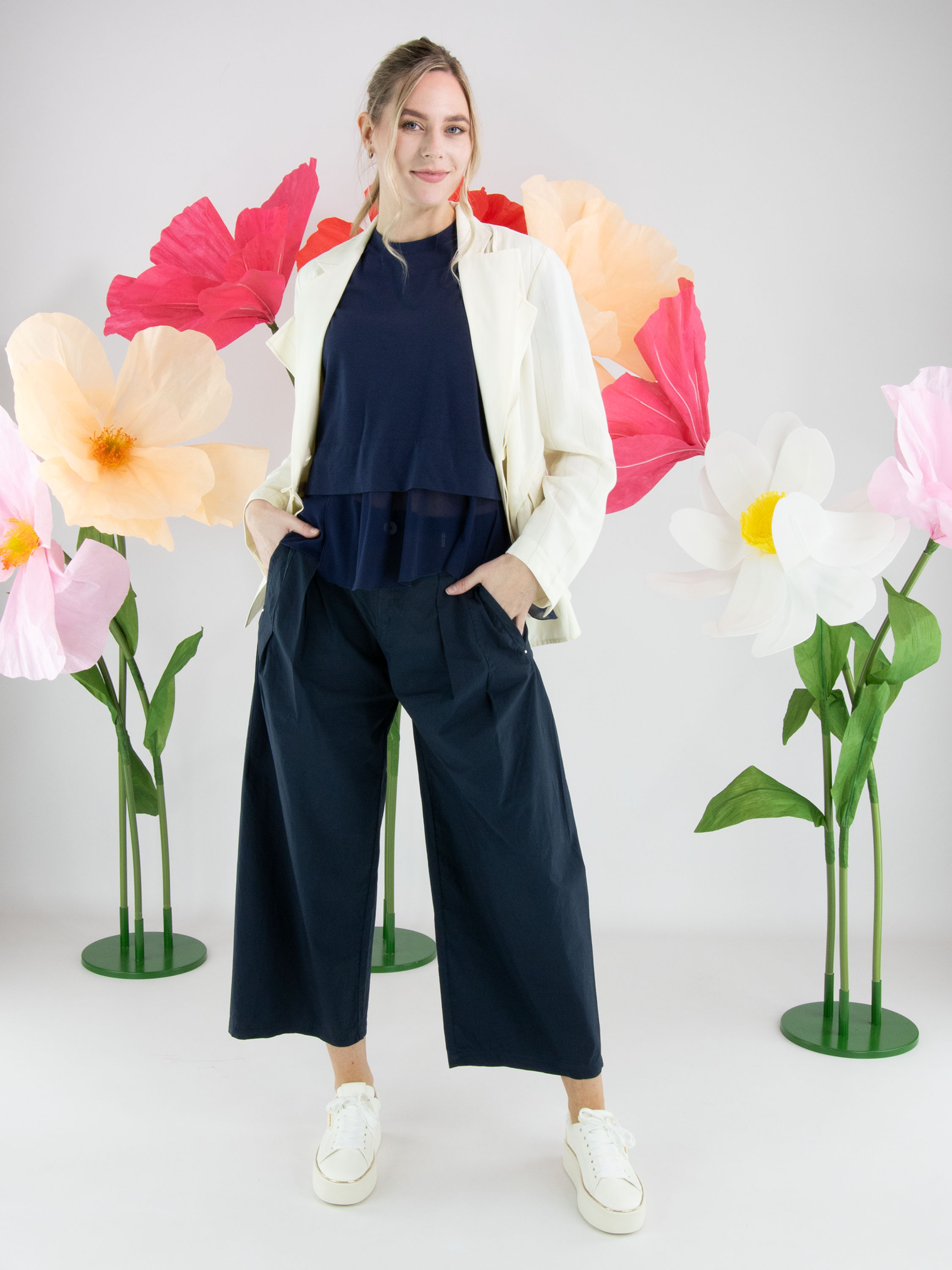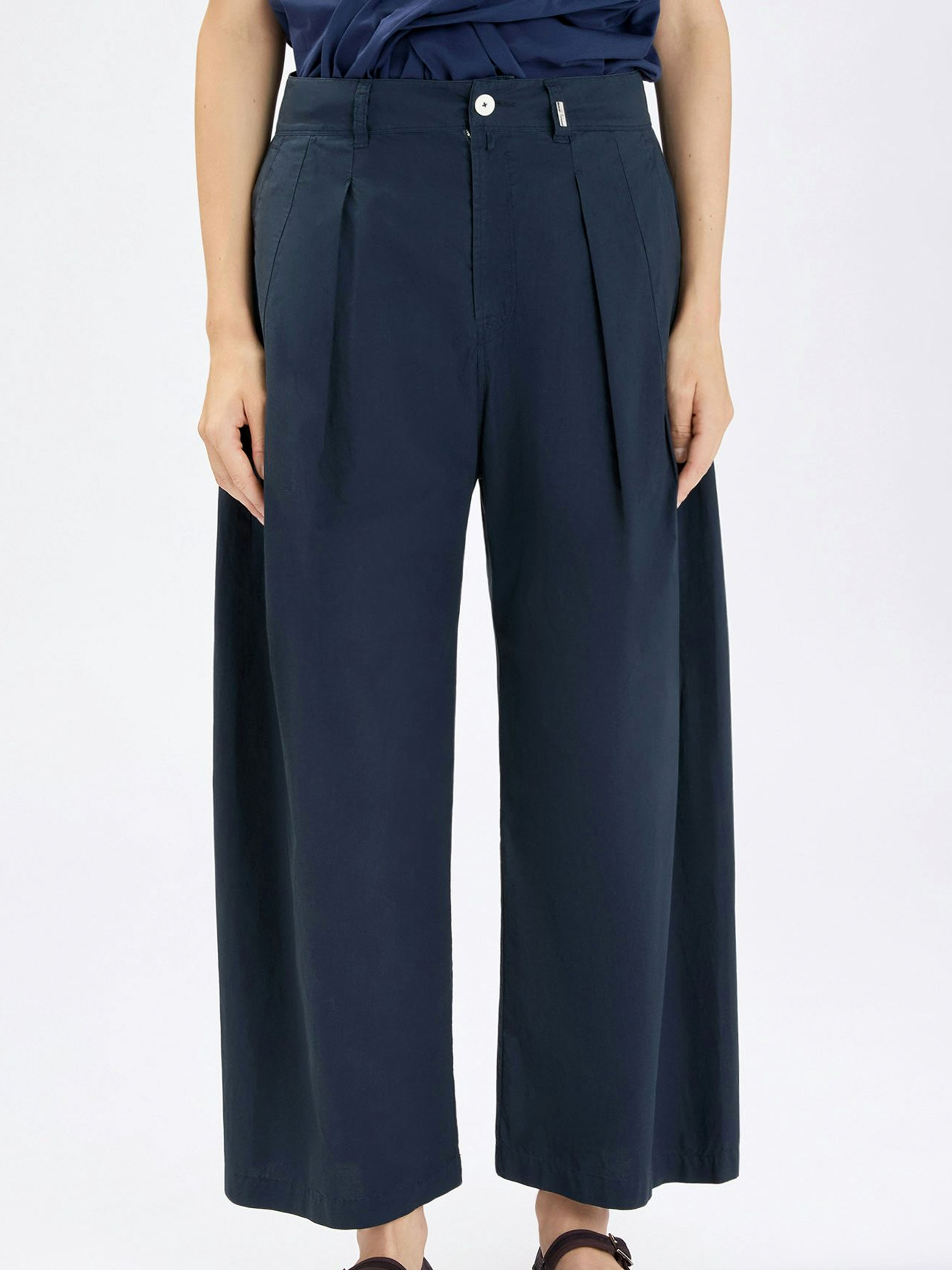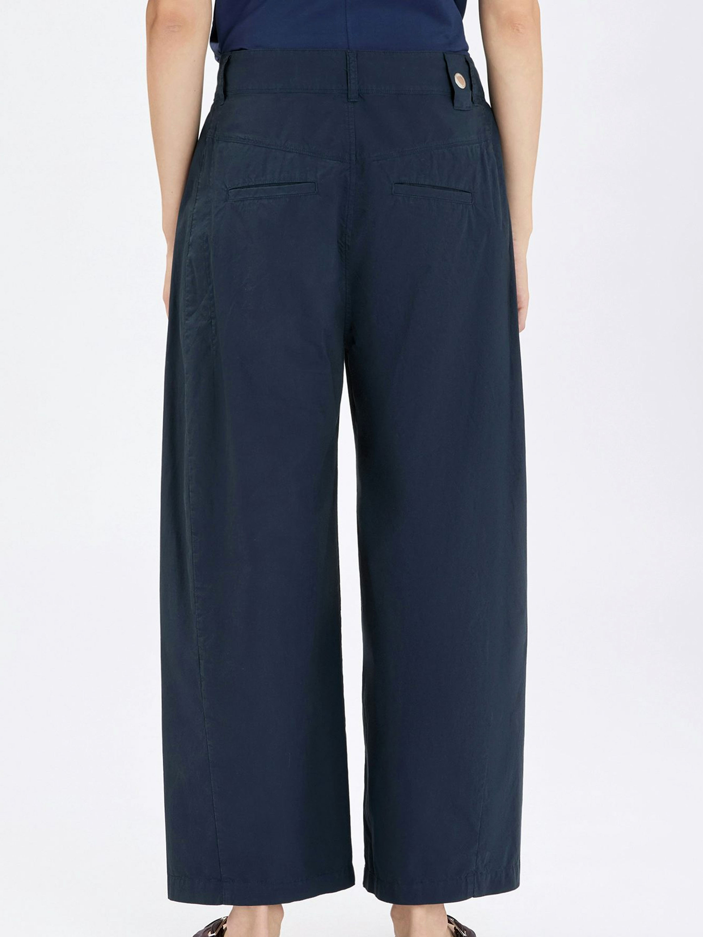 Hose von High aus sommerlicher Baumwolle in Marineblau. Mehrere Bundfalten ab der Taille sorgen für einen eleganten, luftigen Fall. Mit Eingrifftaschen versehen, kann diese exklusive Designerhose bei 30 Grad gewaschen werden.