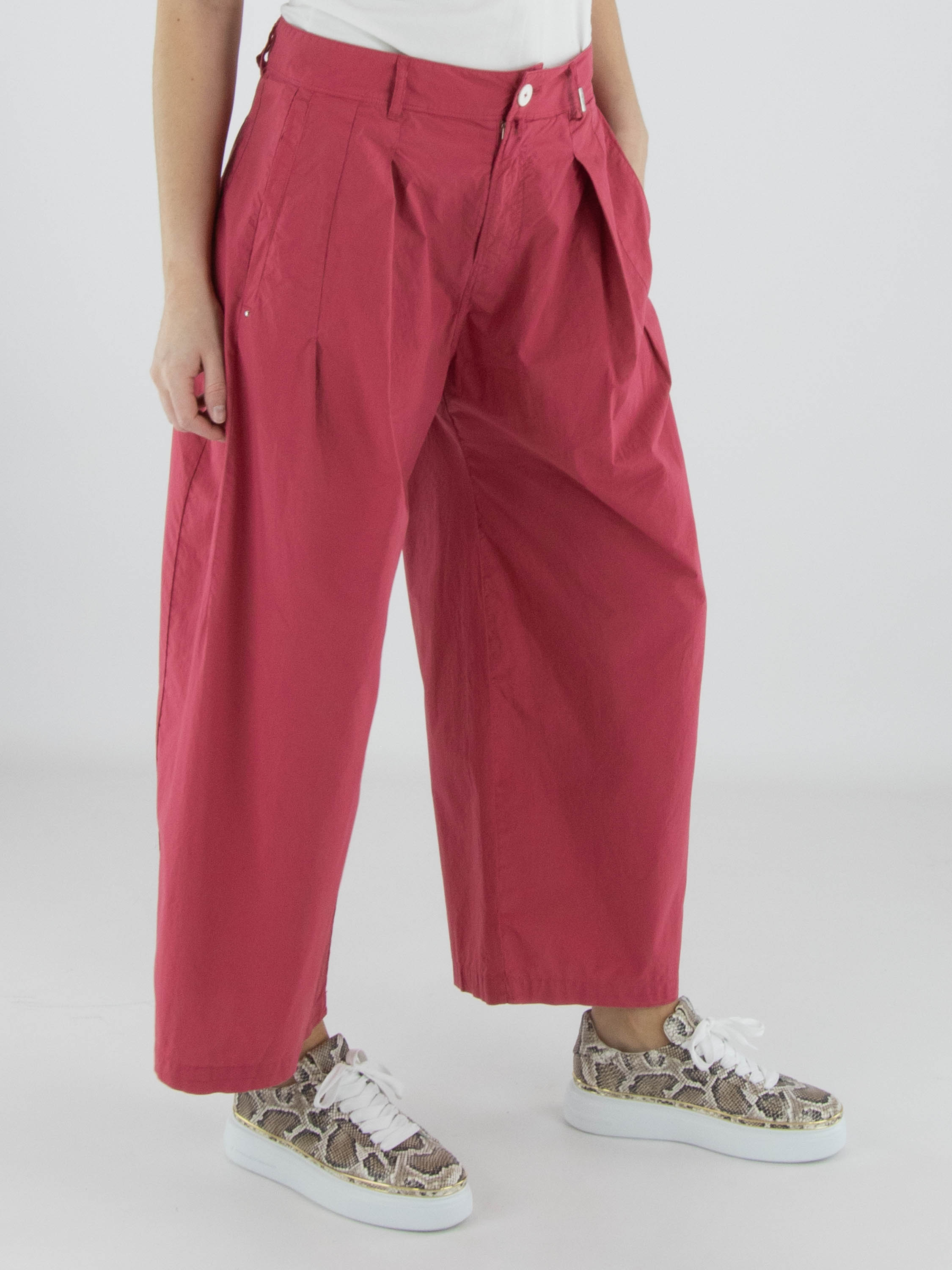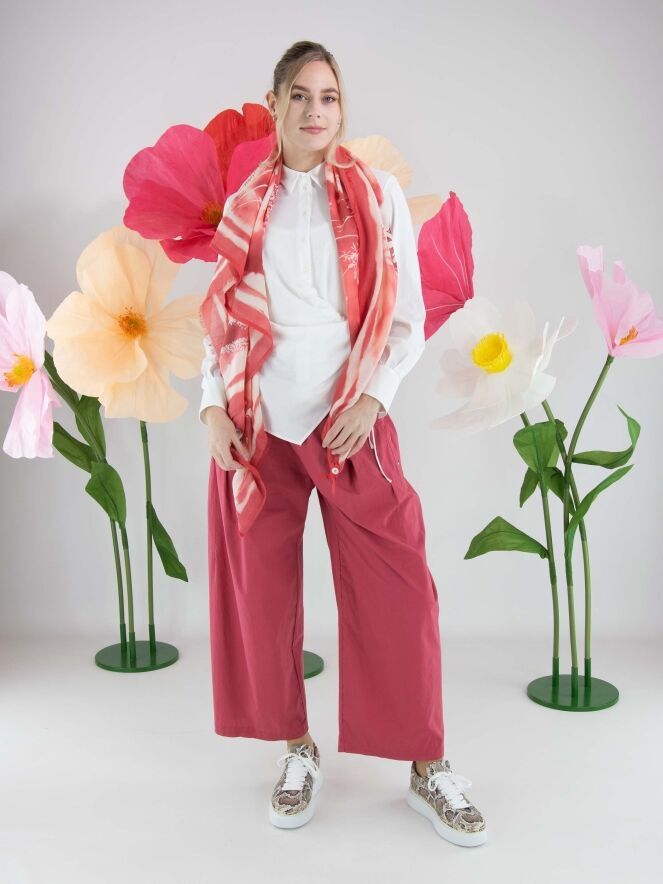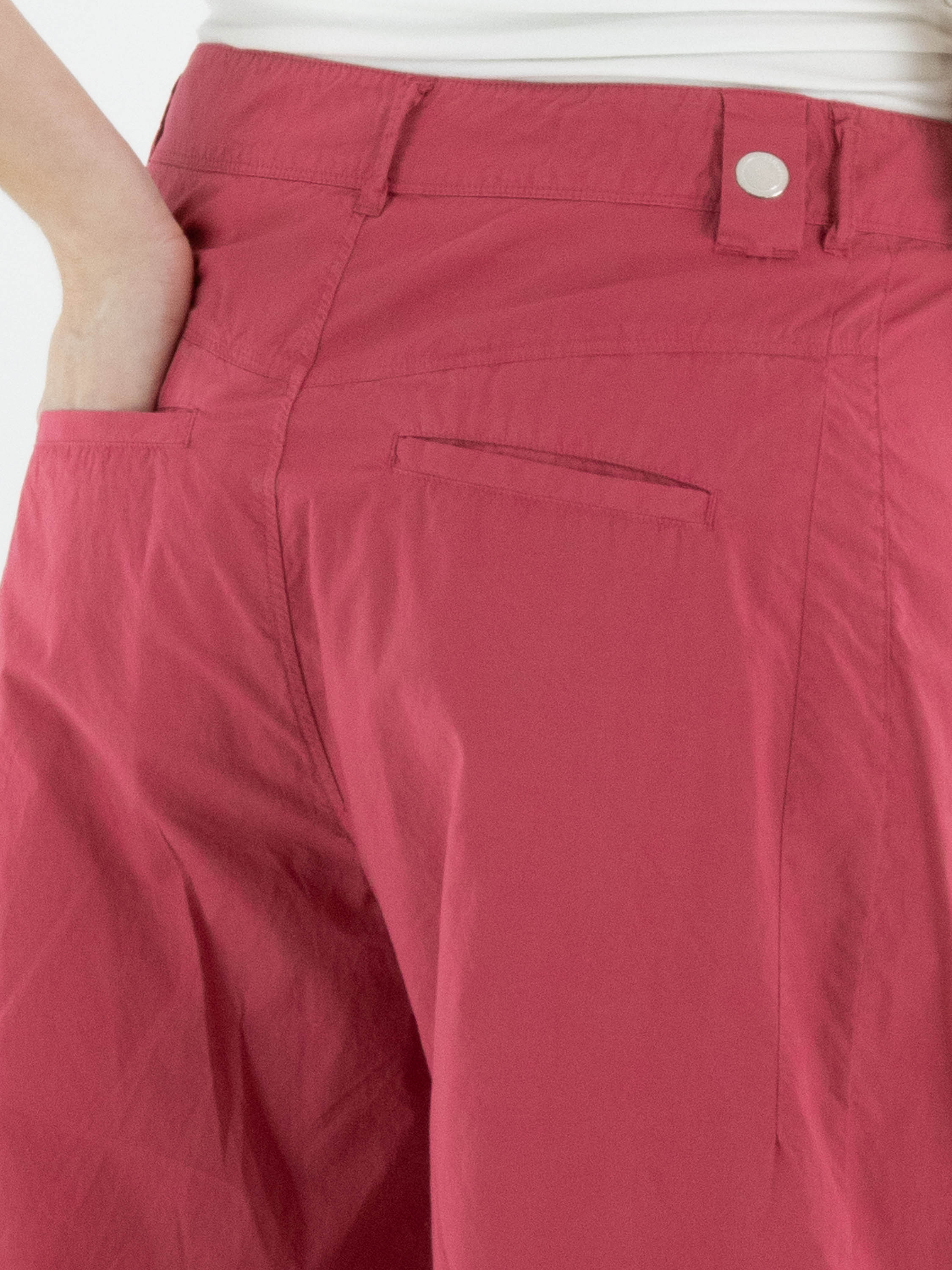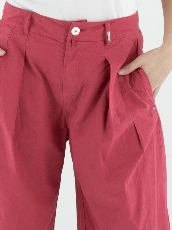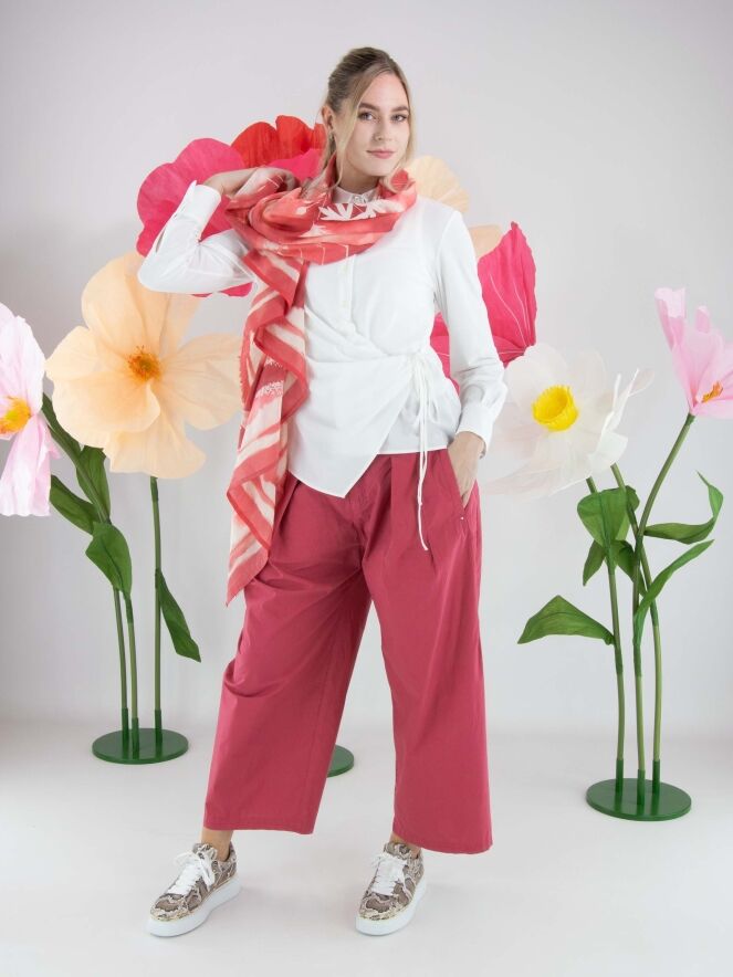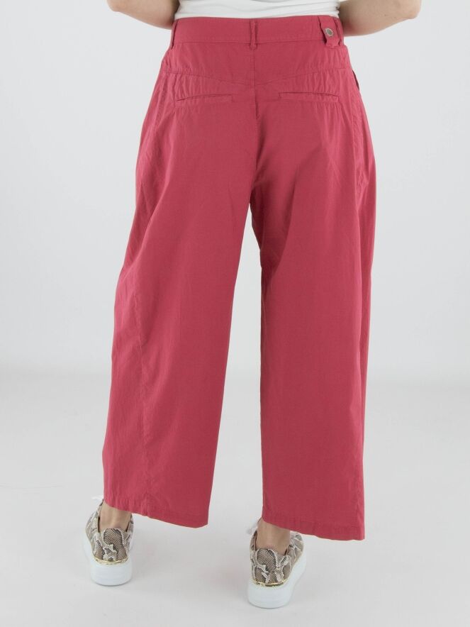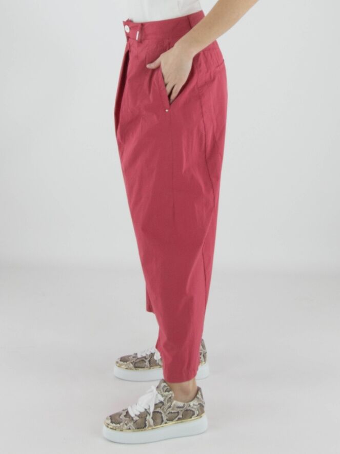 Hose von High aus sommerlicher Baumwolle in Himbeerrot. Von der Taille aus verlaufen einige Bundfalten, die eine fließende und feminine Passform schaffen. Mit Eingrifftaschen ausgestattet, kann diese exklusive Designerhose bei 30 Grad gewaschen werden.