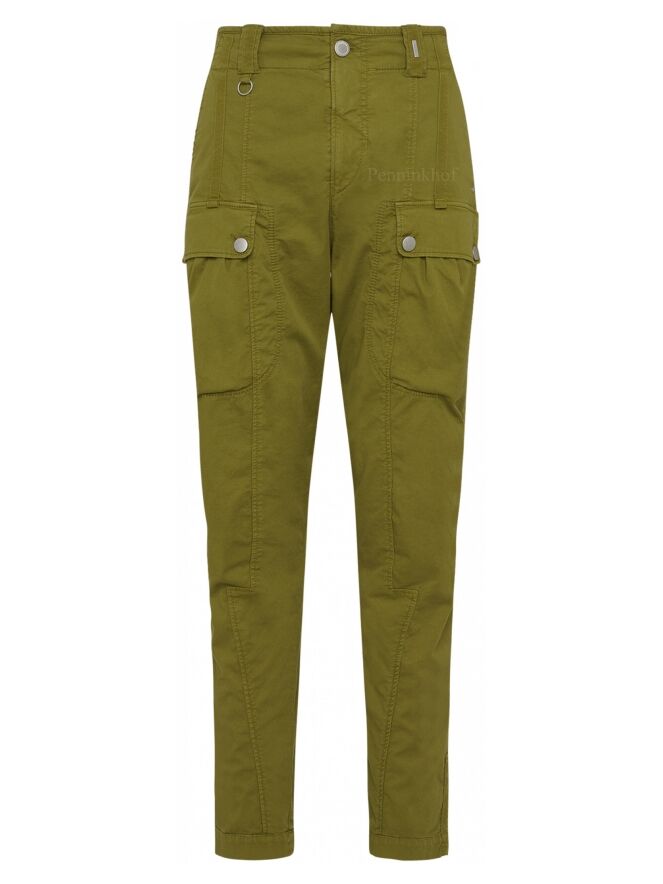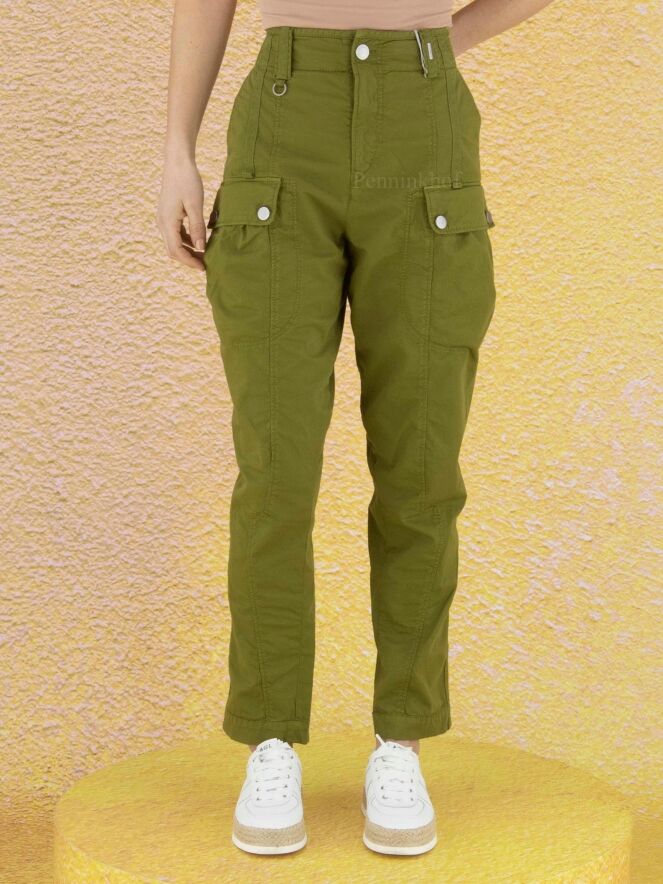 Pistaziengrüne Hose der Designermarke High. Am Oberschenkel befinden sich Taschen. Die Hosenbeine laufen vom Knie abwärts schmal zu. Die Hose hat Seitentaschen und kann von Hand gewaschen werden.