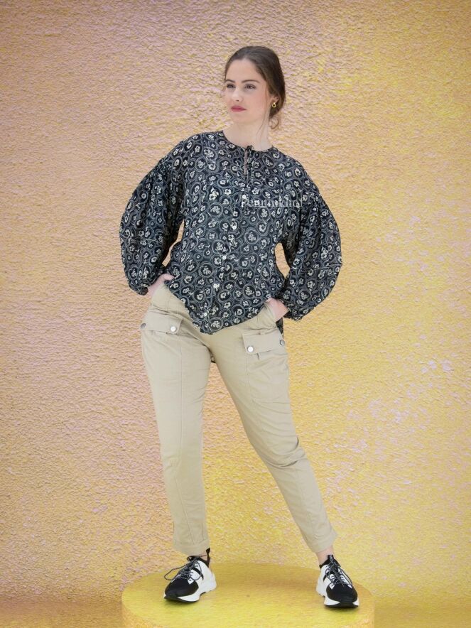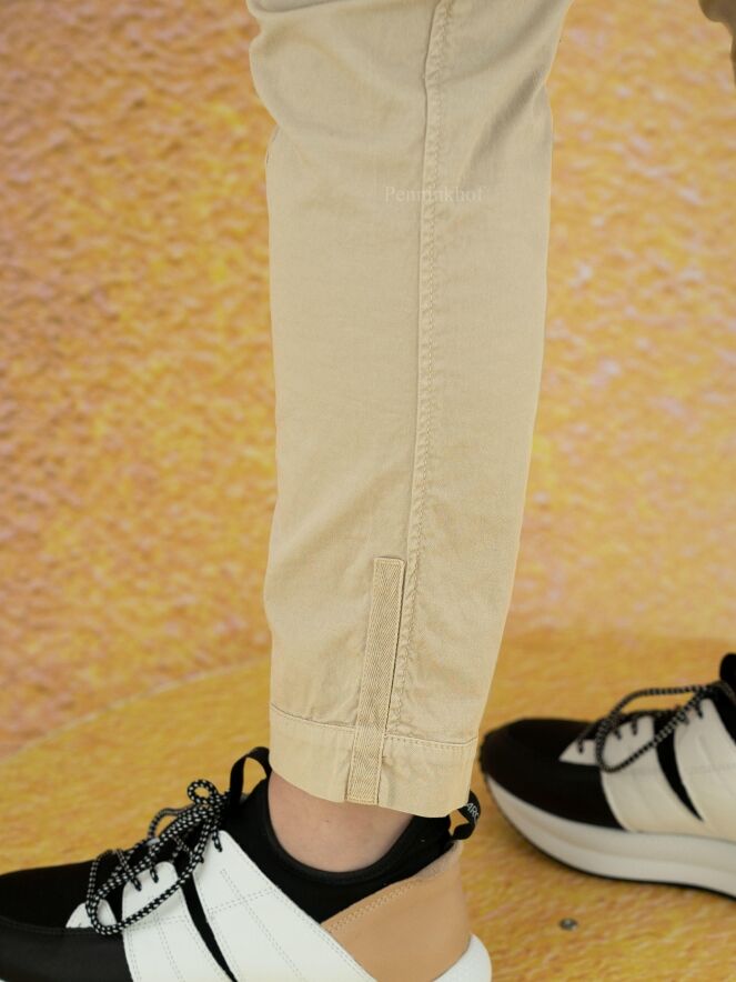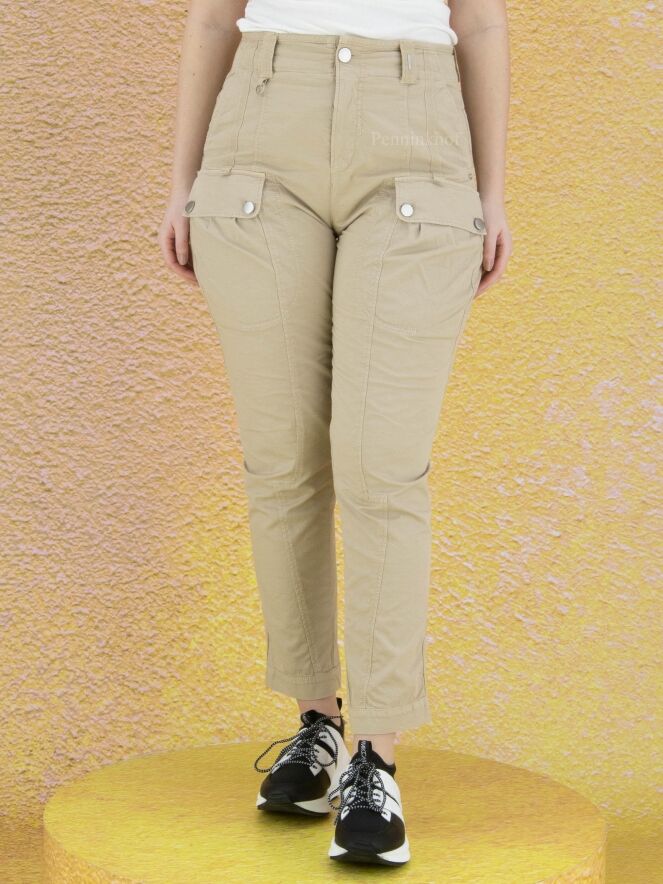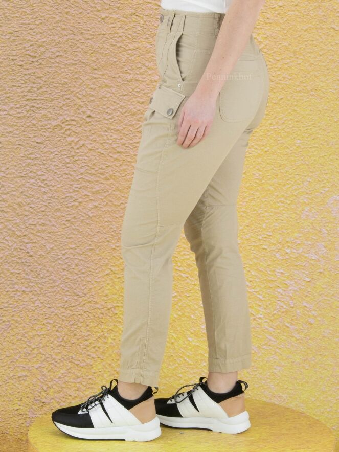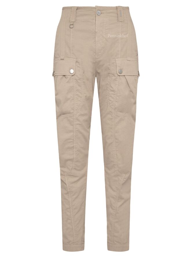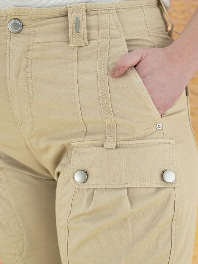 Eine beige Stoffhose der Designermarke High. Am Oberschenkel befinden sich Taschen. Die Hosenbeine laufen vom Knie abwärts schmal zu. Die Hose hat Seitentaschen und kann von Hand gewaschen werden.