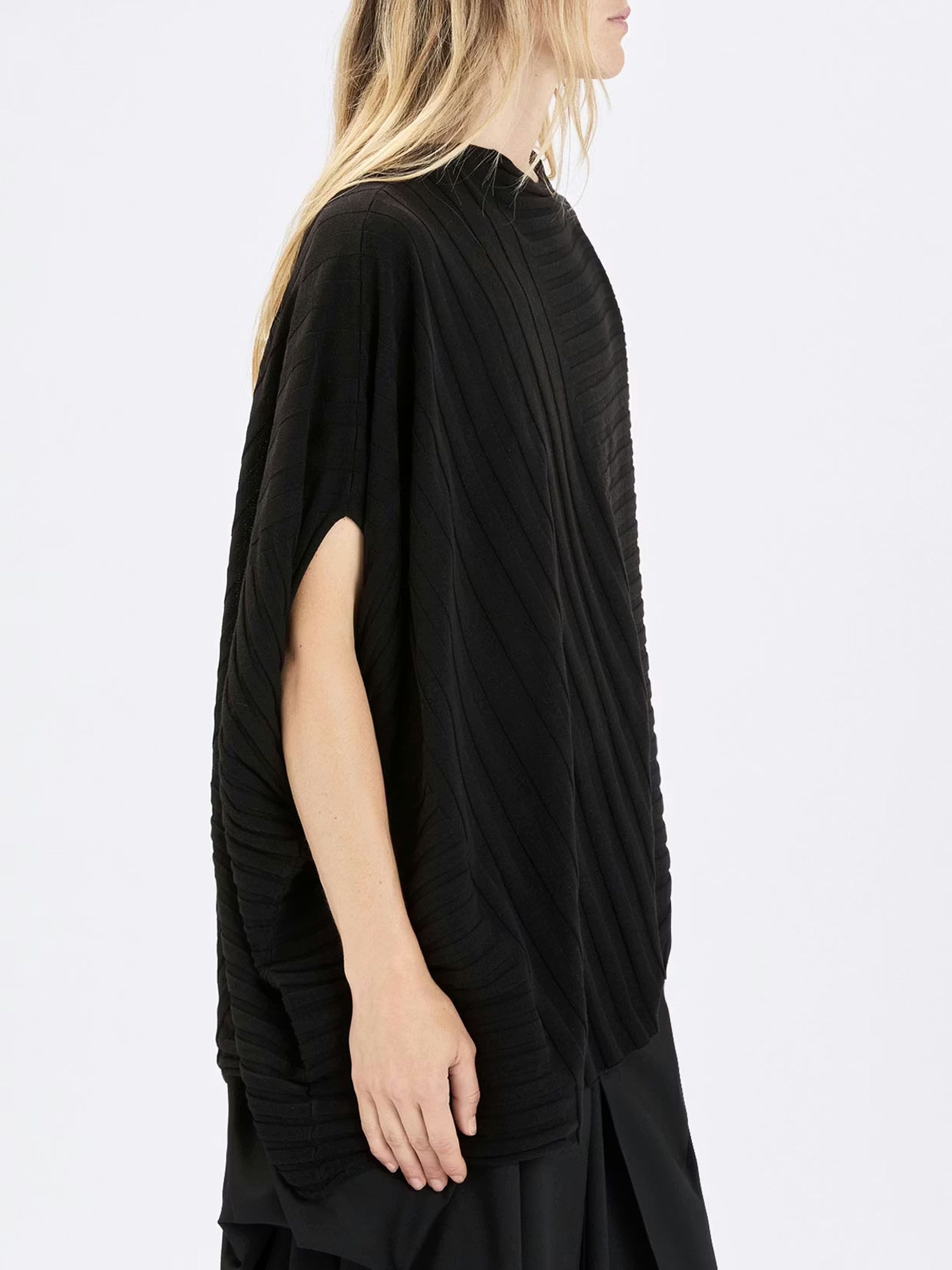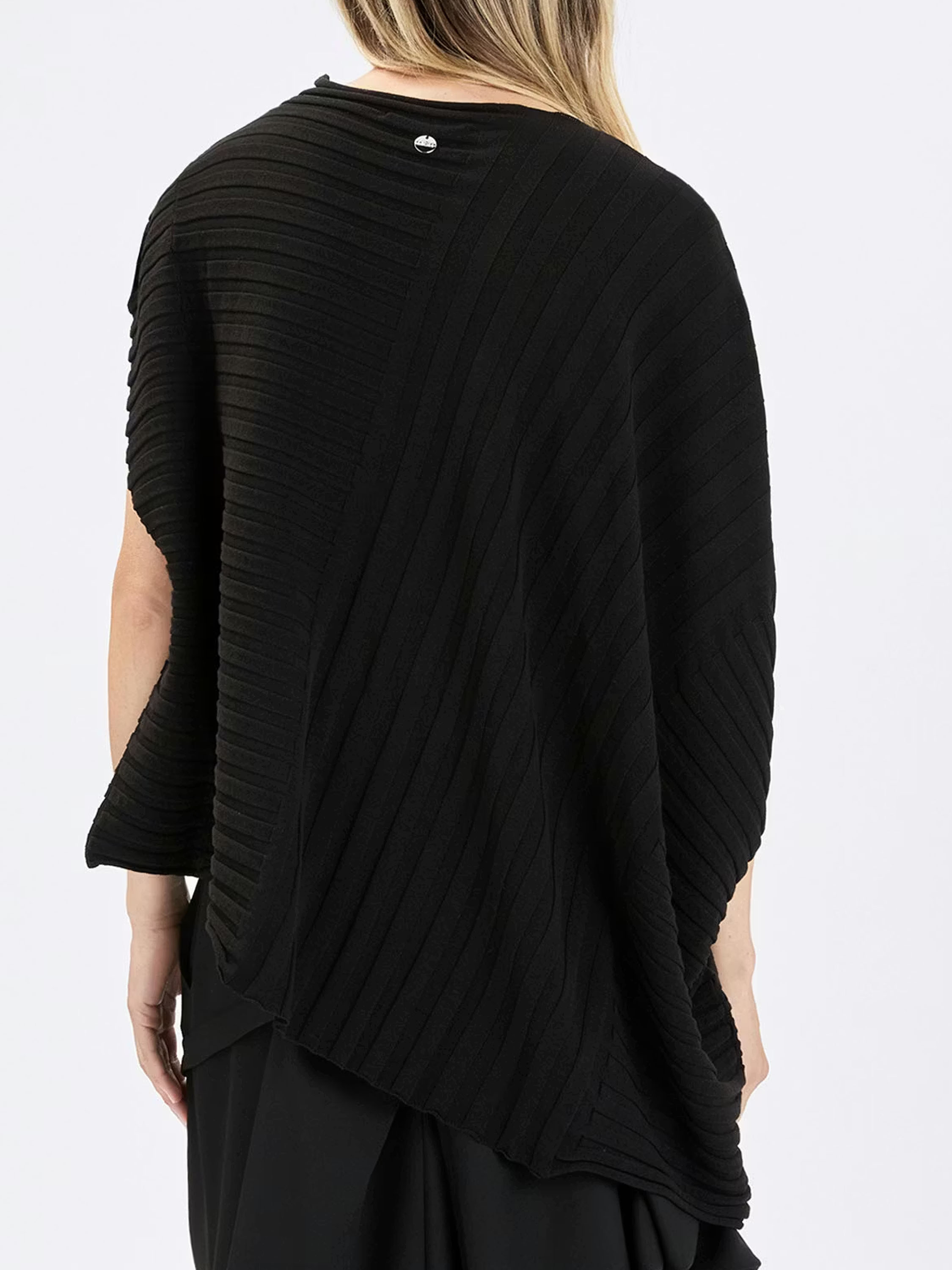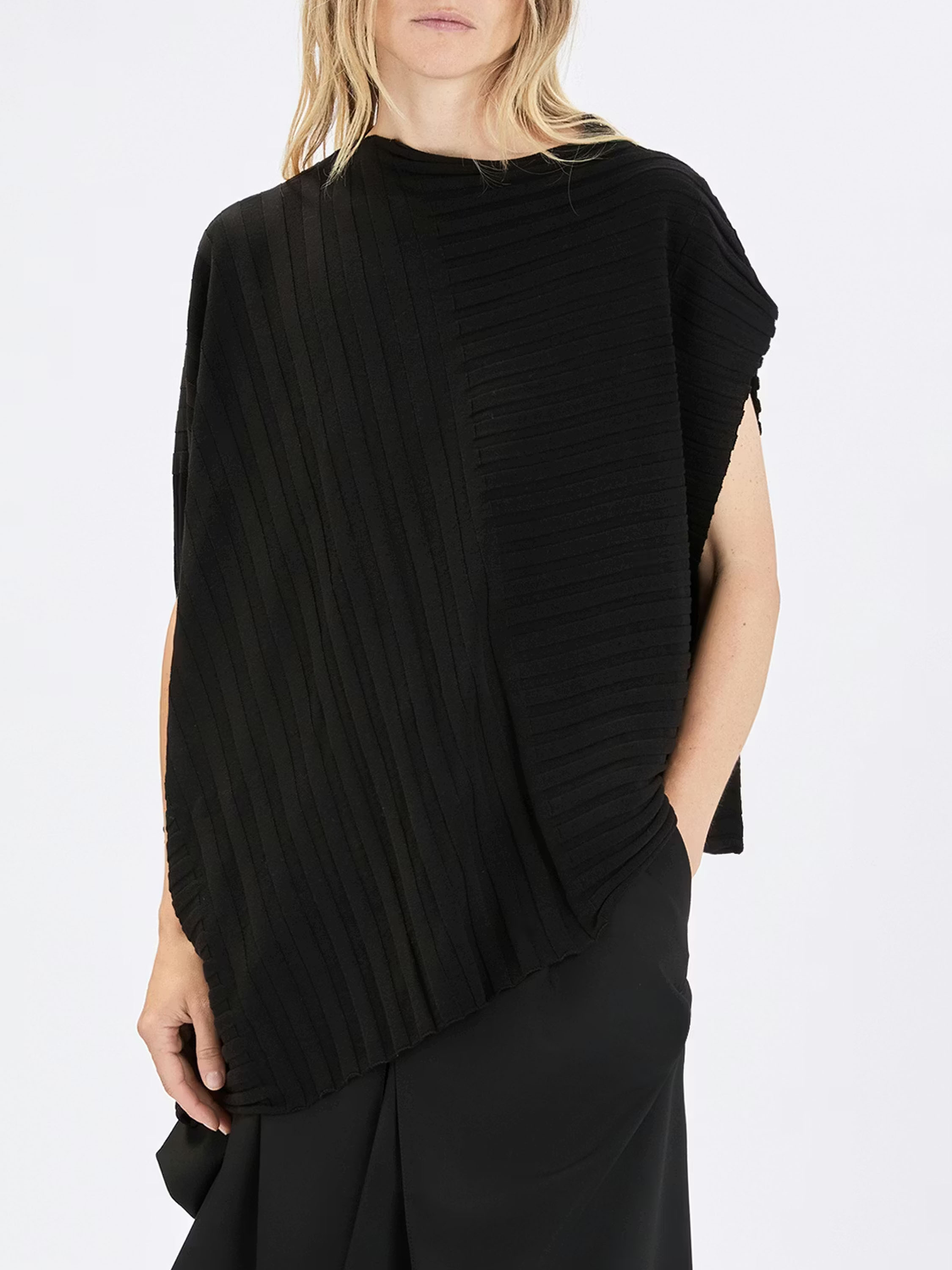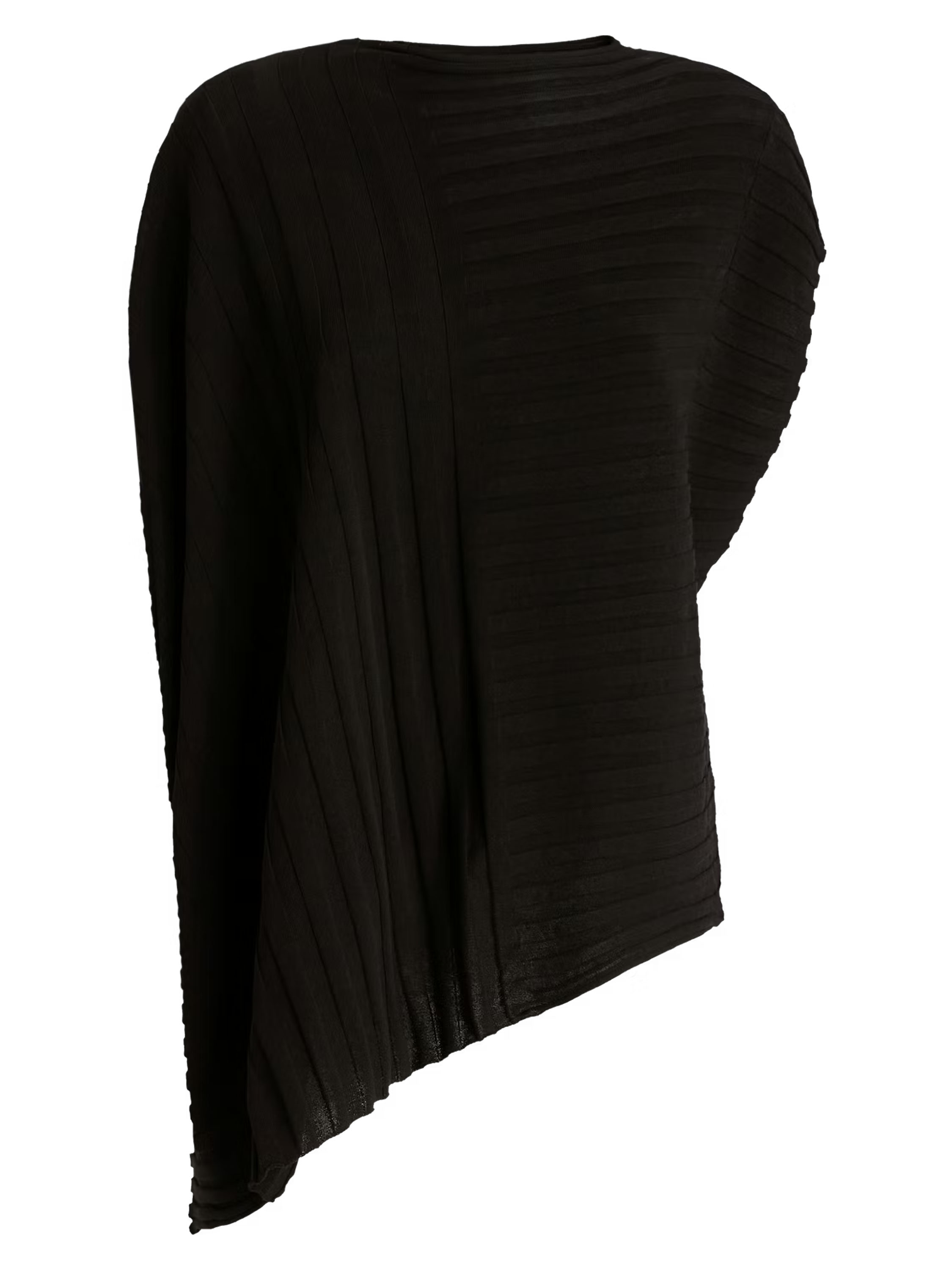 Ein Pullover von High Tech in einem diagonalen Streifenmuster in Schwarz. Auch der untere Abschluss des Pullovers ist schräg geschnitten. Der Pullover hat einen Rundhalsausschnitt und kann per Hand gewaschen werden.