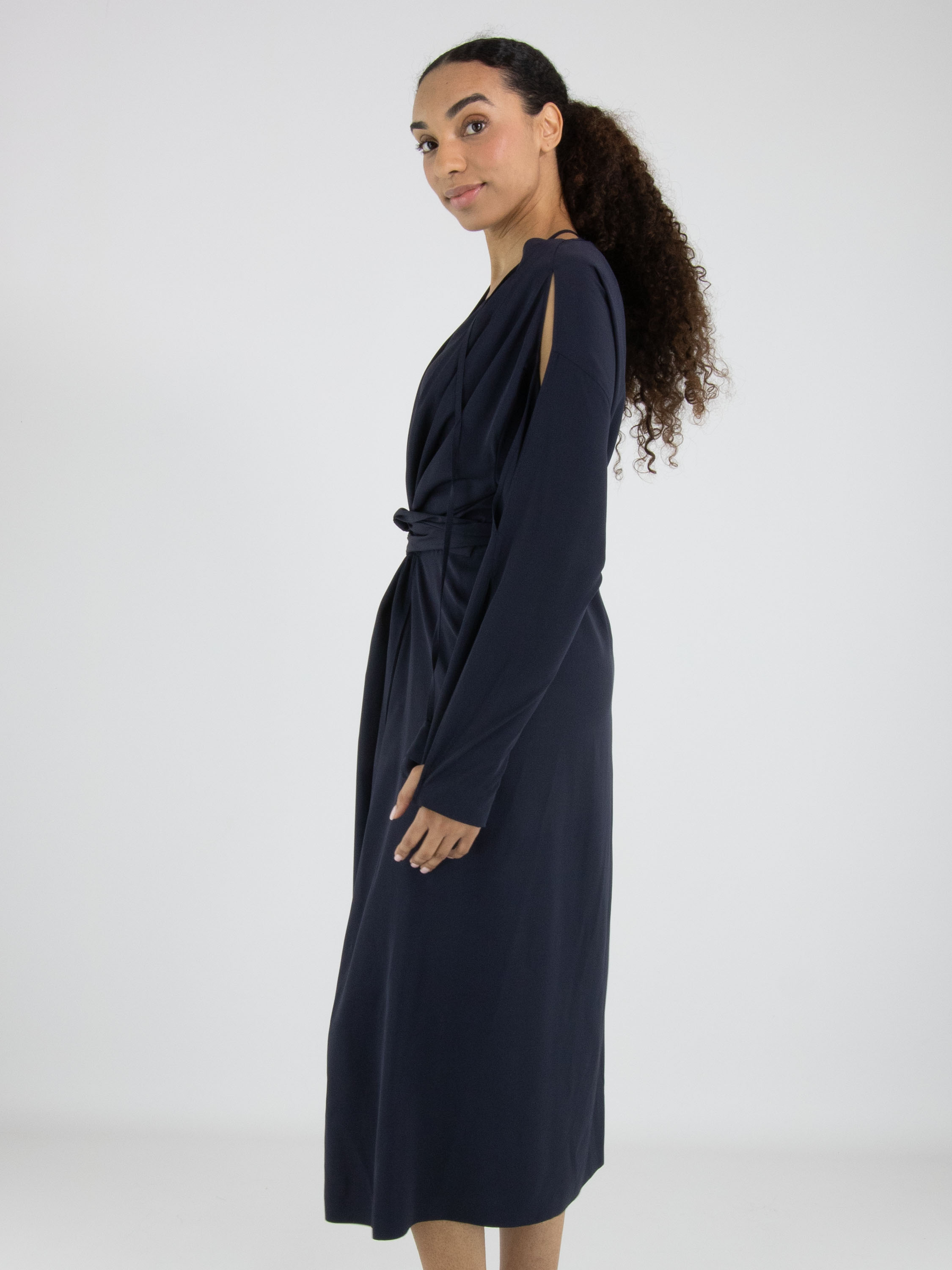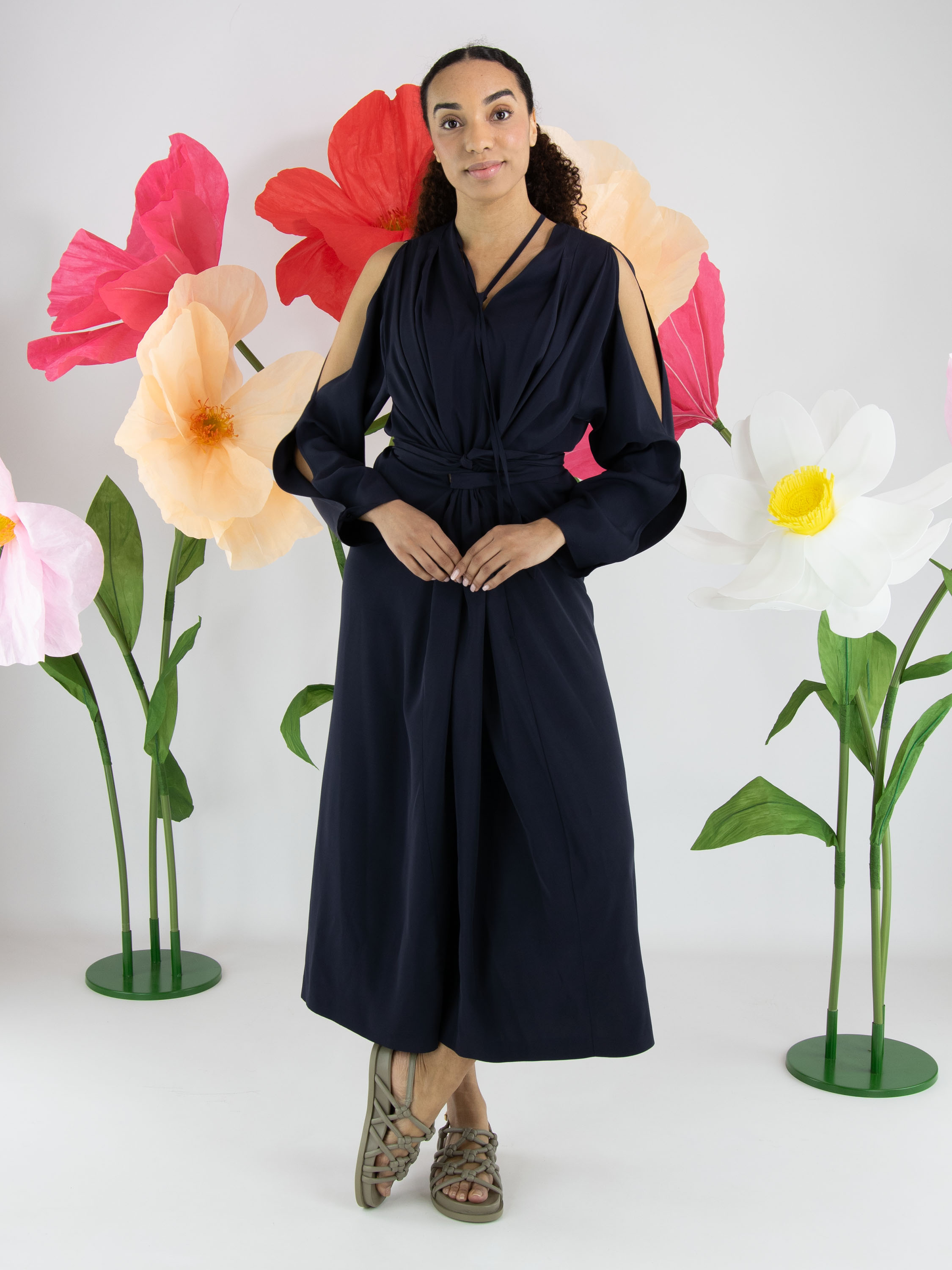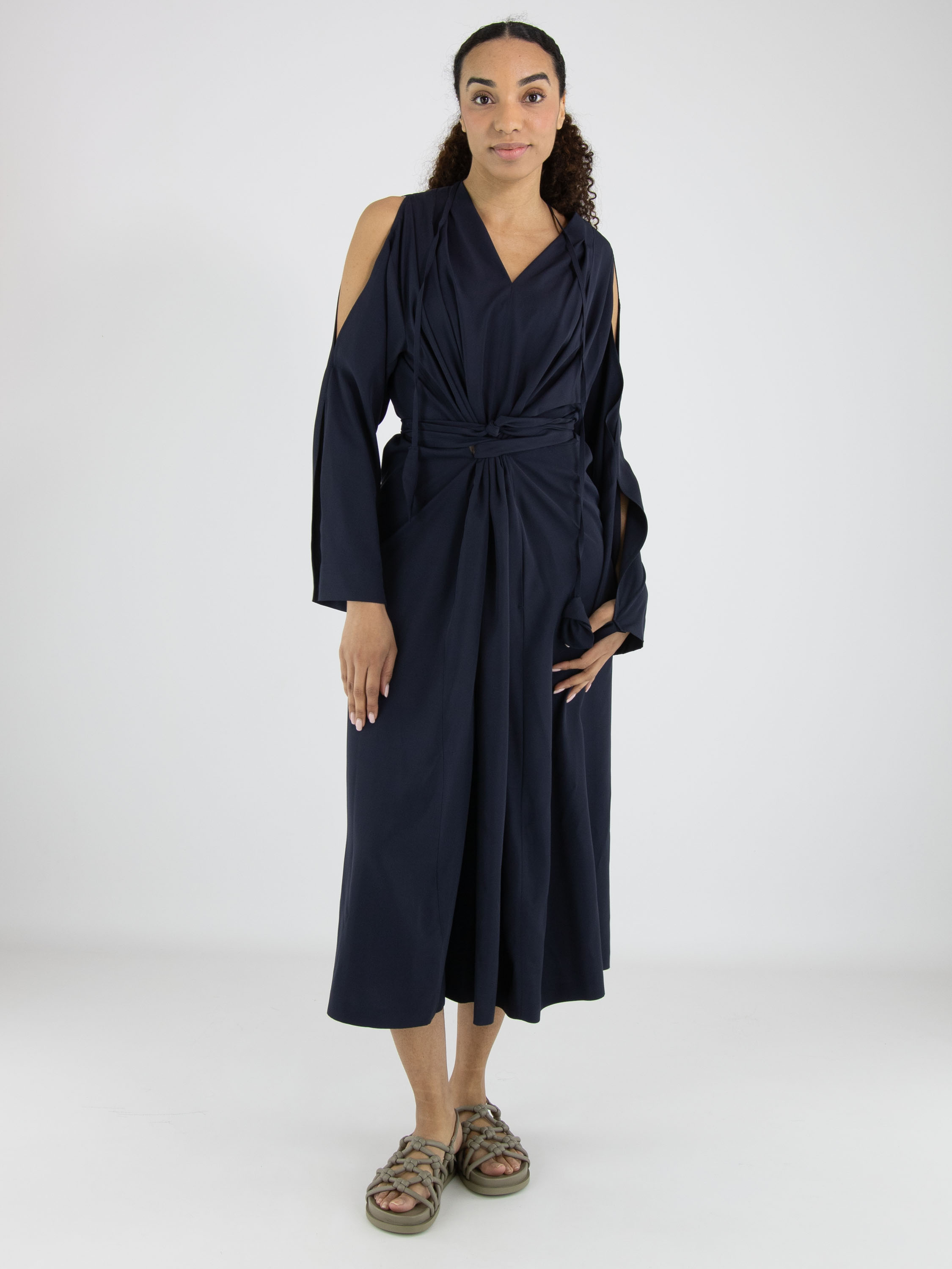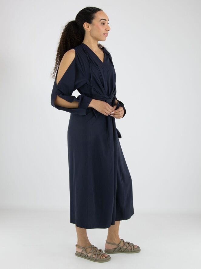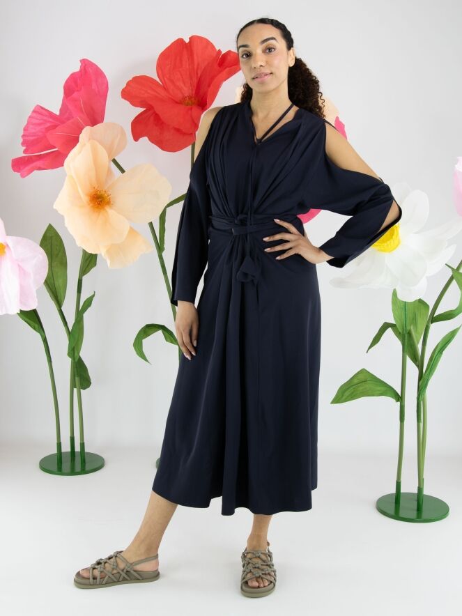 Kleid von High in einem eleganten Marineblau. Von den Seiten des V-Ausschnitts verlaufen auf beiden Seiten jeweils zwei Falten, die dem Modell einen fließenden, eleganten Fall verleihen. Vom Halsausschnitt gehen zwei lange Bänder mit dekorativen Blattabschlüssen aus, die dem Design eine verspielte, künstlerische Note geben. In der Taille befindet sich ein Gürtel, der an den Seiten ins Innere des Kleides übergeht und die Silhouette dezent betont. Der obere Teil der Ärmel ist von der Schulter bis zum Ellenbogen offen gearbeitet. Auf Taillenhöhe sind Eingrifftaschen integriert. Dieses Kleid darf nicht gewaschen werden.