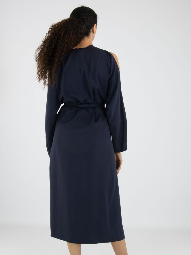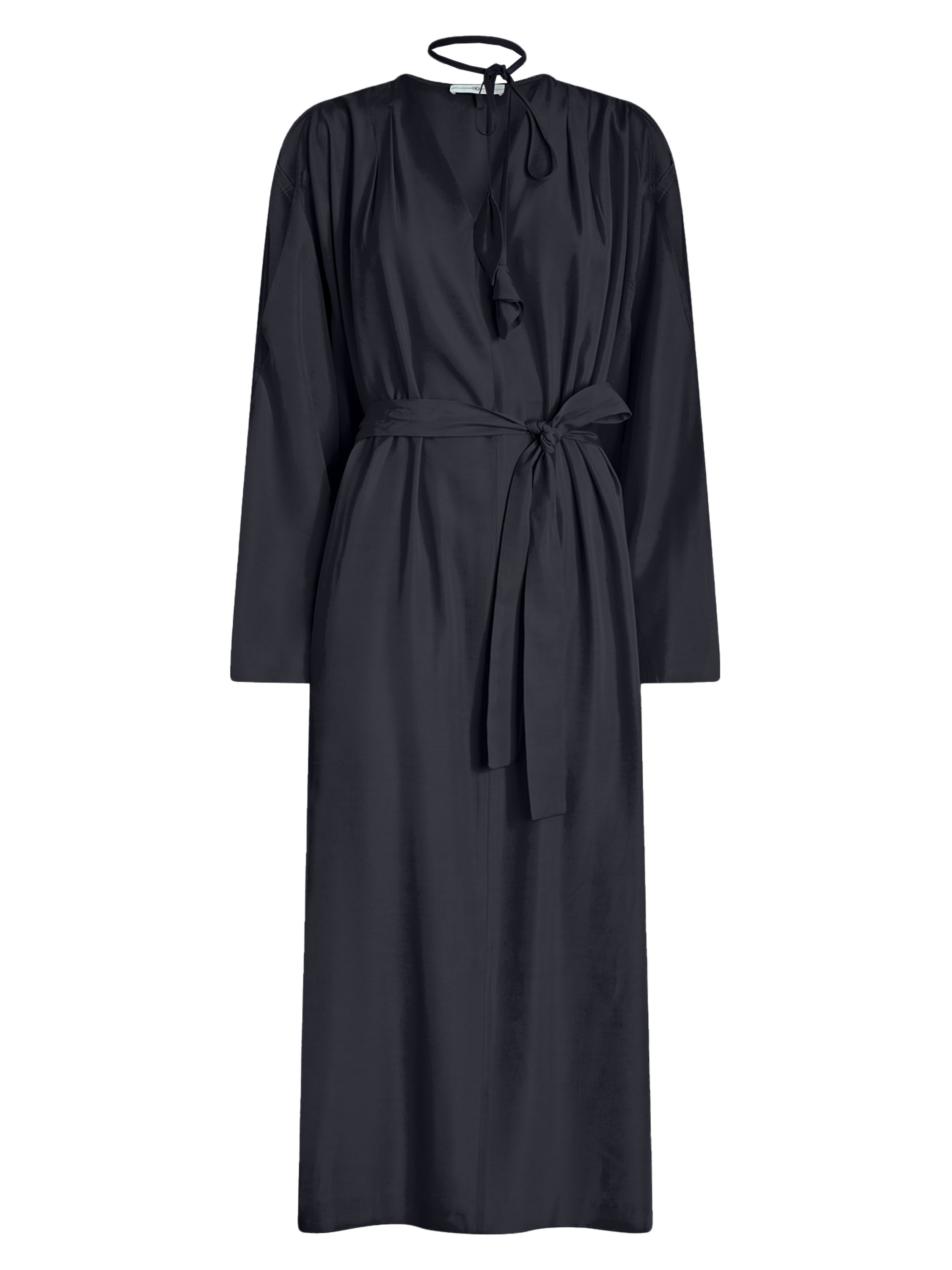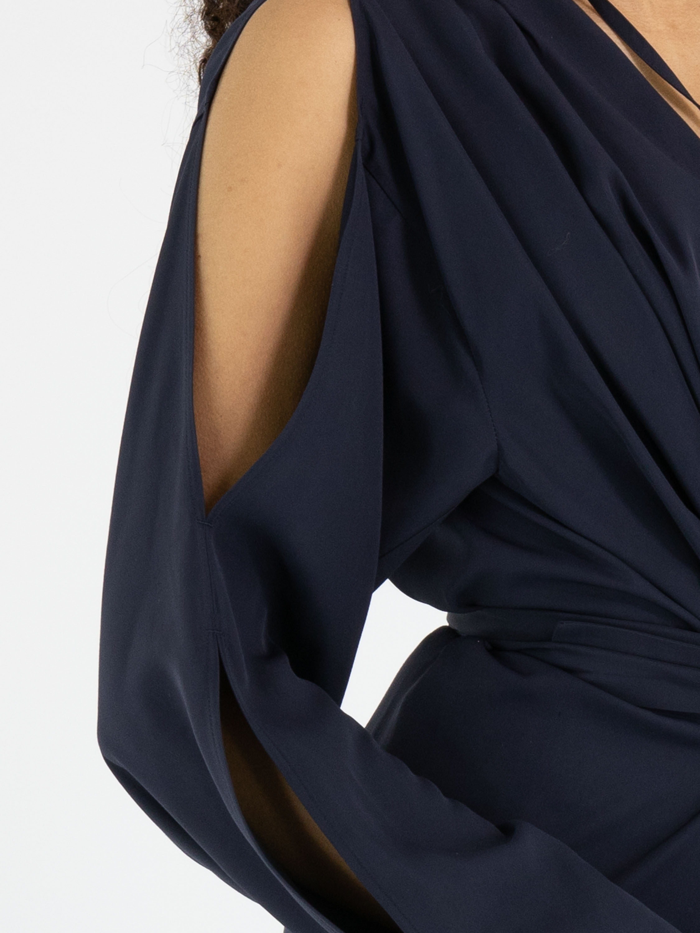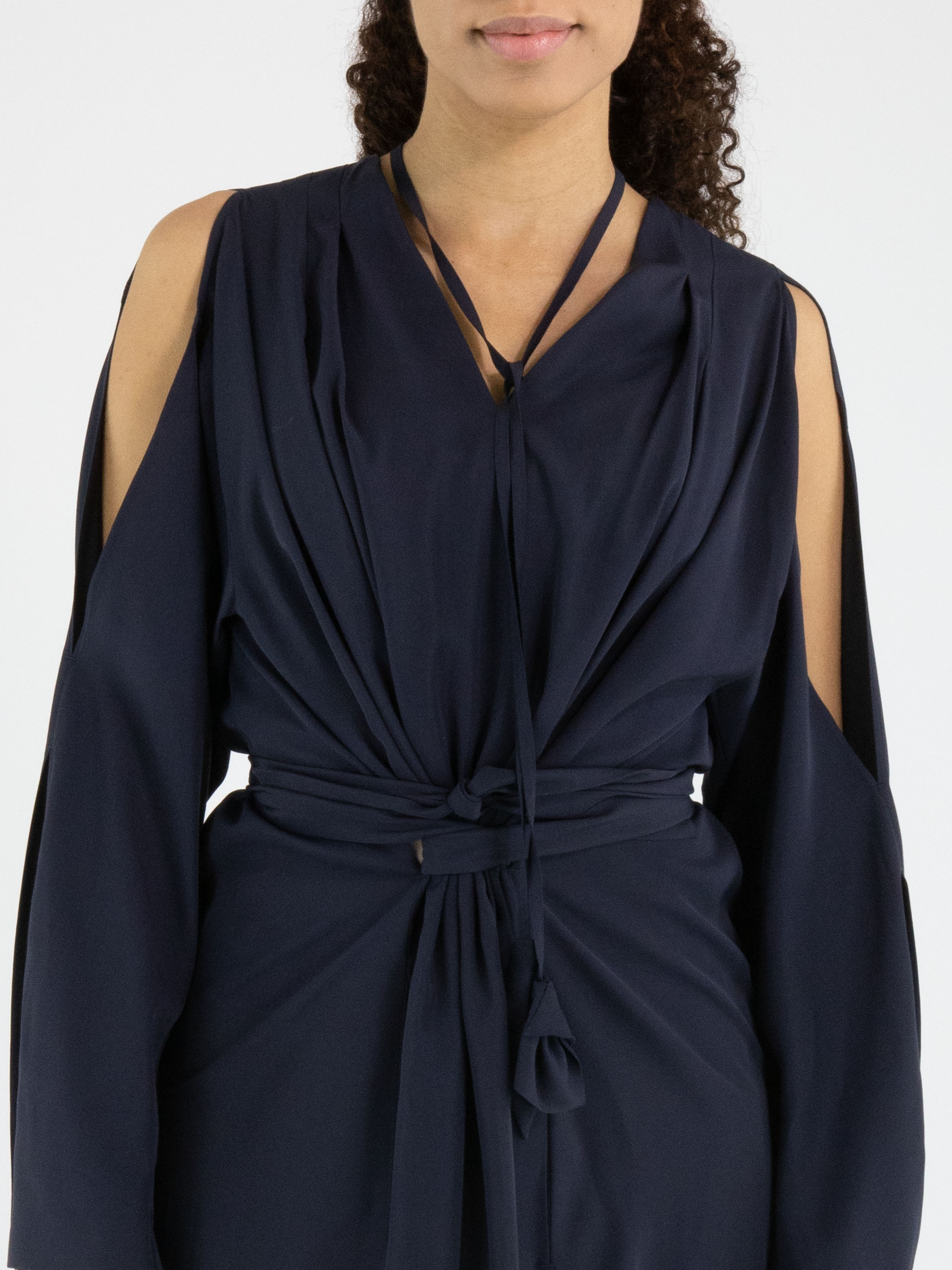 Kleid von High in einem eleganten Marineblau. Von den Seiten des V-Ausschnitts verlaufen auf beiden Seiten jeweils zwei Falten, die dem Modell einen fließenden, eleganten Fall verleihen. Vom Halsausschnitt gehen zwei lange Bänder mit dekorativen Blattabschlüssen aus, die dem Design eine verspielte, künstlerische Note geben. In der Taille befindet sich ein Gürtel, der an den Seiten ins Innere des Kleides übergeht und die Silhouette dezent betont. Der obere Teil der Ärmel ist von der Schulter bis zum Ellenbogen offen gearbeitet. Auf Taillenhöhe sind Eingrifftaschen integriert. Dieses Kleid darf nicht gewaschen werden.