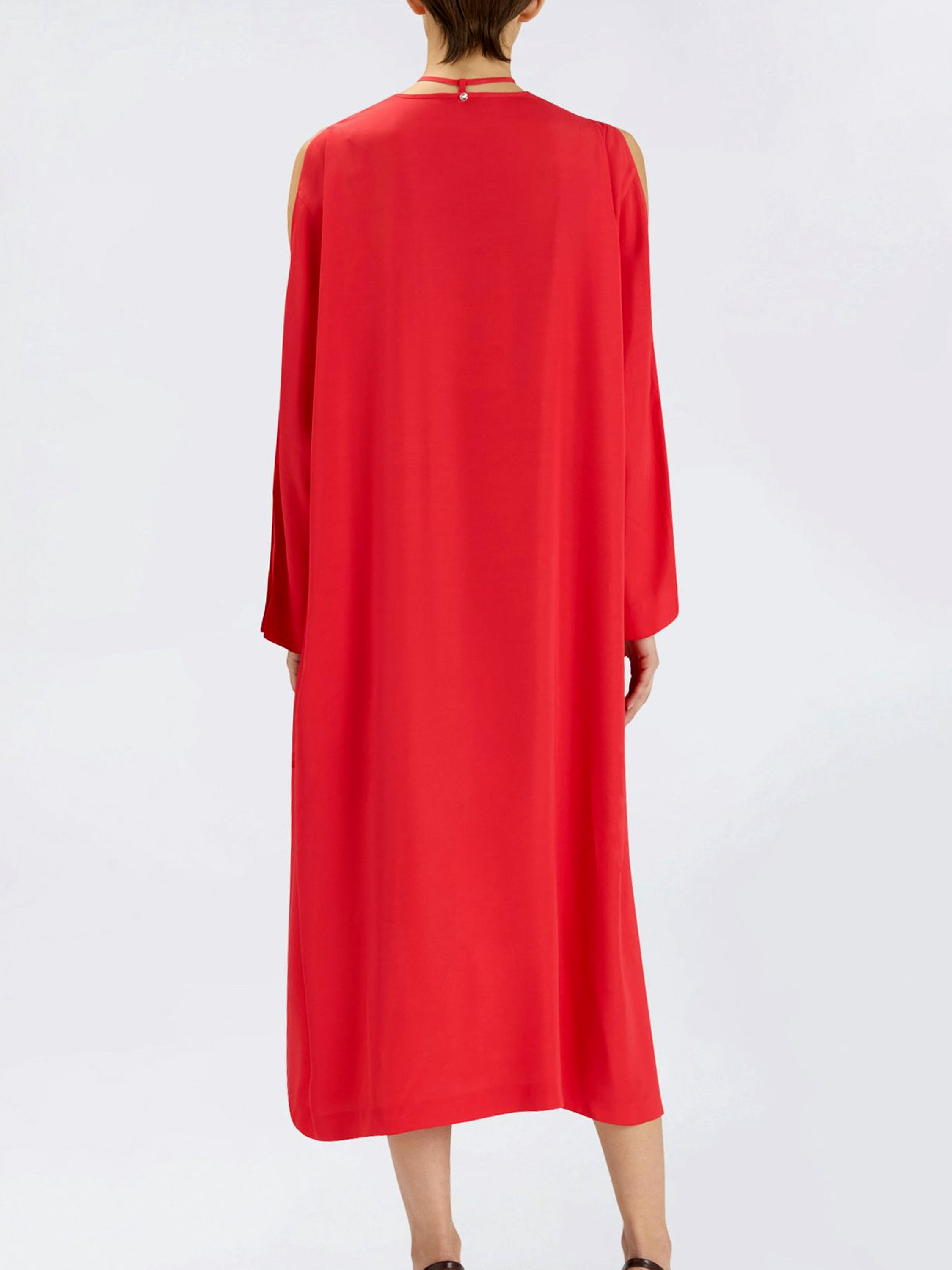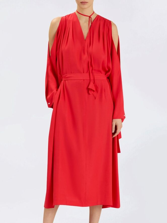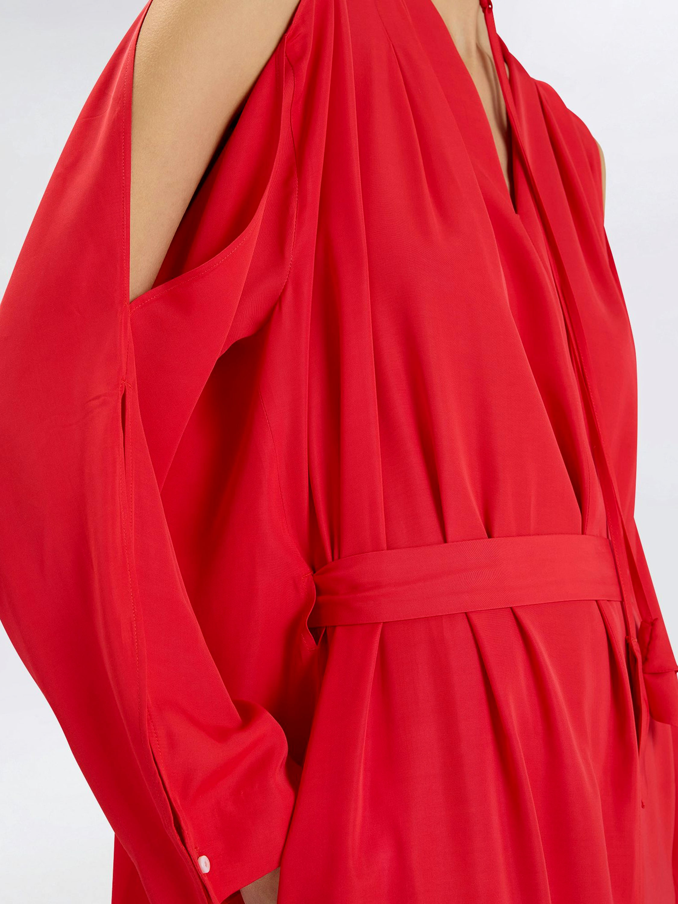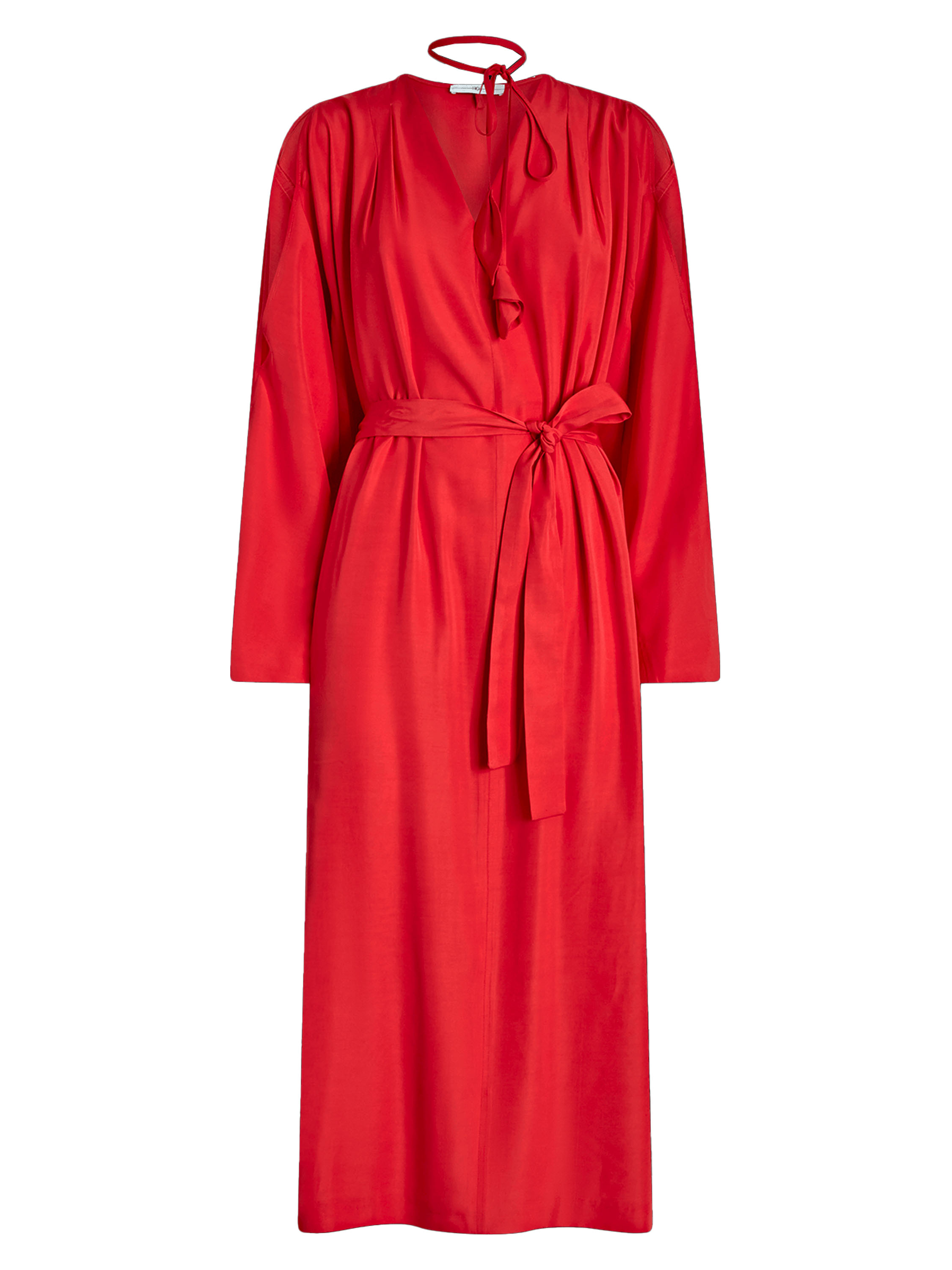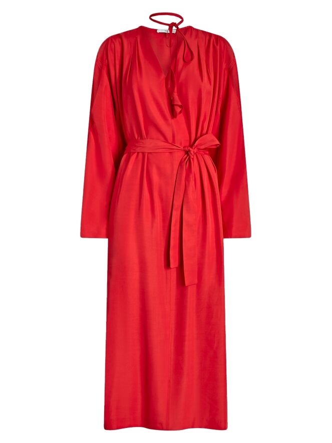 Kleid von High in einem leuchtenden Rotton. Seitlich vom V-Ausschnitt sind auf beiden Seiten jeweils zwei Falten gearbeitet, die dem Modell einen eleganten, femininen Fall verleihen. Vom Halsausschnitt verlaufen zwei lange Bänder mit dekorativen Blattenden, die einen verspielten, charakteristischen Akzent setzen. In der Taille befindet sich ein Gürtel, der seitlich nach innen geführt wird und die Silhouette dezent betont. Der obere Teil der Ärmel ist von der Schulter bis zum Ellbogen geöffnet gearbeitet. Auf Taillenhöhe sind Eingrifftaschen eingearbeitet. Dieses Kleid darf nicht gewaschen werden.