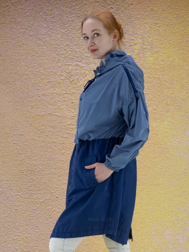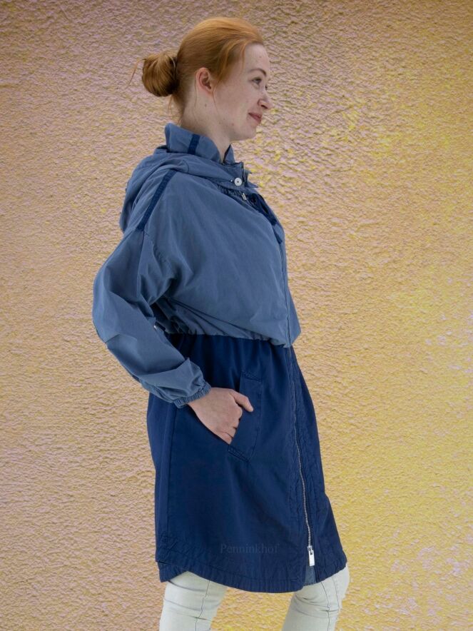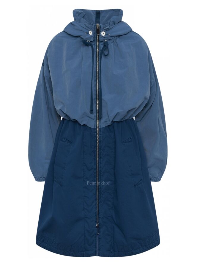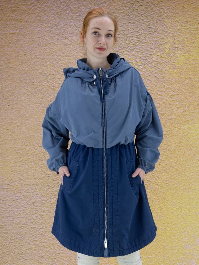 Ein halblanger Mantel der Designermarke High in zwei Blautönen. Oberhalb der Taille ist der Stoff in einem weichen, matten Blau gehalten. Unterhalb der Taille ist der Mantel kobaltblau. Die Kapuze ist abnehmbar. Auf der Oberseite der Ärmel verläuft ein Streifen, an dem das Gewebe leicht gerafft ist. Am Ärmelabschluss befindet sich ein schmaler elastischer Saum. Der Mantel hat einen silberfarbenen Reißverschluss und Eingriffstaschen. Diese Jacke sollte nicht gewaschen werden.